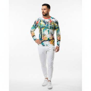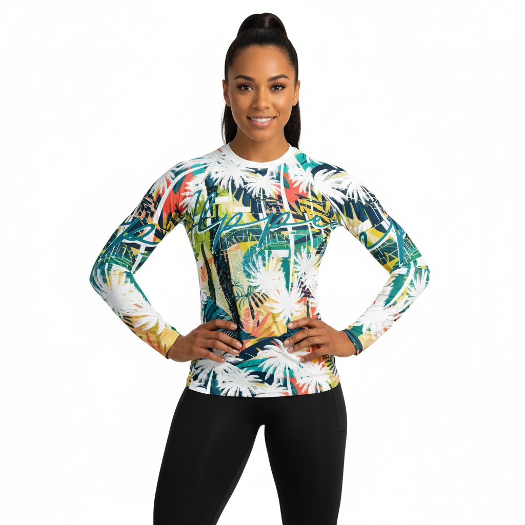 Make waves in this vibrant tropical palm print rash guard that transitions seamlessly from surf sessions to beach days to athleisure styling. The bold all-over print features dynamic palm fronds in teal, navy, coral, yellow, and white—a statement piece that stands out whether you're catching waves or catching eyes.