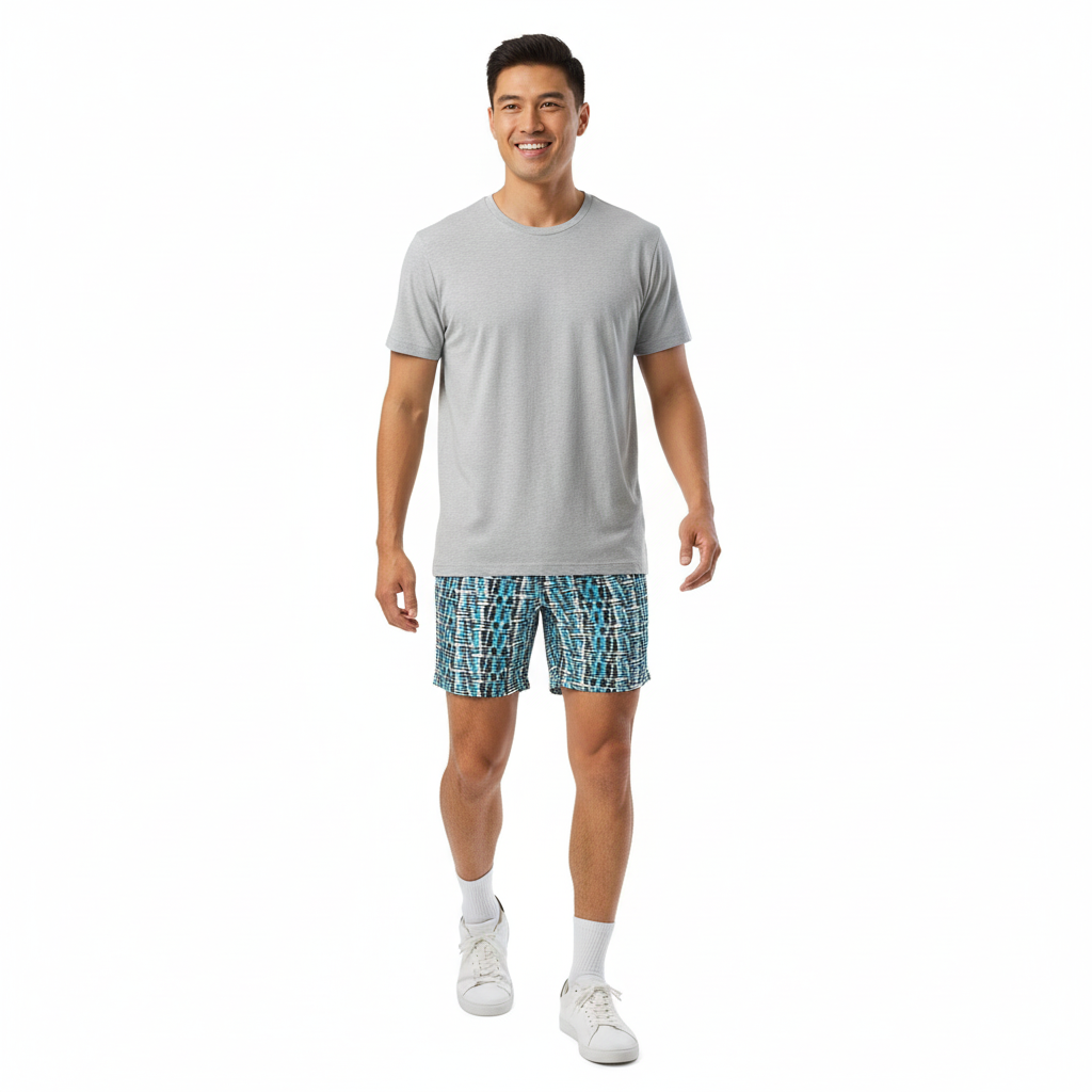 WaveCrasher swim trunks bring bold geometric energy to every beach day with their striking white and turquoise pattern. Crafted from recycled materials, these eco-conscious swim trunks prove you don't have to choose between performance, style, and sustainability—you can have it all.