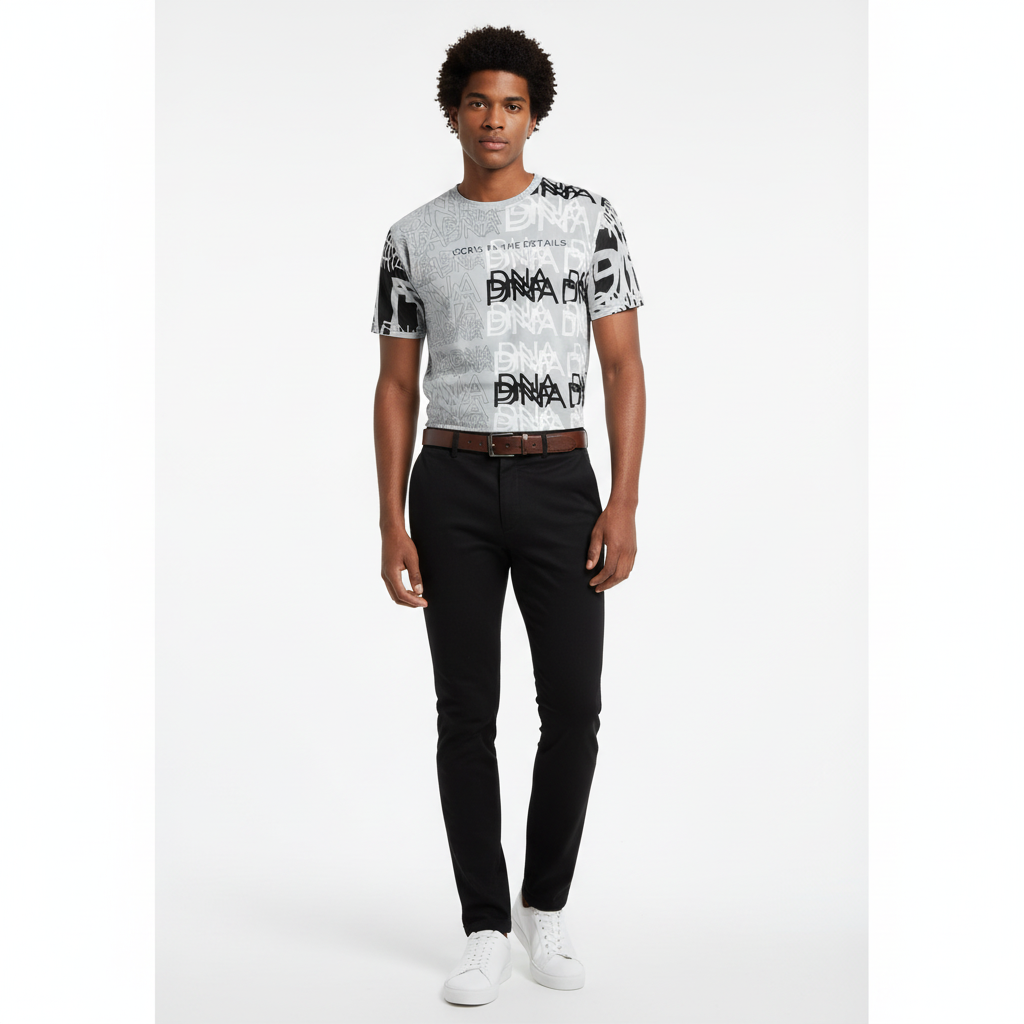 Elevate with black slim-fit chinos and minimalist white sneakers for versatile everyday wear.