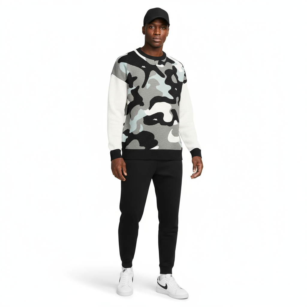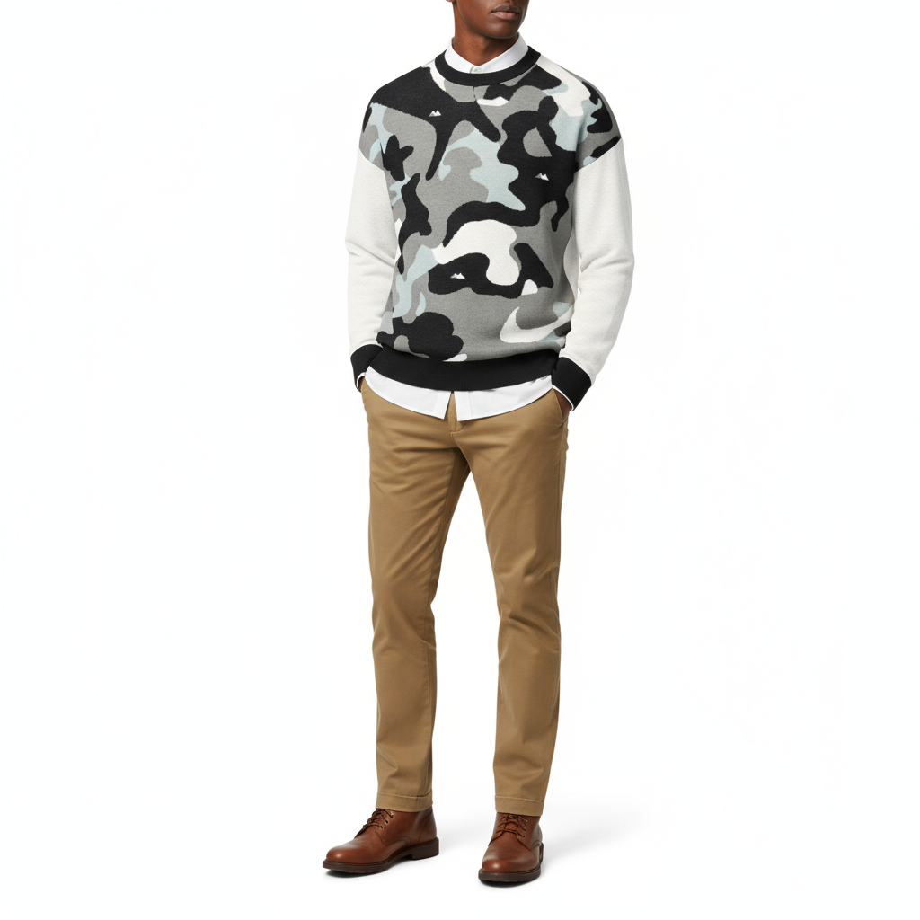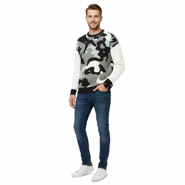 Embrace cozy comfort with a rugged edge in this Camo Relaxed Fit Knitted Crew Neck Sweater. Combining the timeless appeal of a classic crew neck with a bold camo pattern, this sweater is perfect for outdoor enthusiasts who value both style and comfort.