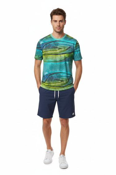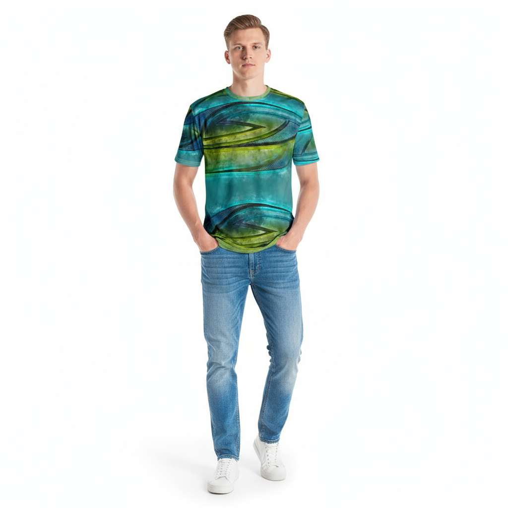 The Surfxion Men's t-shirt captures the essence of surf culture with its dynamic turquoise, green, and navy geometric wave pattern. Designed for those who live for the ocean and embrace the carefree coastal lifestyle, this crew neck tee combines bold artistic design with premium comfort that takes you from beach to boardwalk and beyond.