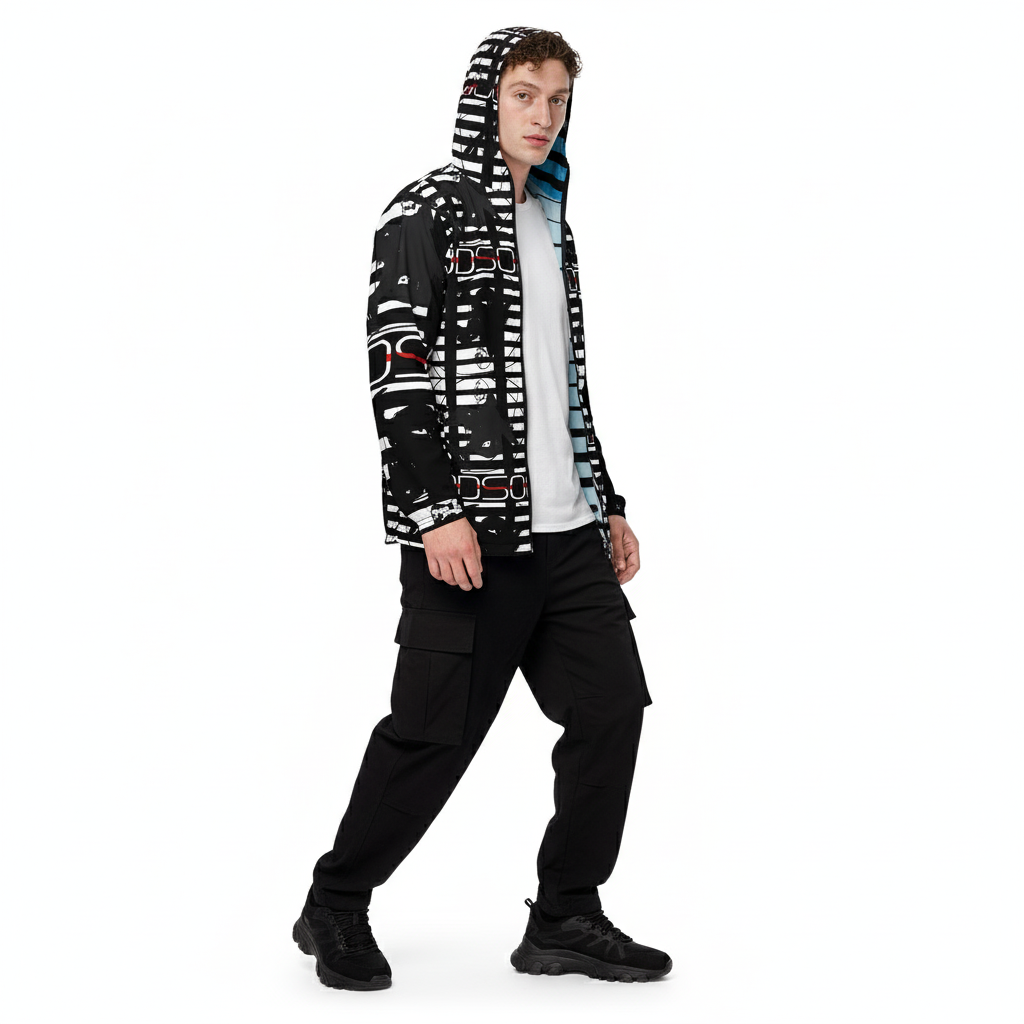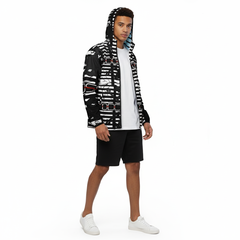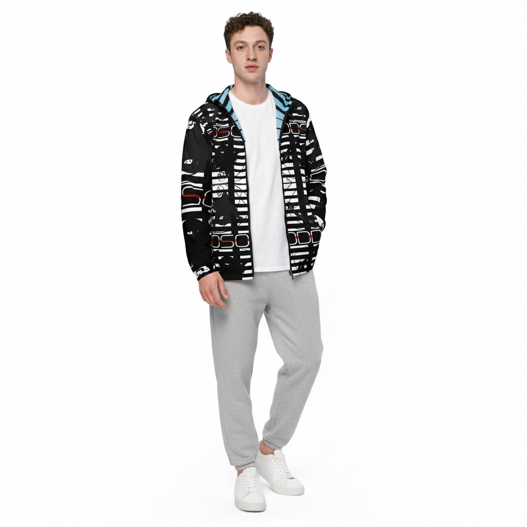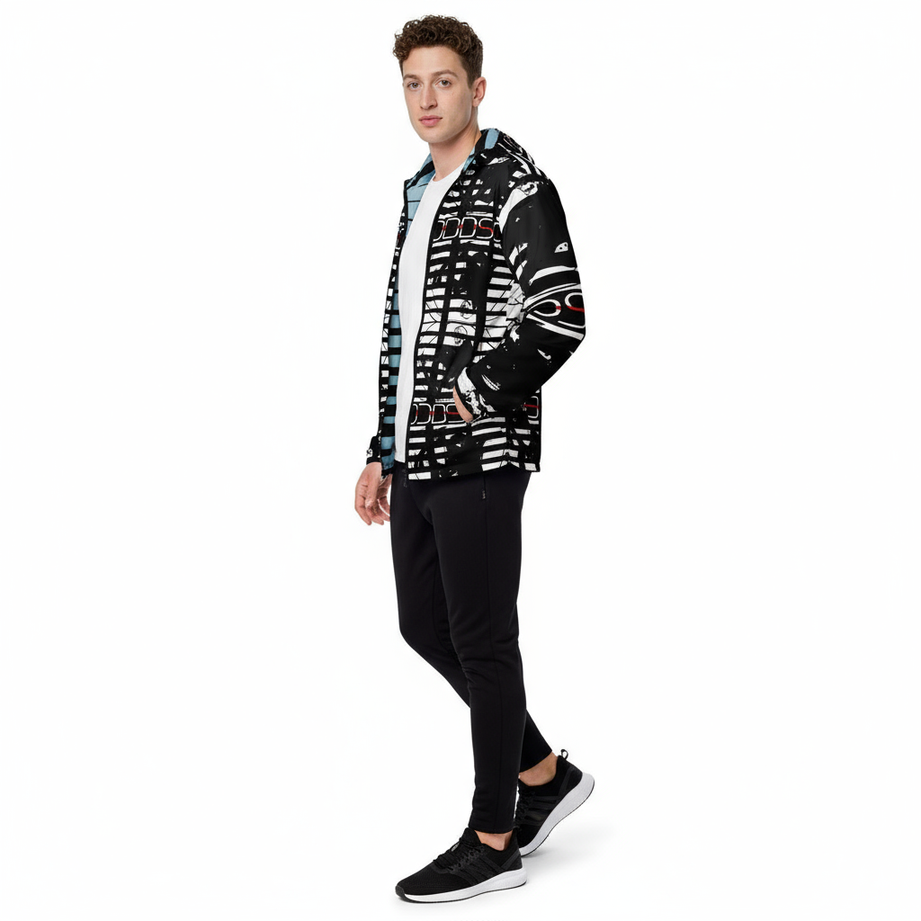 The Alley-Loop Men's Windbreaker features a bold black and white abstract pattern that makes a statement wherever you go. This lightweight, water-resistant jacket combines eye-catching design with functional performance, featuring a full-zip closure, adjustable hood, and breathable construction for all-day comfort.
