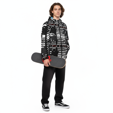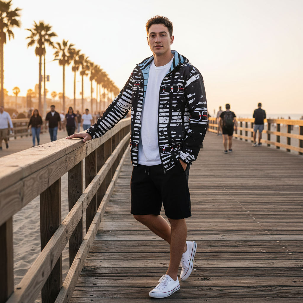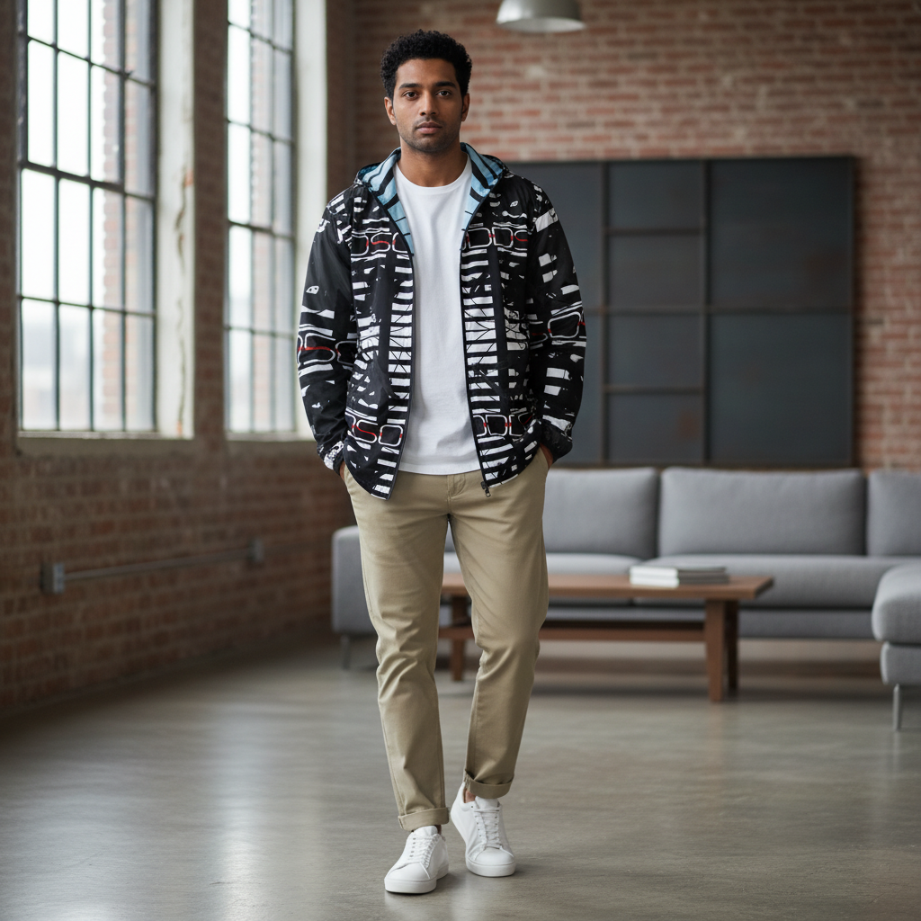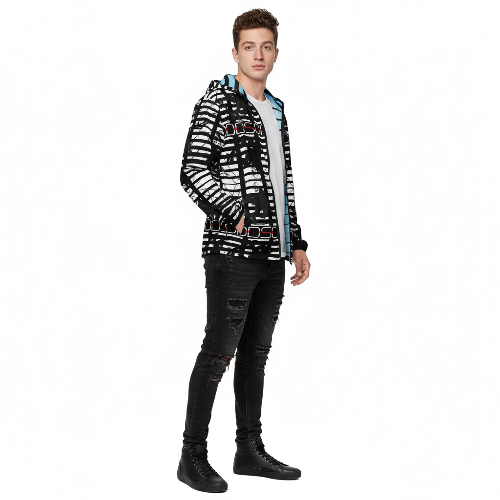 The Alley-Loop Men's Windbreaker features a bold black and white abstract pattern that makes a statement wherever you go. This lightweight, water-resistant jacket combines eye-catching design with functional performance, featuring a full-zip closure, adjustable hood, and breathable construction for all-day comfort.