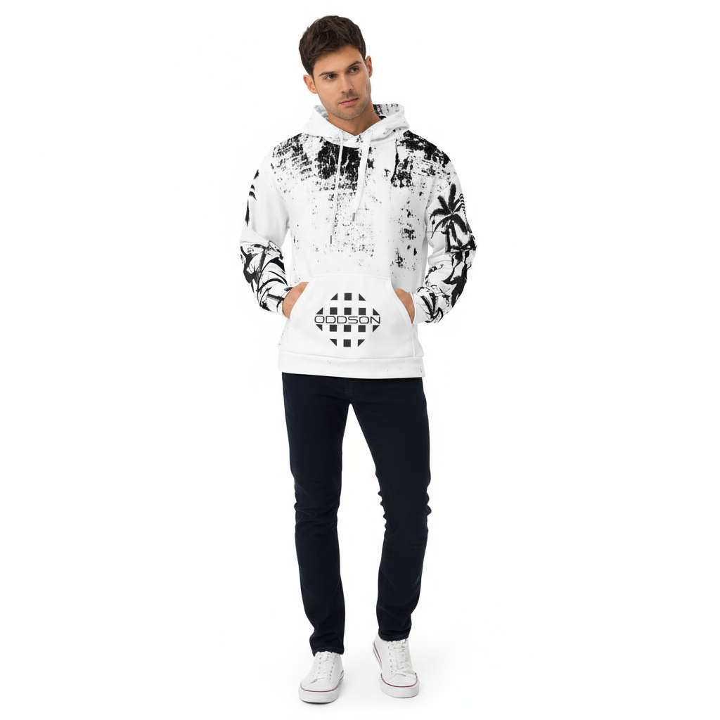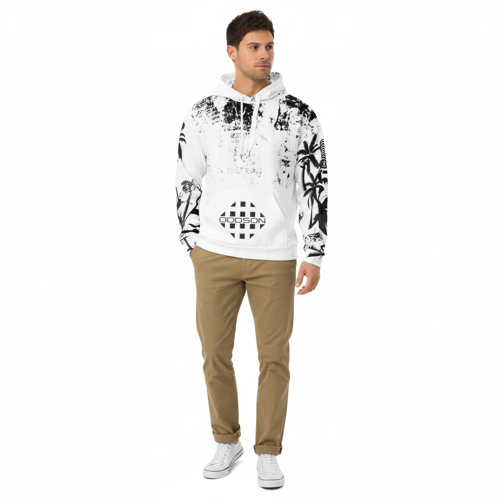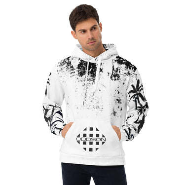 Make a bold statement with the Oddson-Anchor Hoodie, featuring an exclusive all-over print that blends tropical palm trees, nautical anchors, and edgy skull graphics in striking black and white. This premium recycled hoodie is where coastal vibes meet urban edge.