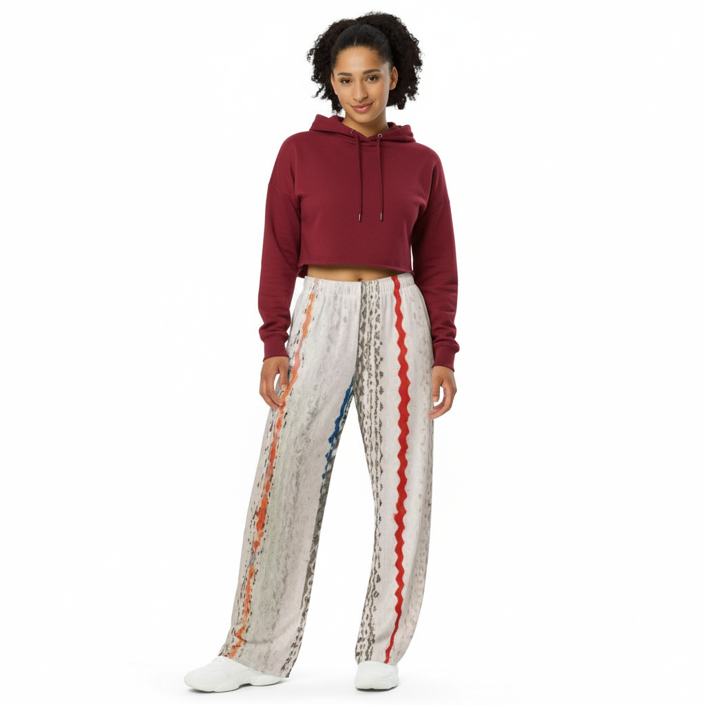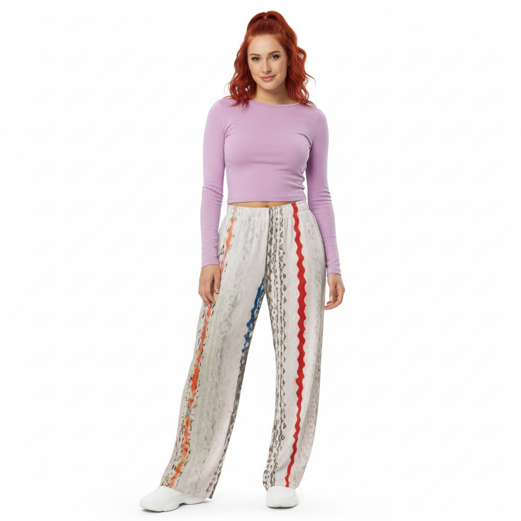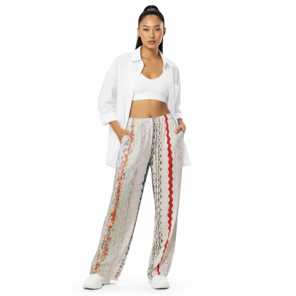 Featuring an eye-catching pattern of red, orange, grey, and black vertical stripes with organic, hand-painted textures, these unisex pants bring gallery-worthy style to your everyday wardrobe. The flowing wide-leg silhouette offers unrestricted movement and contemporary edge, while the soft fabric ensures all-day comfort.