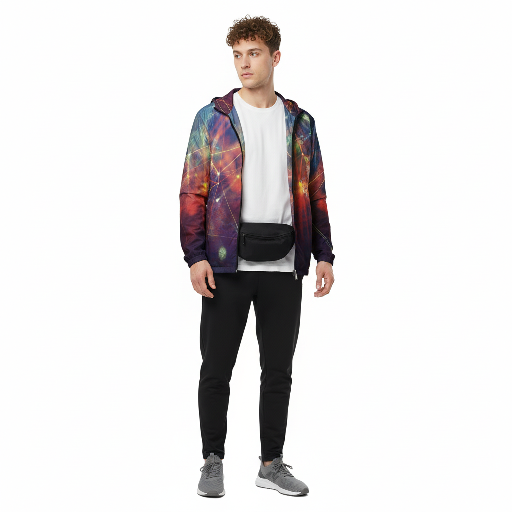 The Orignis Men's Windbreaker transforms outerwear into wearable art. Featuring a stunning all-over cosmic galaxy print with vibrant nebula clouds, electric lightning streaks, and celestial energy bursts, this jacket makes an unforgettable statement while keeping you protected from the elements.