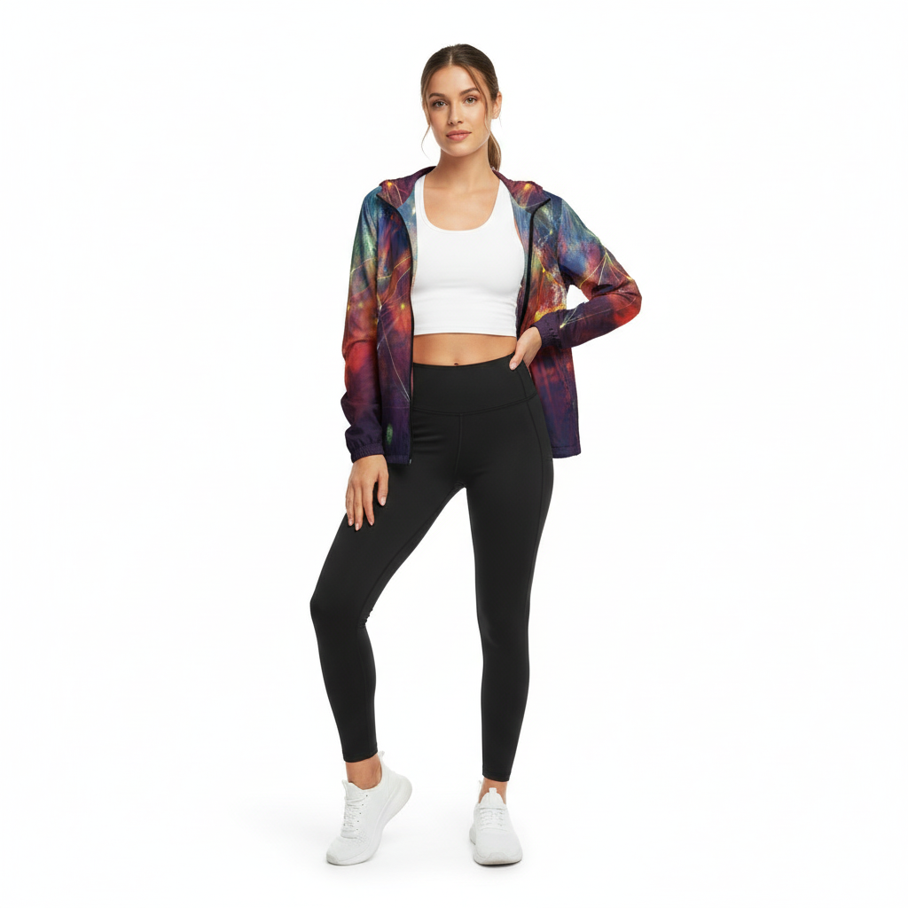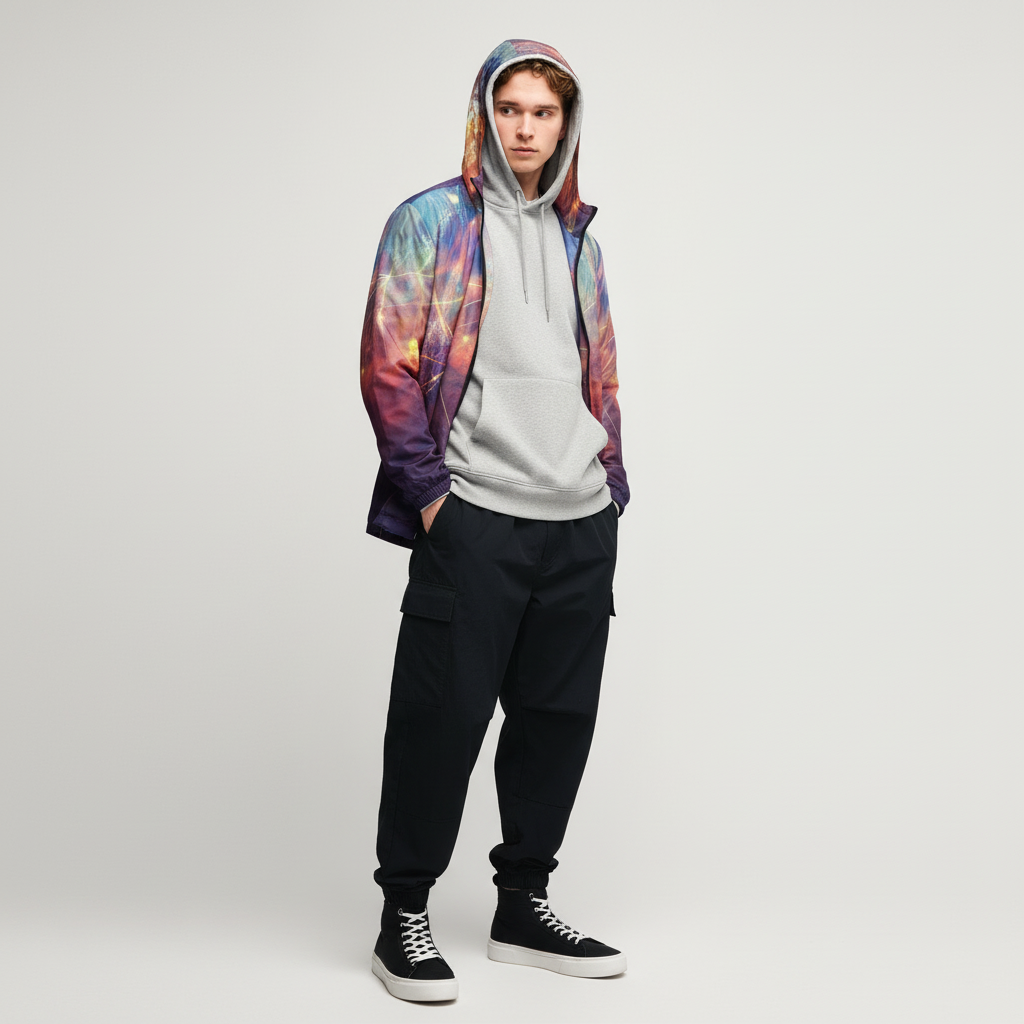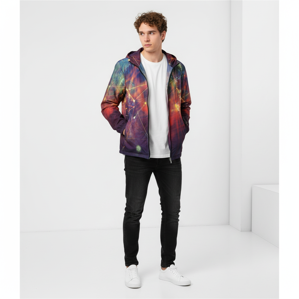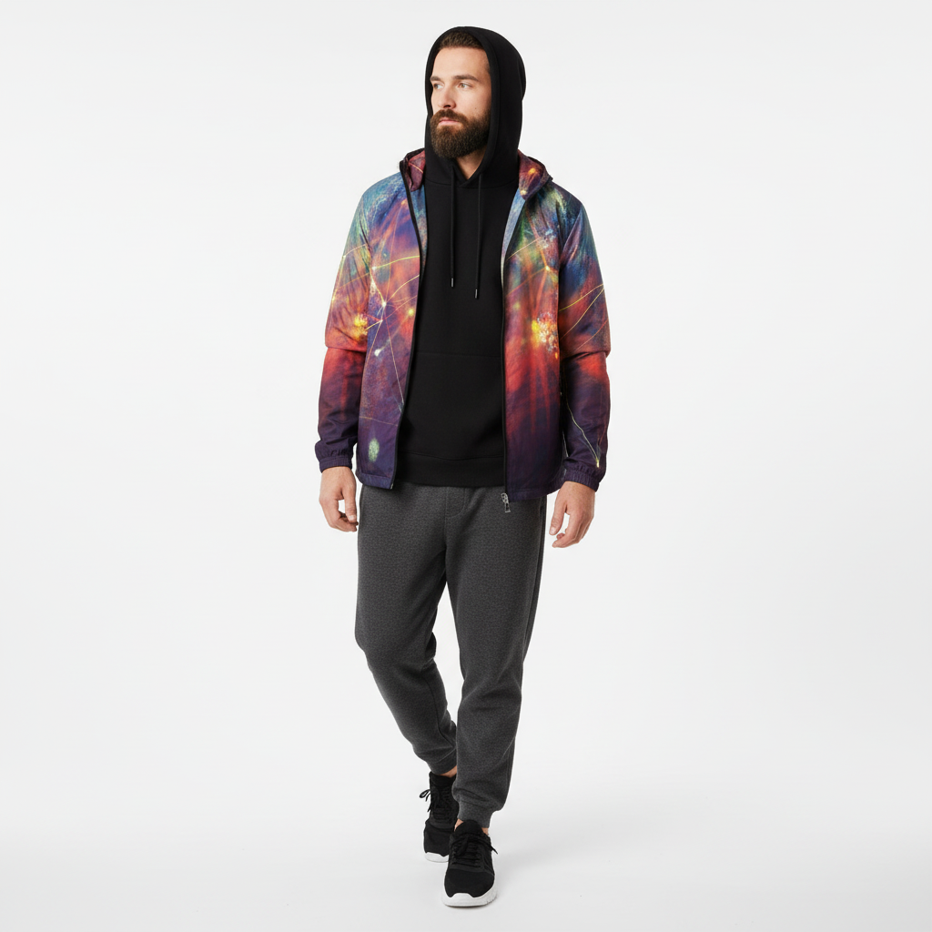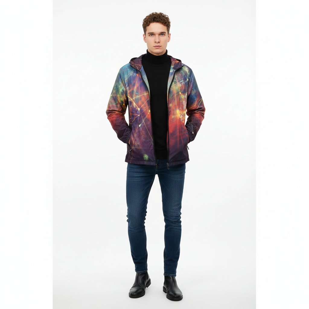 Whether you're navigating city streets, hitting the trails, or making a statement at festivals and events, this windbreaker adapts to your lifestyle. The eye-catching cosmic print pairs effortlessly with neutral basics, letting you create bold looks that turn heads. Layer it over hoodies for extra warmth or wear it solo with a simple tee for maximum impact.