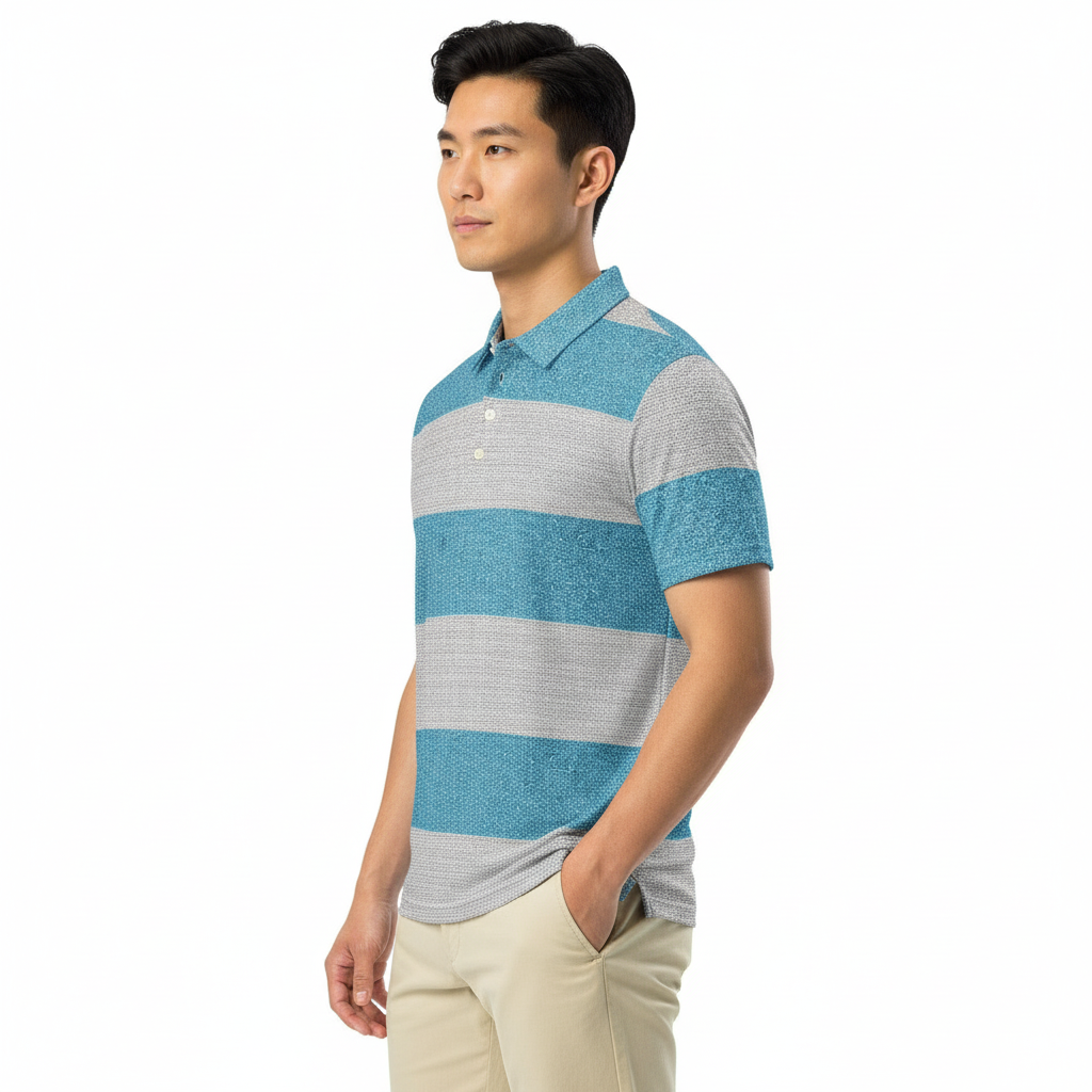 Alppeer's Striped Men's Slim Fit Polo combines classic sophistication with modern comfort. Featuring bold teal and grey horizontal stripes, this premium polo transitions seamlessly from beach days to urban streets.