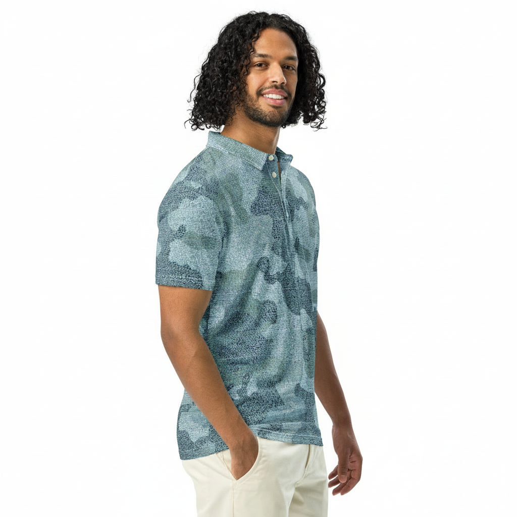 - All-Over Blue Tide Camo Print – Stunning aqua and teal camouflage design inspired by ocean waves covers the entire polo