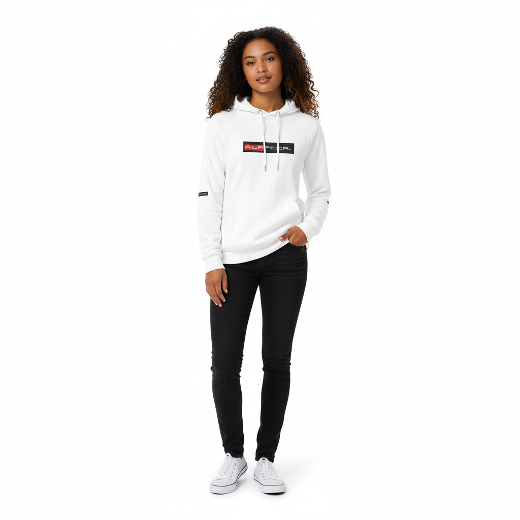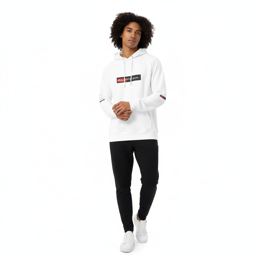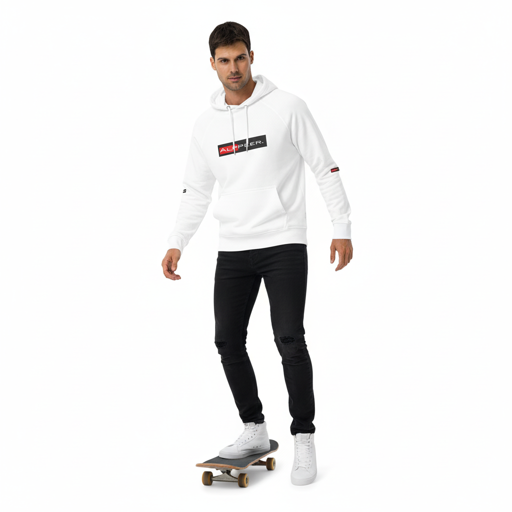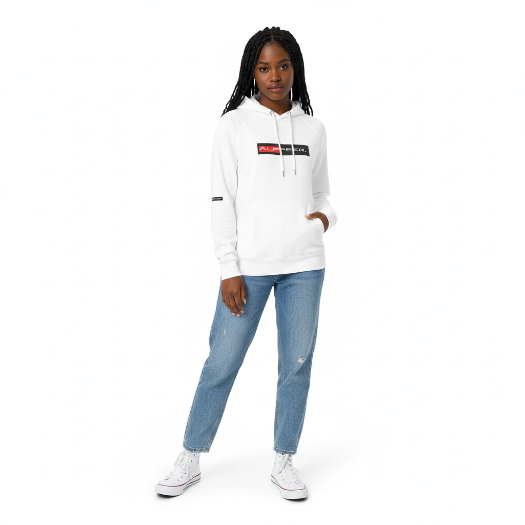 The Alppeer eco raglan hoodie combines conscious design with bold branding. Featuring the signature red and black ALPPEER logo box on a clean white base, this eco-friendly hoodie is your go-to piece for everything from casual weekends to active days.