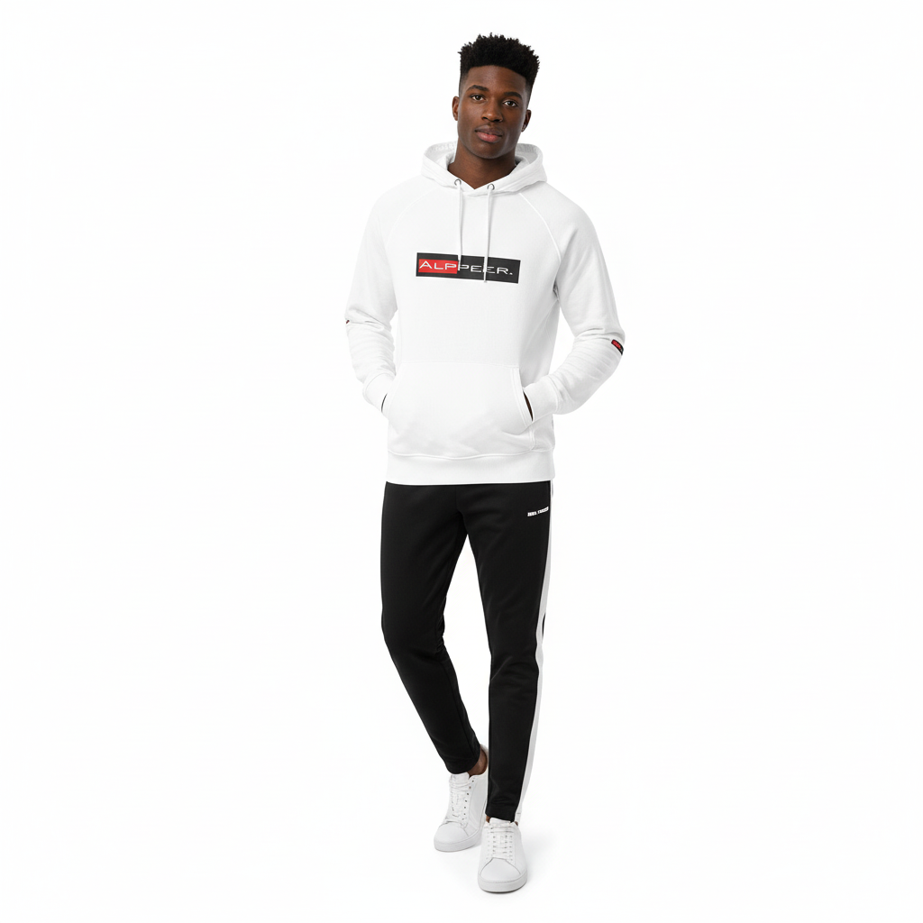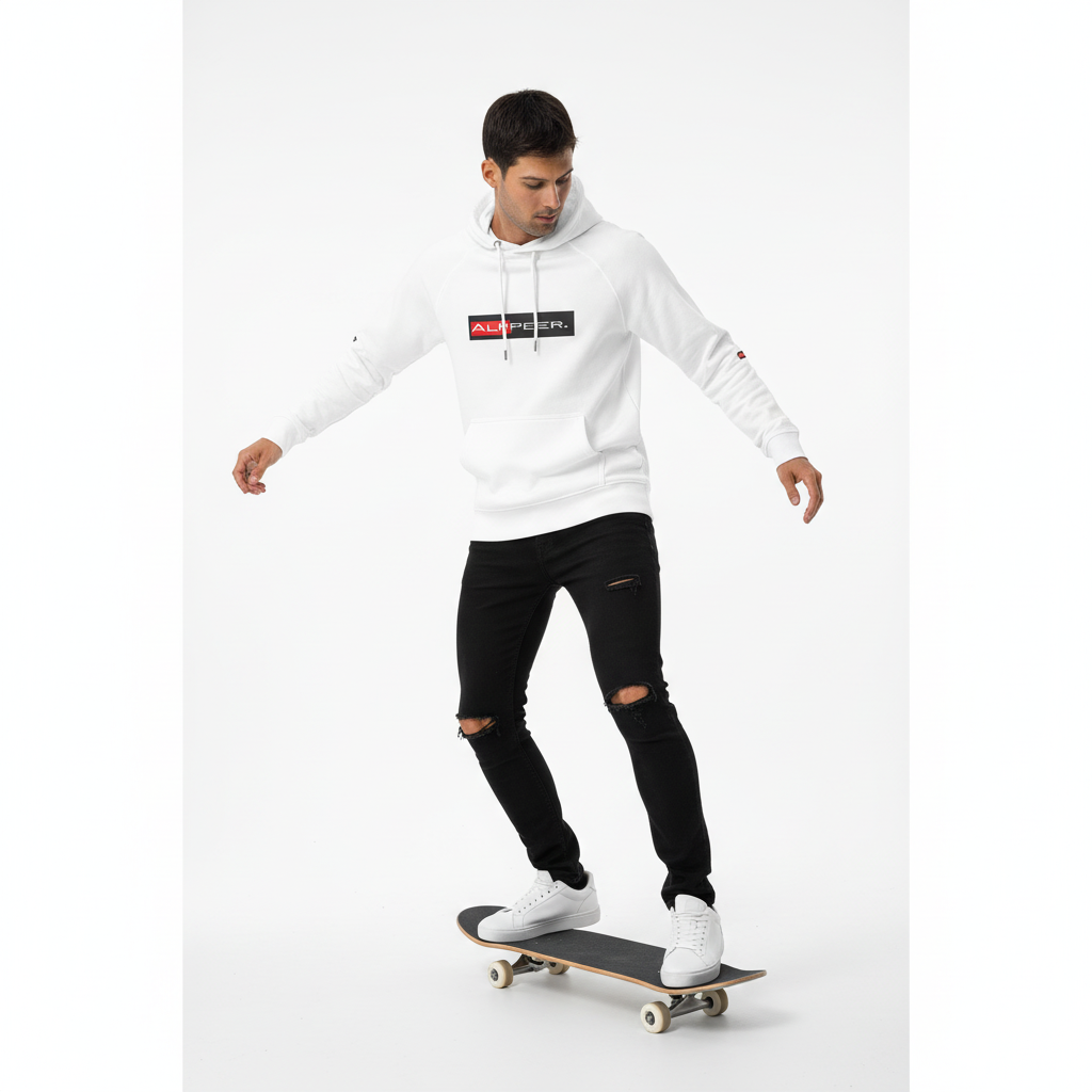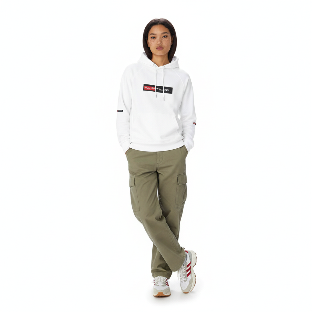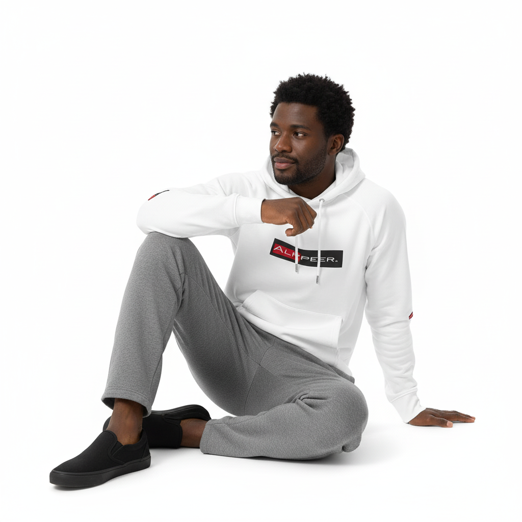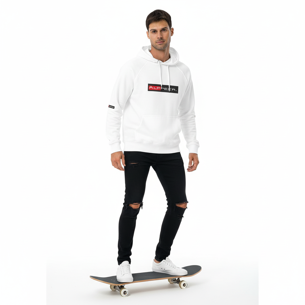 The Alppeer eco raglan hoodie combines conscious design with bold branding. Featuring the signature red and black ALPPEER logo box on a clean white base, this eco-friendly hoodie is your go-to piece for everything from casual weekends to active days.