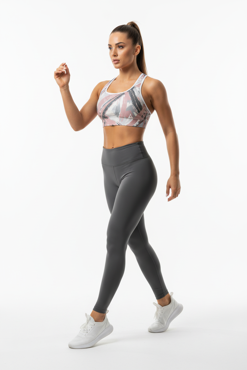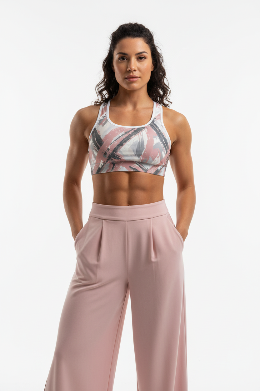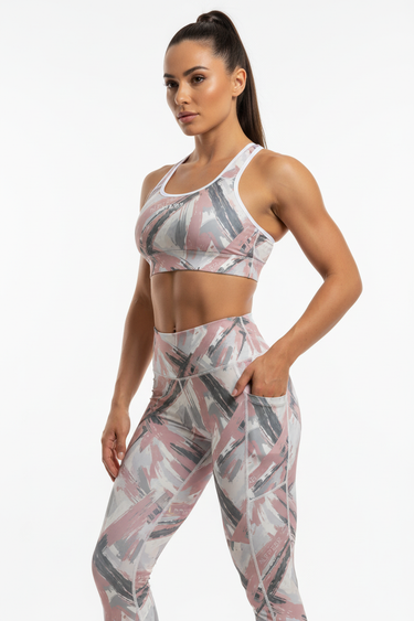 Elevate your activewear with the Brushstroke Sports Bra in blush and charcoal. This premium padded sports bra features an exclusive abstract brushstroke pattern that transitions seamlessly from studio to street.