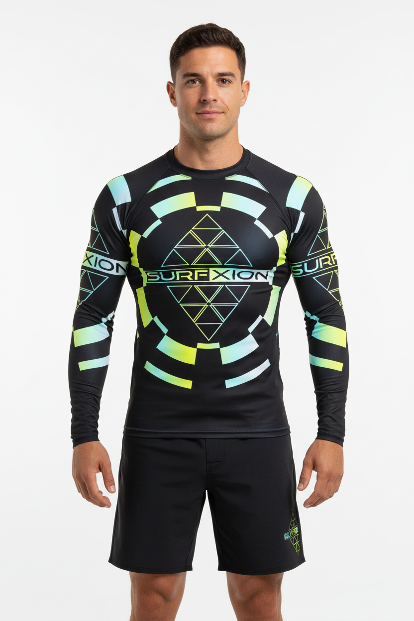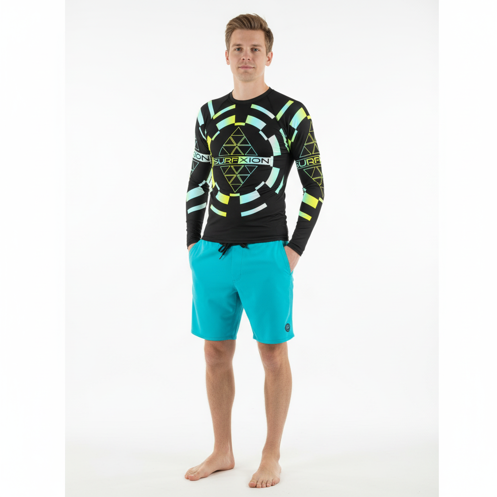The Surfxion-Hana Hou Men's Rash Guard makes a powerful statement with its striking black base and vibrant turquoise and yellow geometric design. Featuring the iconic Surfxion logo and triangular patterns, this long-sleeve rash guard combines eye-catching street-style aesthetics with UPF 50+ sun protection for those who demand both performance and bold visual impact.