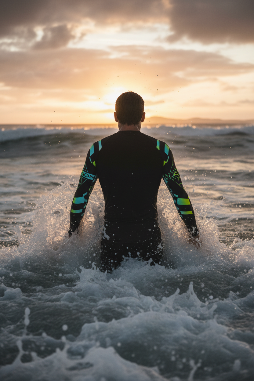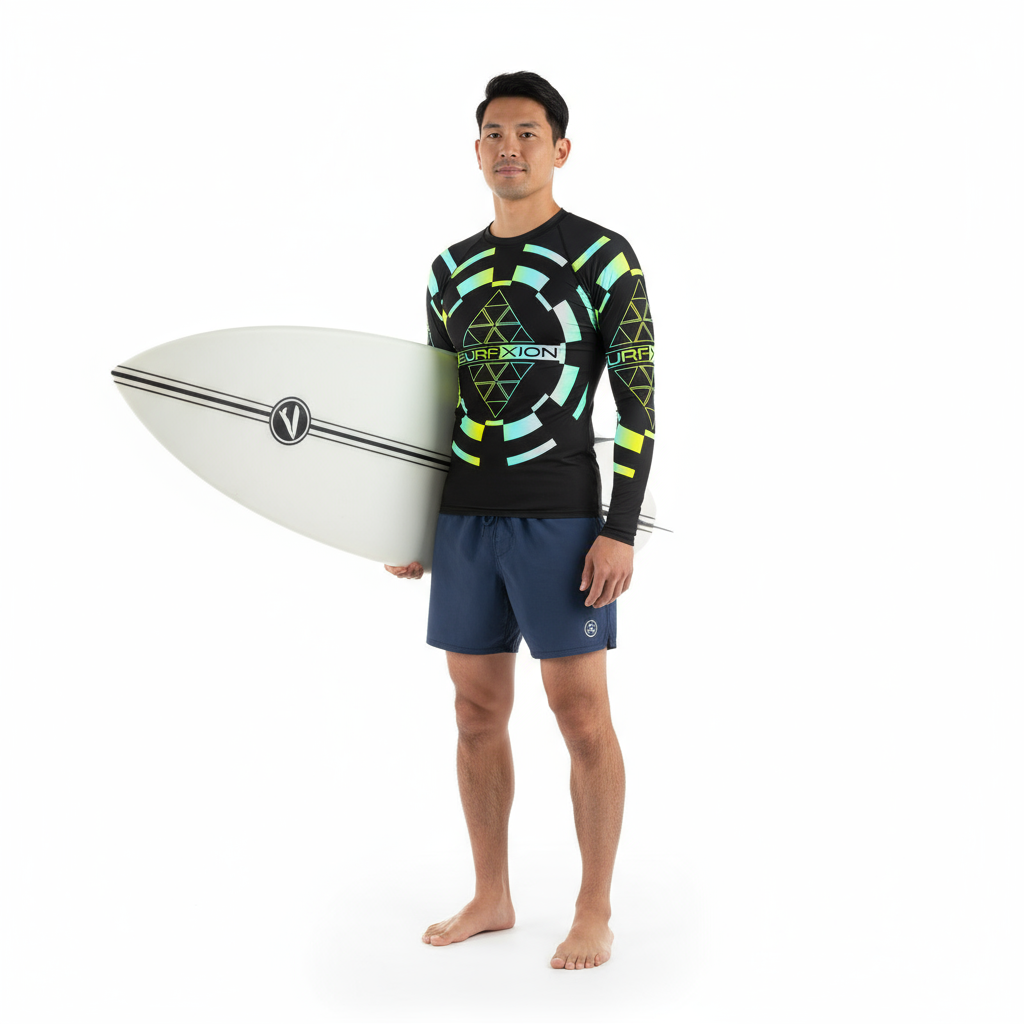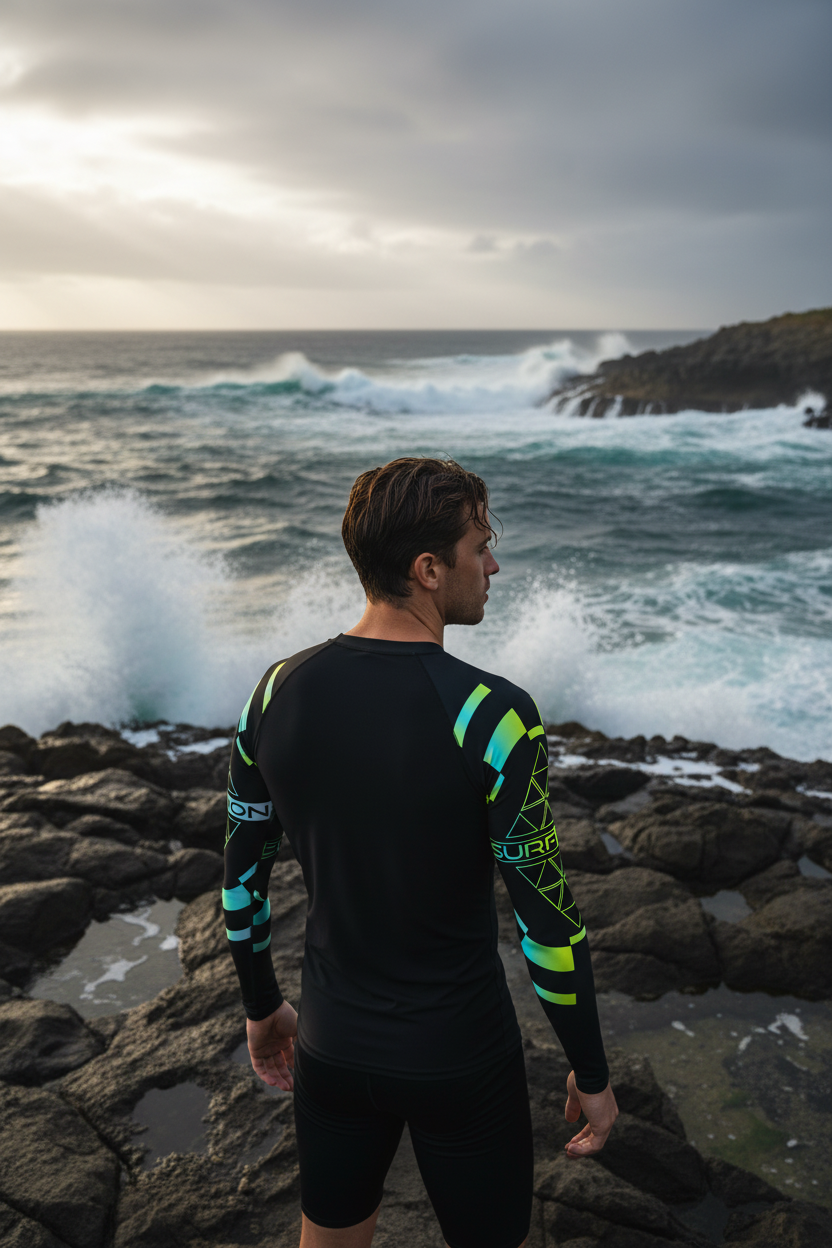 This rash guard transitions seamlessly from water sports to urban streetwear. Pair it with turquoise board shorts for coordinated surf style, black athletic shorts for sleek performance, yellow board shorts for bold contrast, or charcoal joggers for post-session comfort. The striking geometric design makes this piece a standout whether you're catching waves or catching eyes on the street.