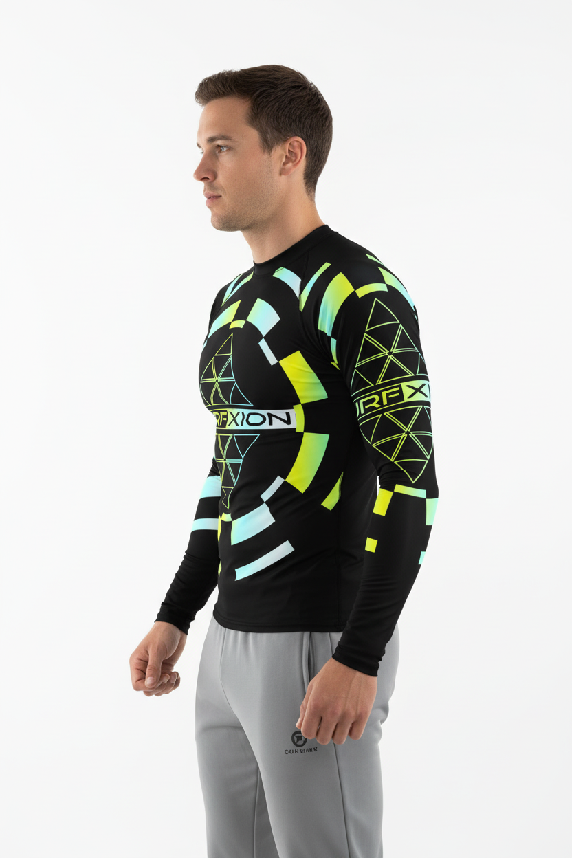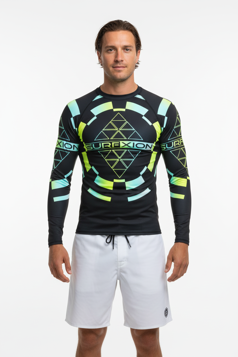 Whether you're carving waves, paddleboarding through the afternoon, or training on the beach, this rash guard delivers superior sun protection and comfort. The dramatic geometric pattern with neon accents ensures you stand out in the lineup while the technical fabric keeps you protected and performing at your peak.