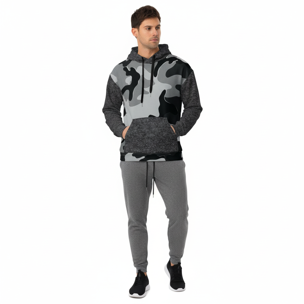 • All-over camo print – Bold pattern with textured contrast sleeves