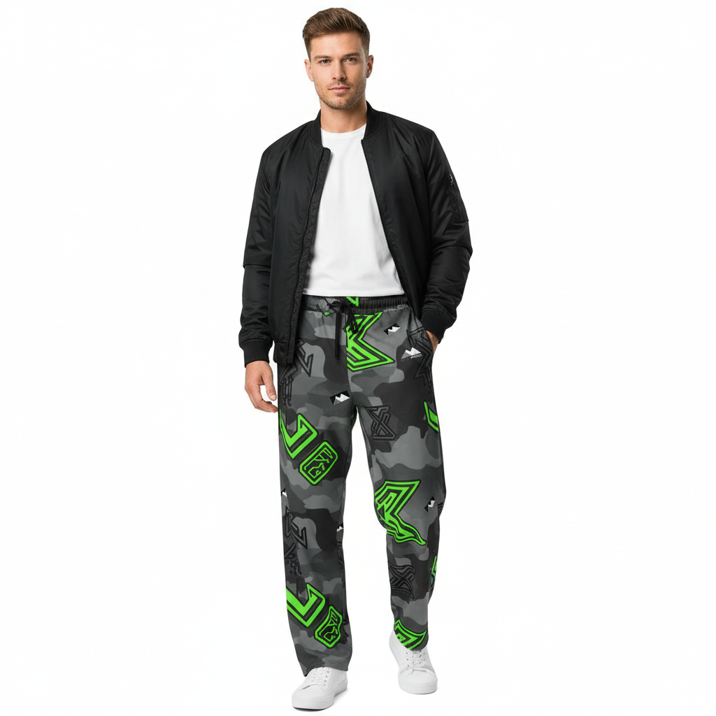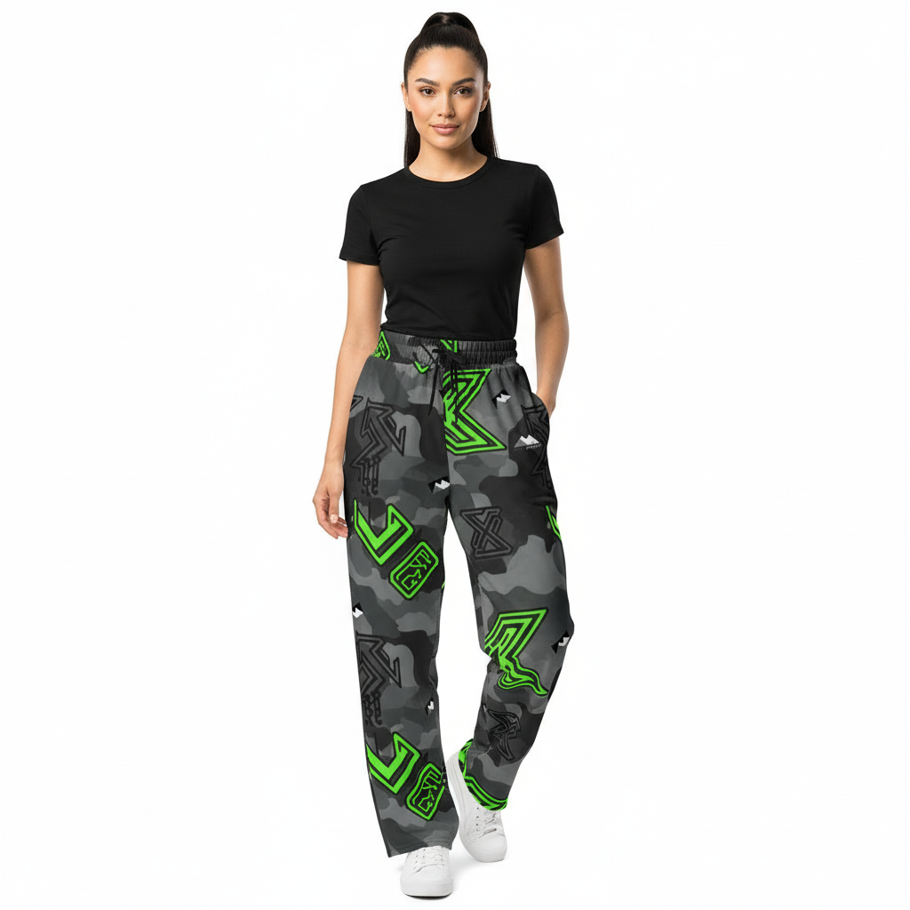 The Alppeer Neon Camo Wide Leg Joggers are designed for those who refuse to blend in. Featuring a striking dark grey camouflage base with vibrant neon green geometric graphics and subtle Alppeer branding, these joggers deliver bold visual impact with unbeatable comfort. The relaxed wide-leg silhouette offers a modern streetwear aesthetic that's both comfortable and statement-making.
