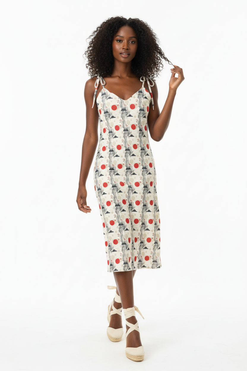The Bamboo Moon Slip Dress brings traditional Japanese artistry to your warm-weather wardrobe. Featuring a striking pattern of bamboo stalks and bold red moons on a cream background, this elegant slip dress combines Eastern minimalism with a flattering silhouette perfect for summer days, resort getaways, or casual evenings.
