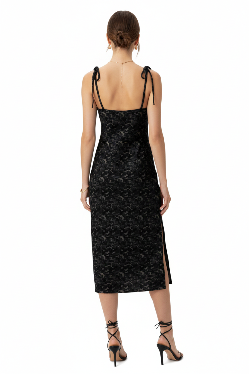 Step into the night with this stunning Midnight Camo Slip Dress, where dark sophistication meets effortless elegance. The mysterious black camouflage print creates a subtle, shadowy pattern that's both edgy and refined—perfect for those who want to make a statement without saying a word.