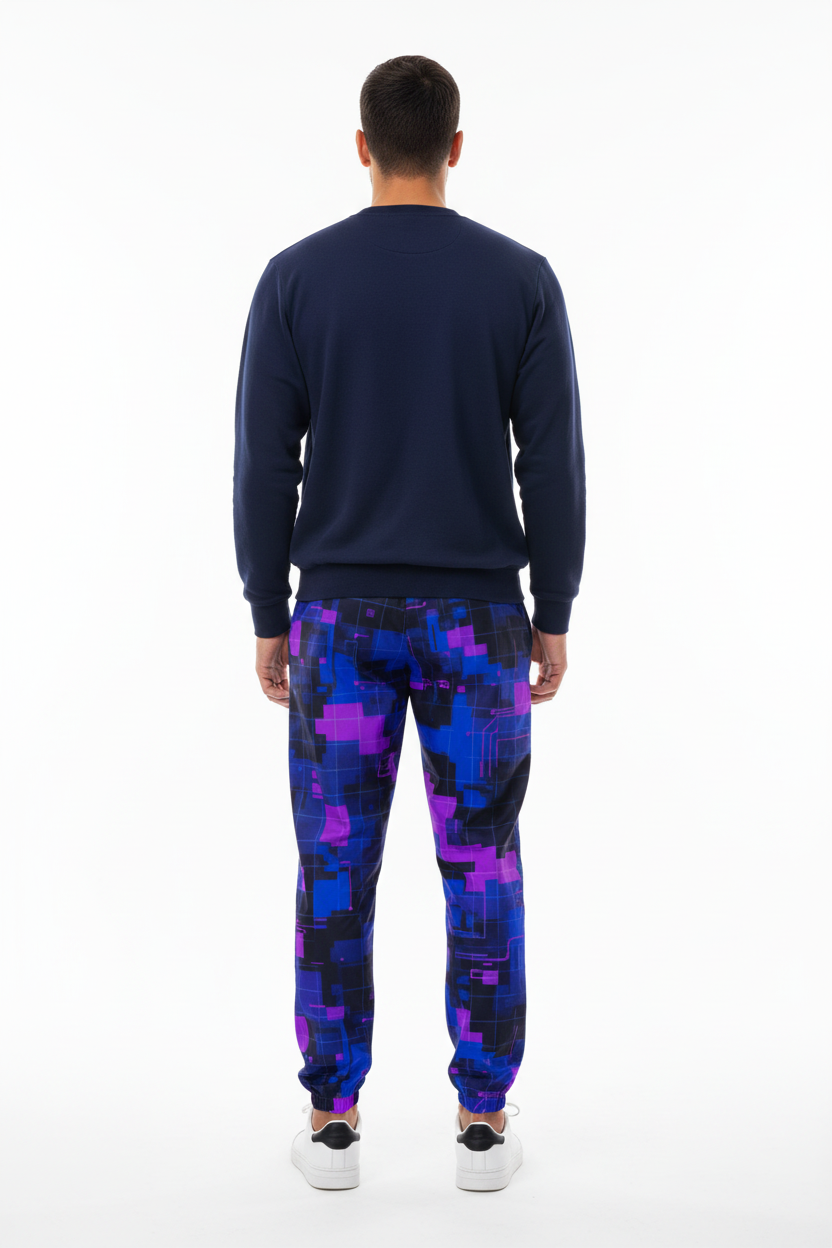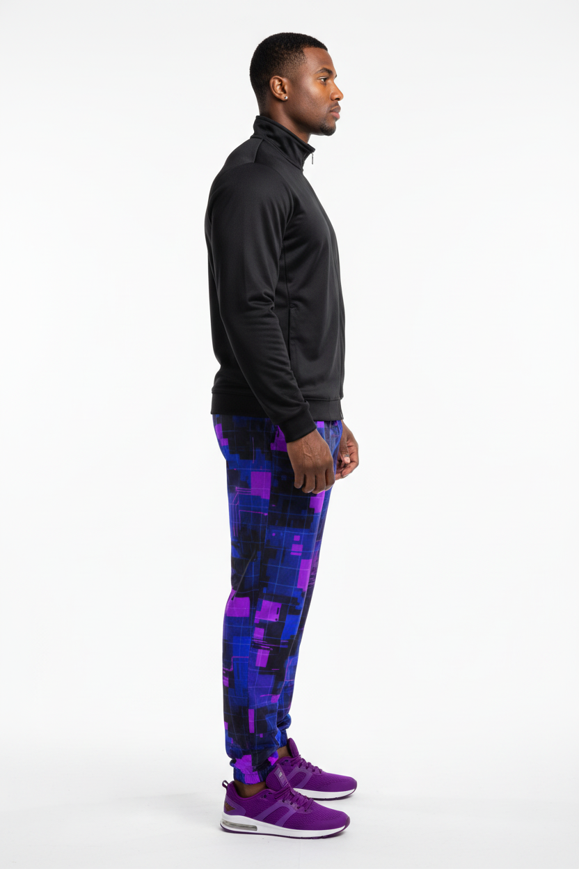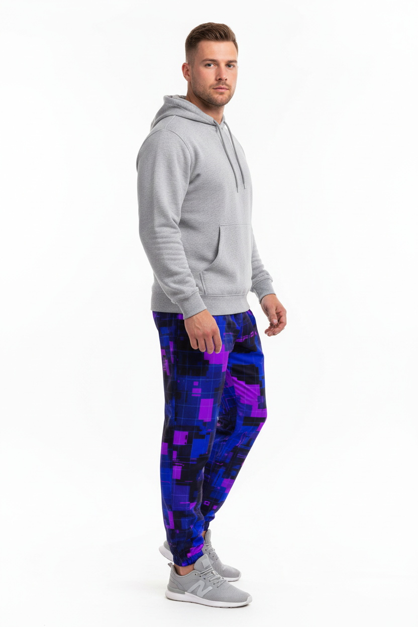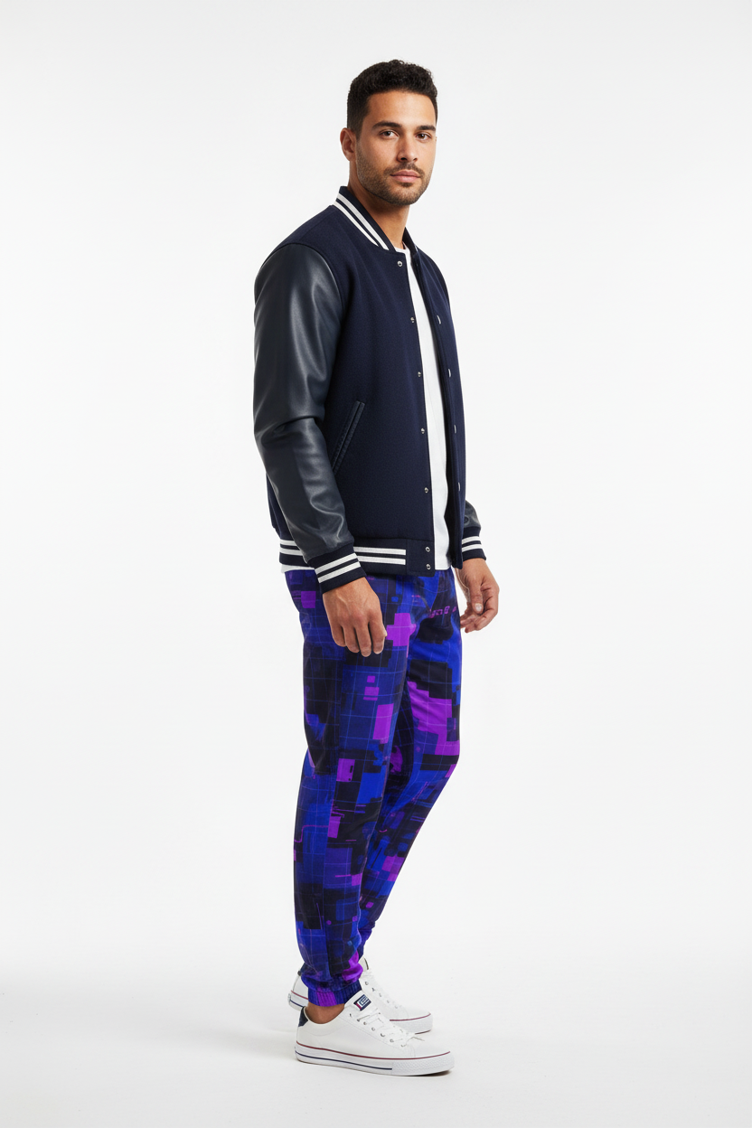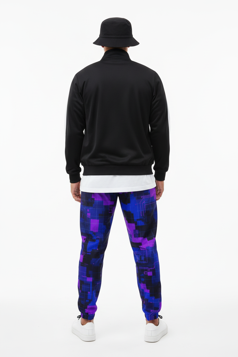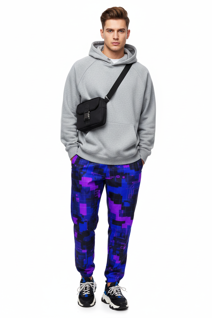 Make a bold statement with these eye-catching digital camo track pants featuring an electric blue and purple pixel print. Designed for the modern urban explorer who demands both style and performance, these pants seamlessly transition from street to studio.