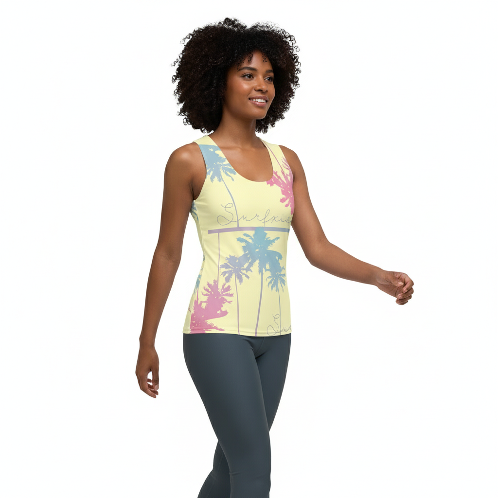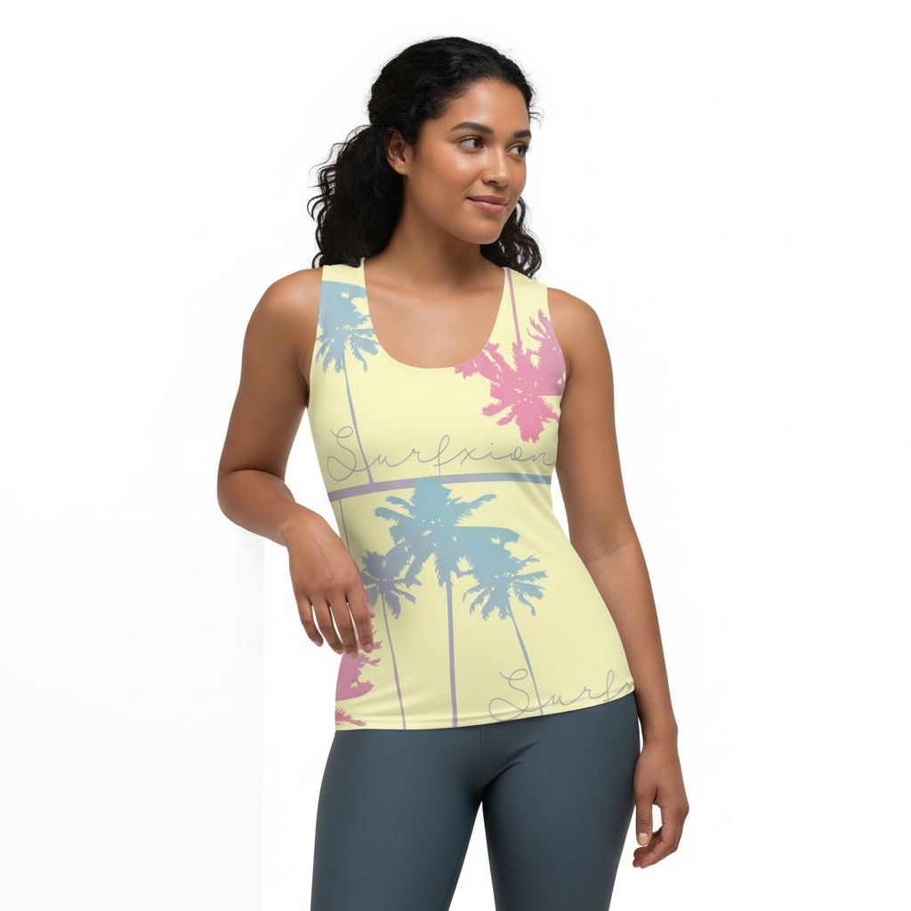 Brighten your summer wardrobe with the 3-Palms Reflection Women's Tank Top. This vibrant piece features a dreamy pastel yellow background adorned with artistic pink and blue palm tree silhouettes, creating a playful tropical aesthetic that captures the essence of sunny days and beach vibes.
