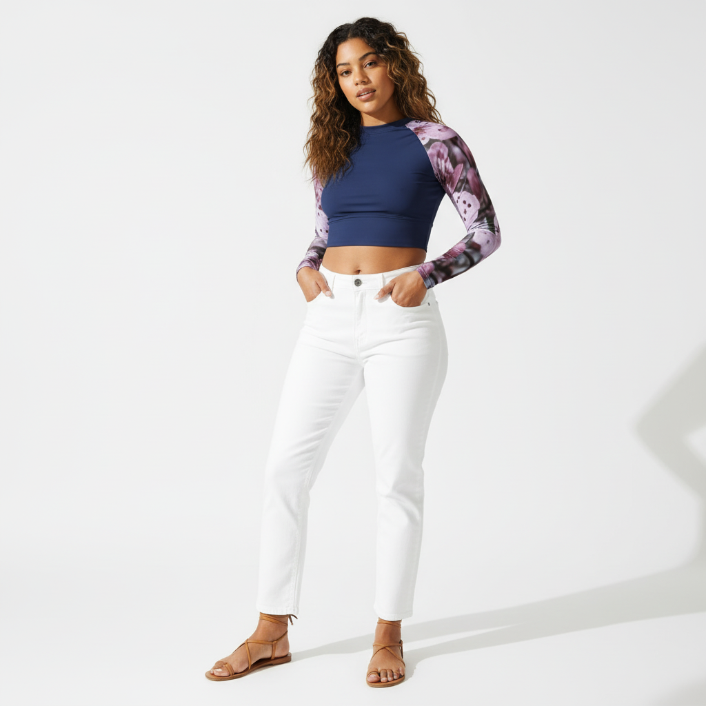 Turn heads with the Camri Long-Sleeve Crop Top – where sustainable style meets versatile design. Featuring a striking navy body with gorgeous purple floral print sleeves, this eco-friendly crop top is crafted from recycled materials and designed to take you from beach to street to studio.