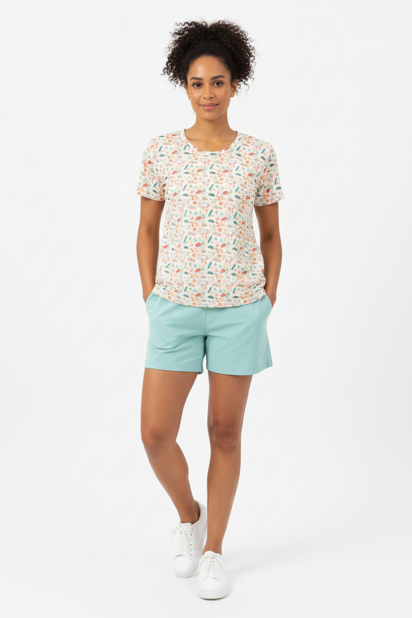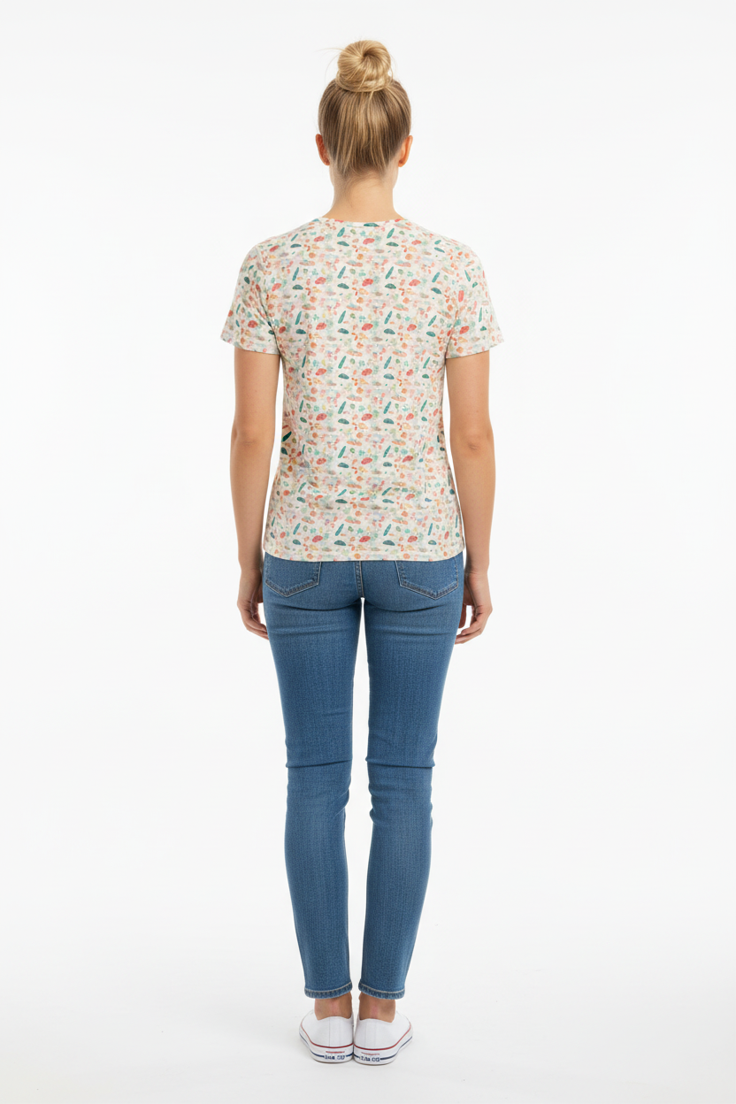 Bring coastal charm to your everyday wardrobe with this playful beach-themed cotton tee featuring a whimsical pattern of surfboards, starfish, and ocean motifs in soft coral, teal, and cream tones. Designed for comfort and effortless style, this premium cotton crew neck is perfect for beach days, casual outings, or channeling those vacation vibes year-round.