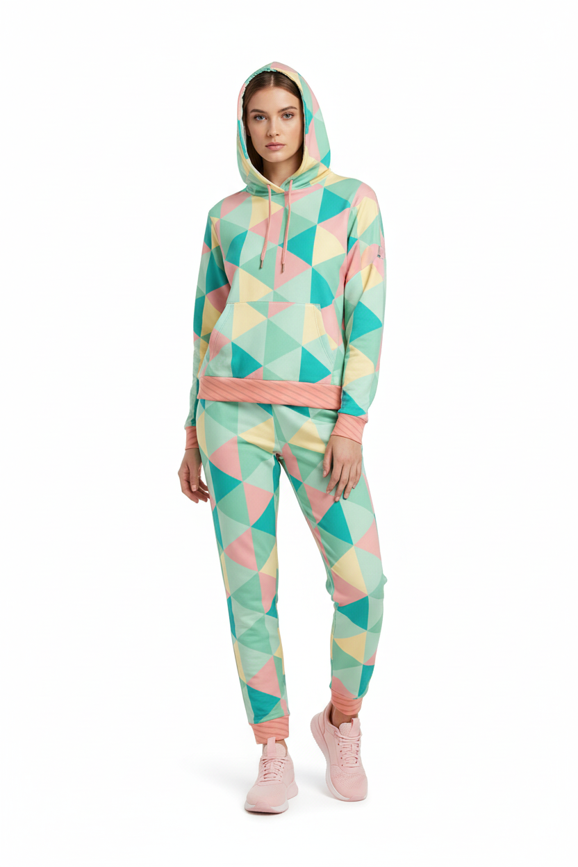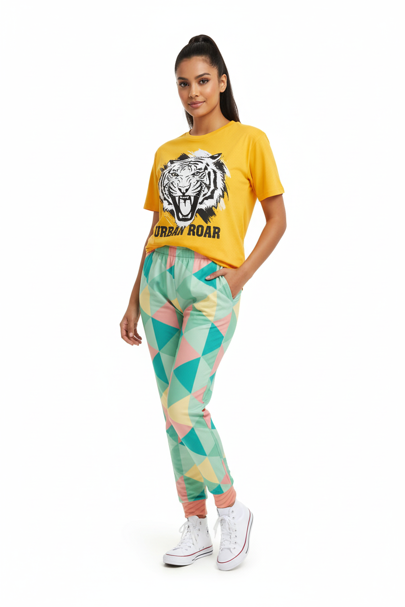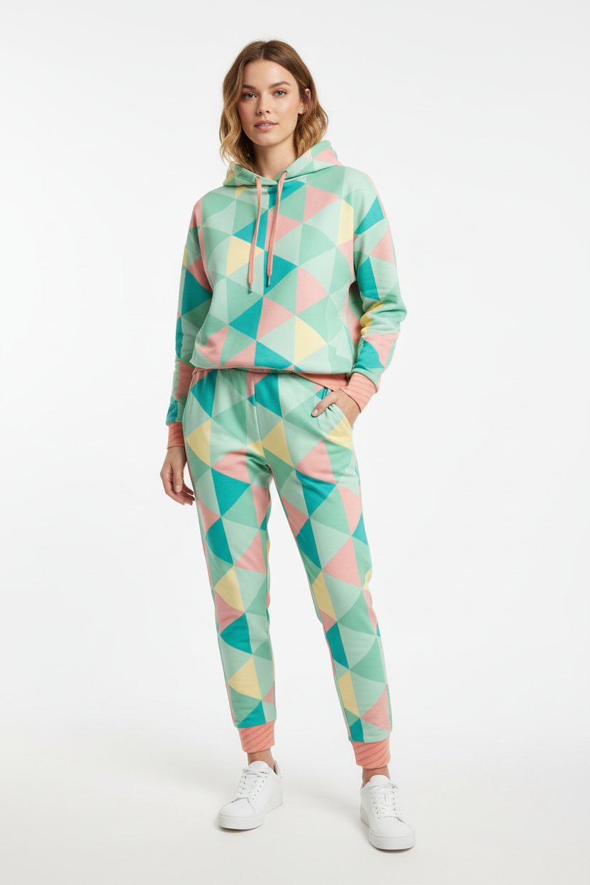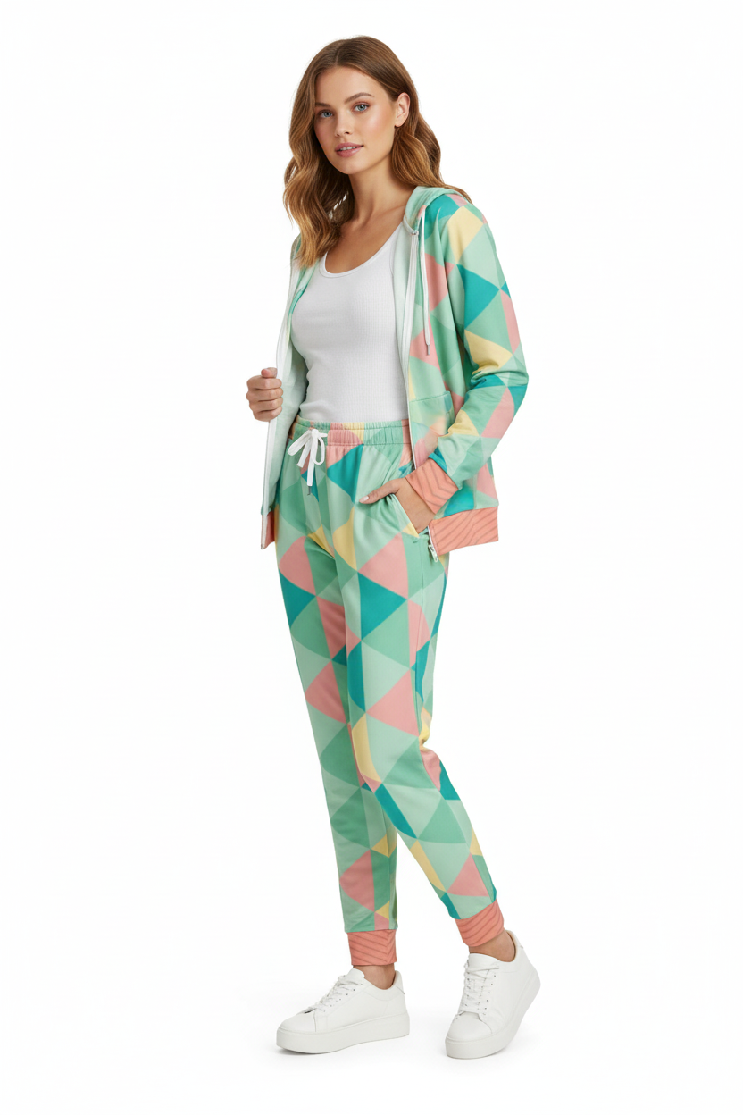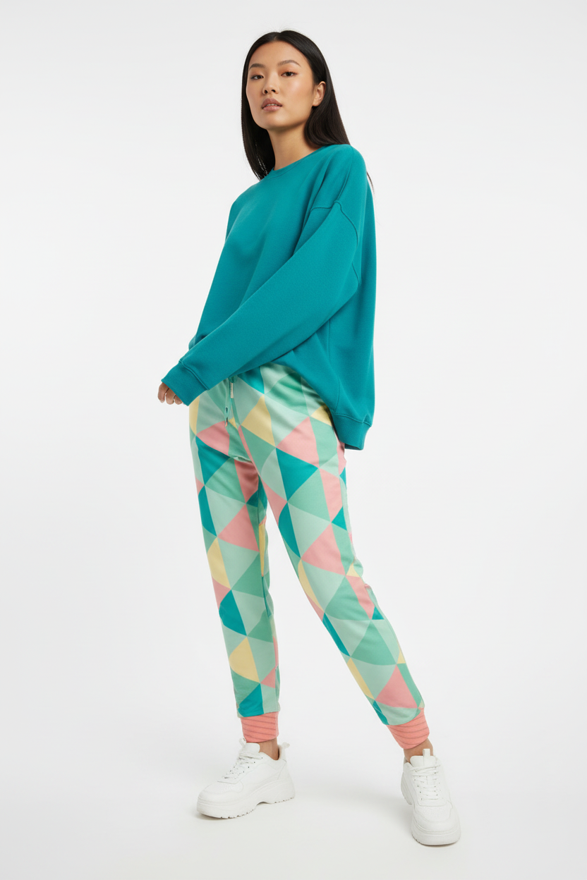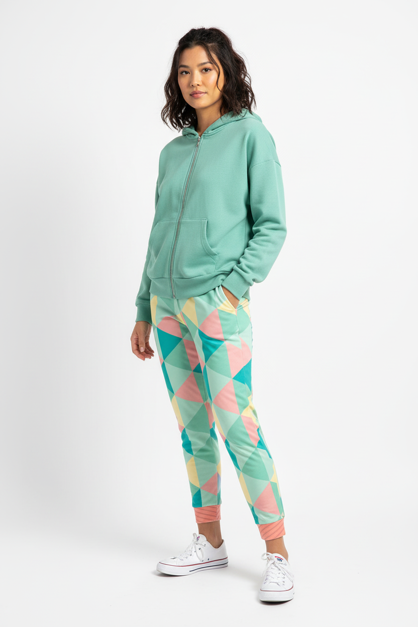 Make a statement in motion. These recycled joggers feature a vibrant geometric triangle pattern in soft pastels—teal, pink, mint, and butter yellow—that brings energy to your everyday rotation. Designed for comfort and versatility, they transition effortlessly from lounging to running errands to casual outings.