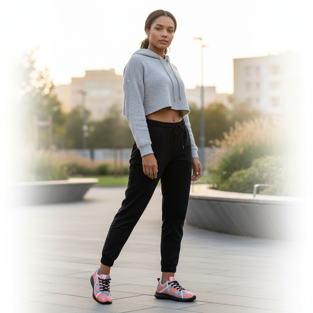Sporty Chic Look: Combine with white joggers and a cropped hoodie for contemporary athleisure that balances comfort and style. Perfect for travel days, brunch dates, or relaxed weekends.