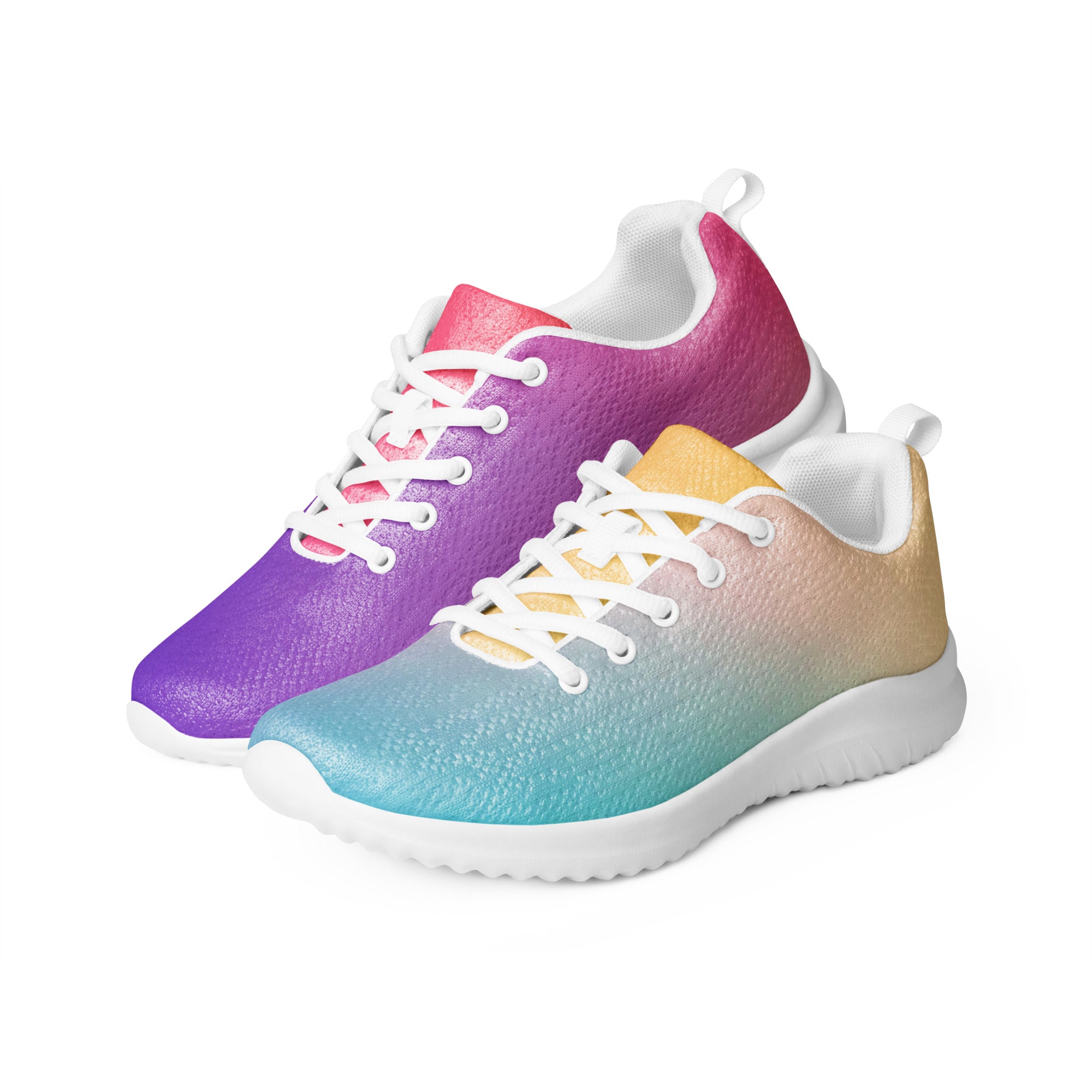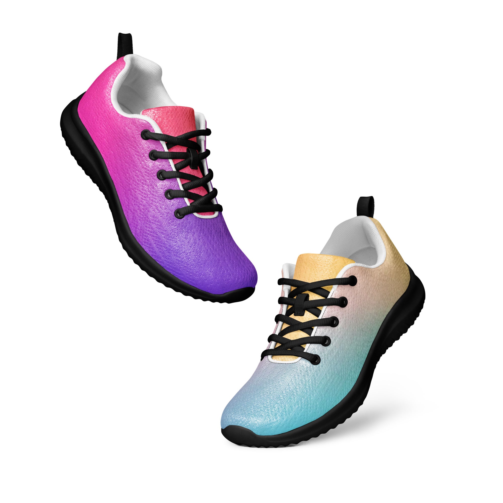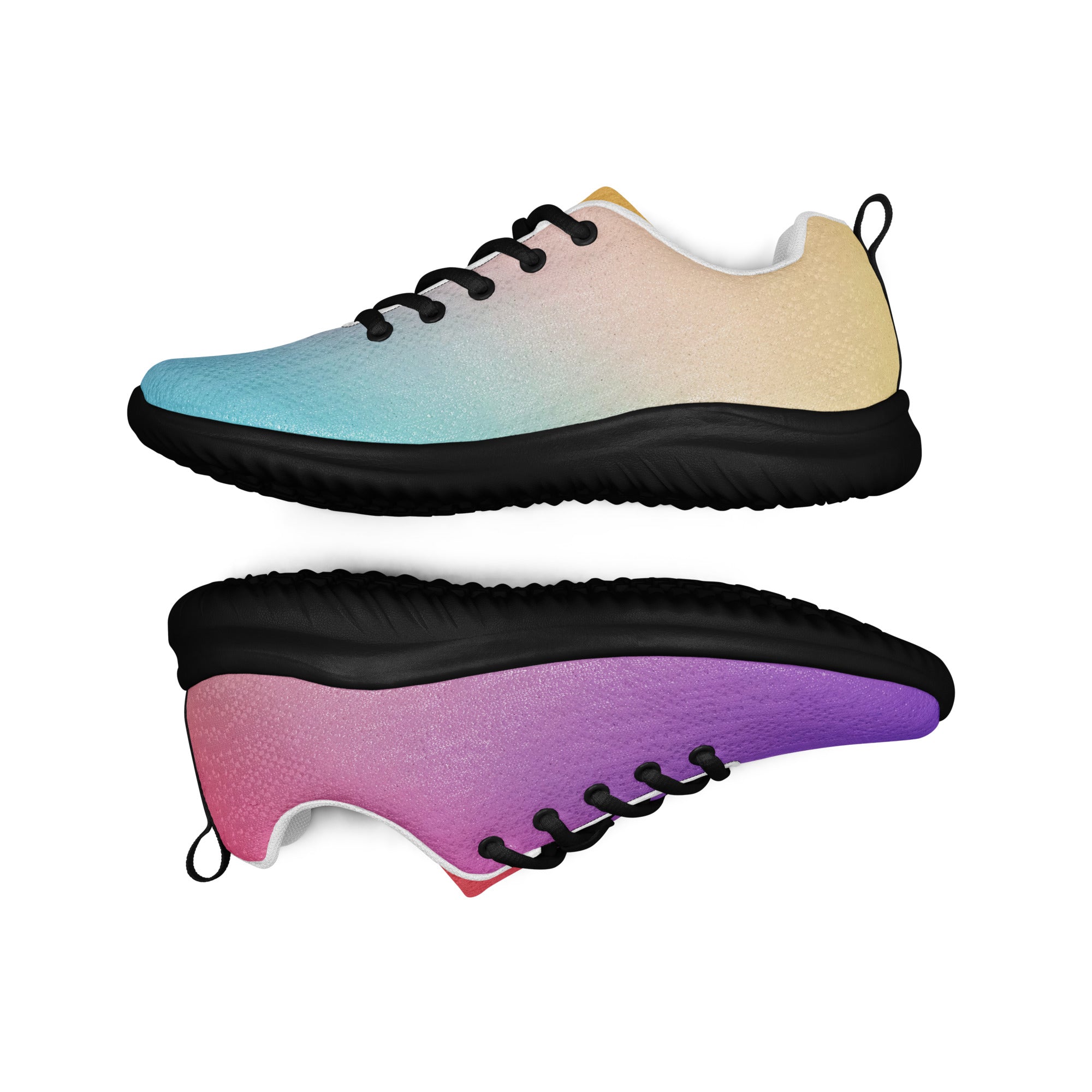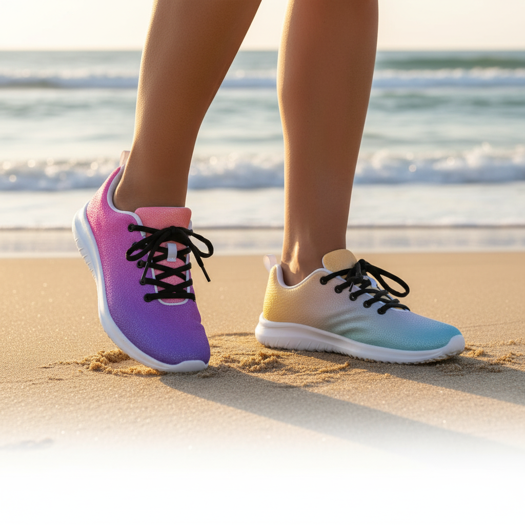 Step into a world of color with the Sunset Gradient Running Shoes—where performance meets stunning artistry. These aren't just athletic shoes; they're a statement piece that transitions beautifully from warm peachy-yellow tones to cool teal and vibrant purple, just like a breathtaking sunset.
