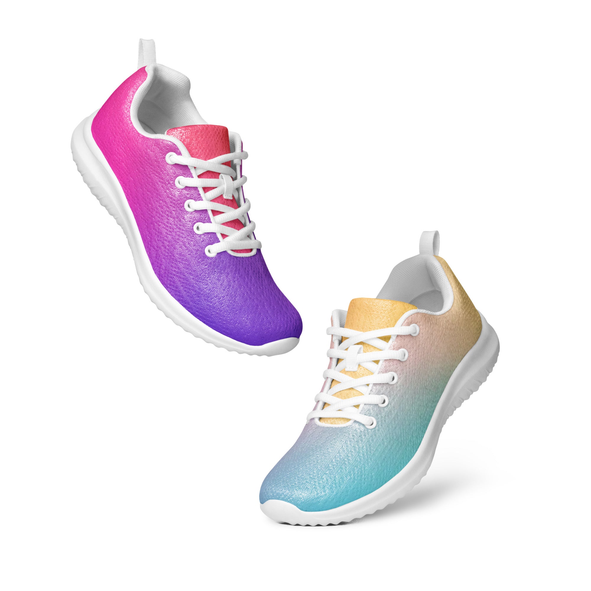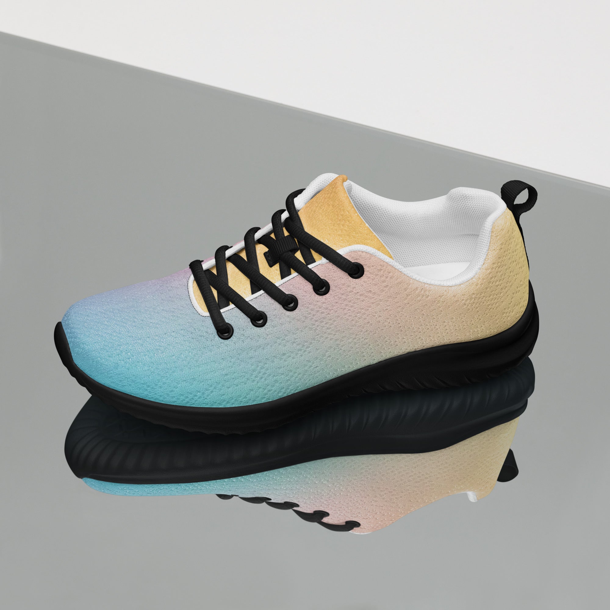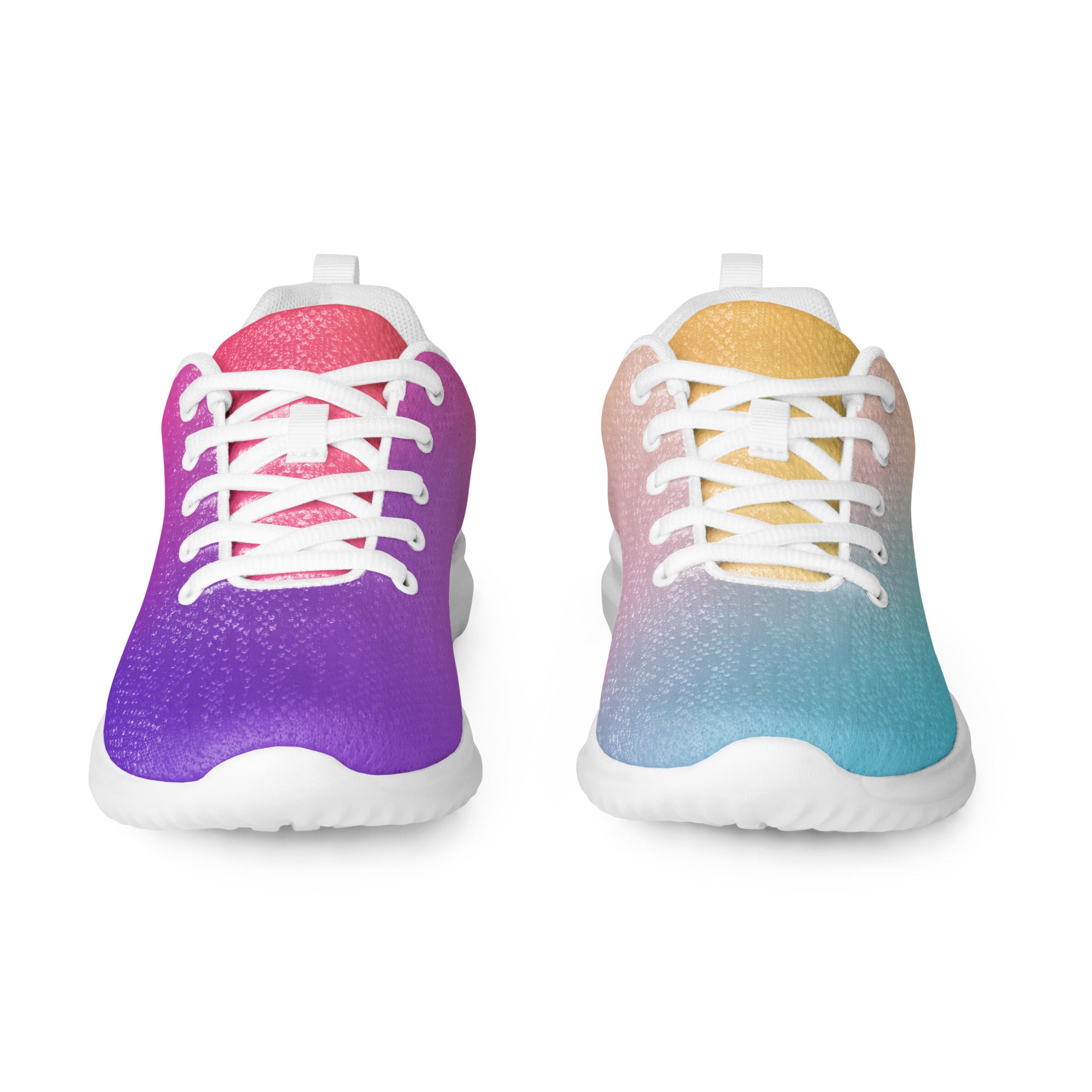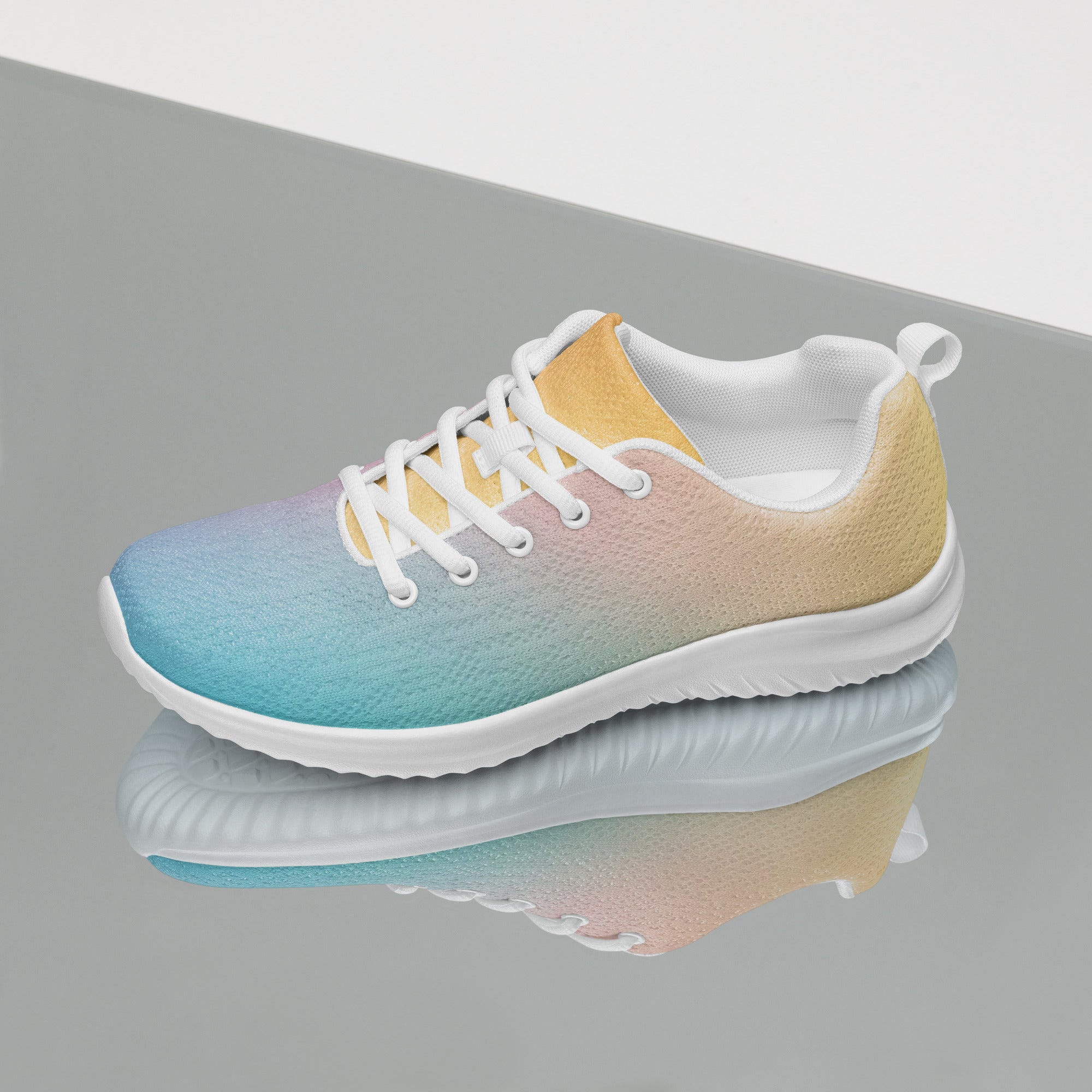 Step into a world of color with the Sunset Gradient Running Shoes—where performance meets stunning artistry. These aren't just athletic shoes; they're a statement piece that transitions beautifully from warm peachy-yellow tones to cool teal and vibrant purple, just like a breathtaking sunset.