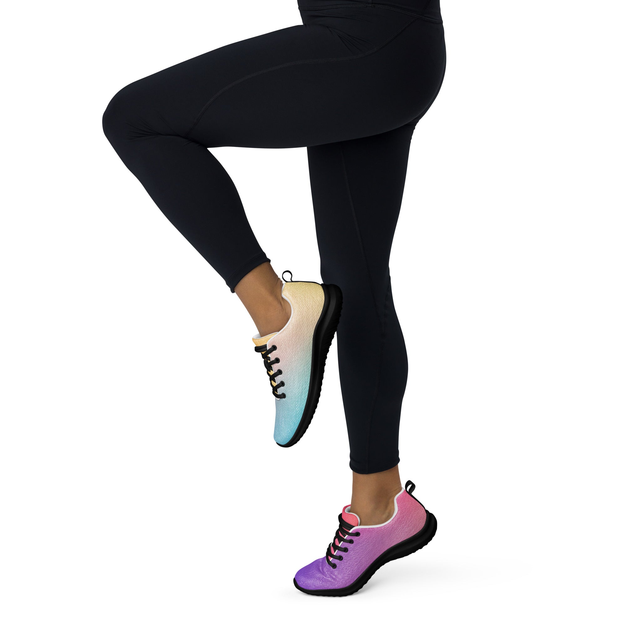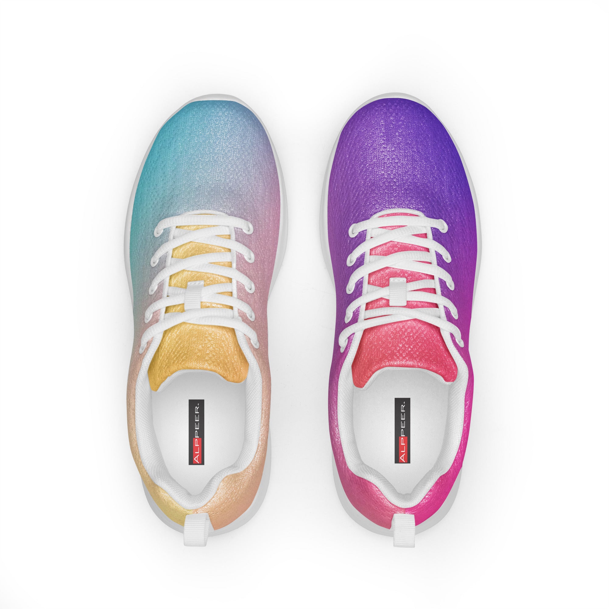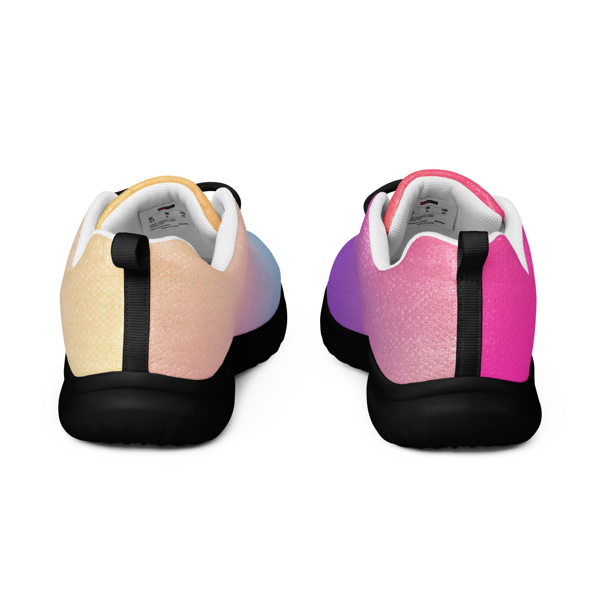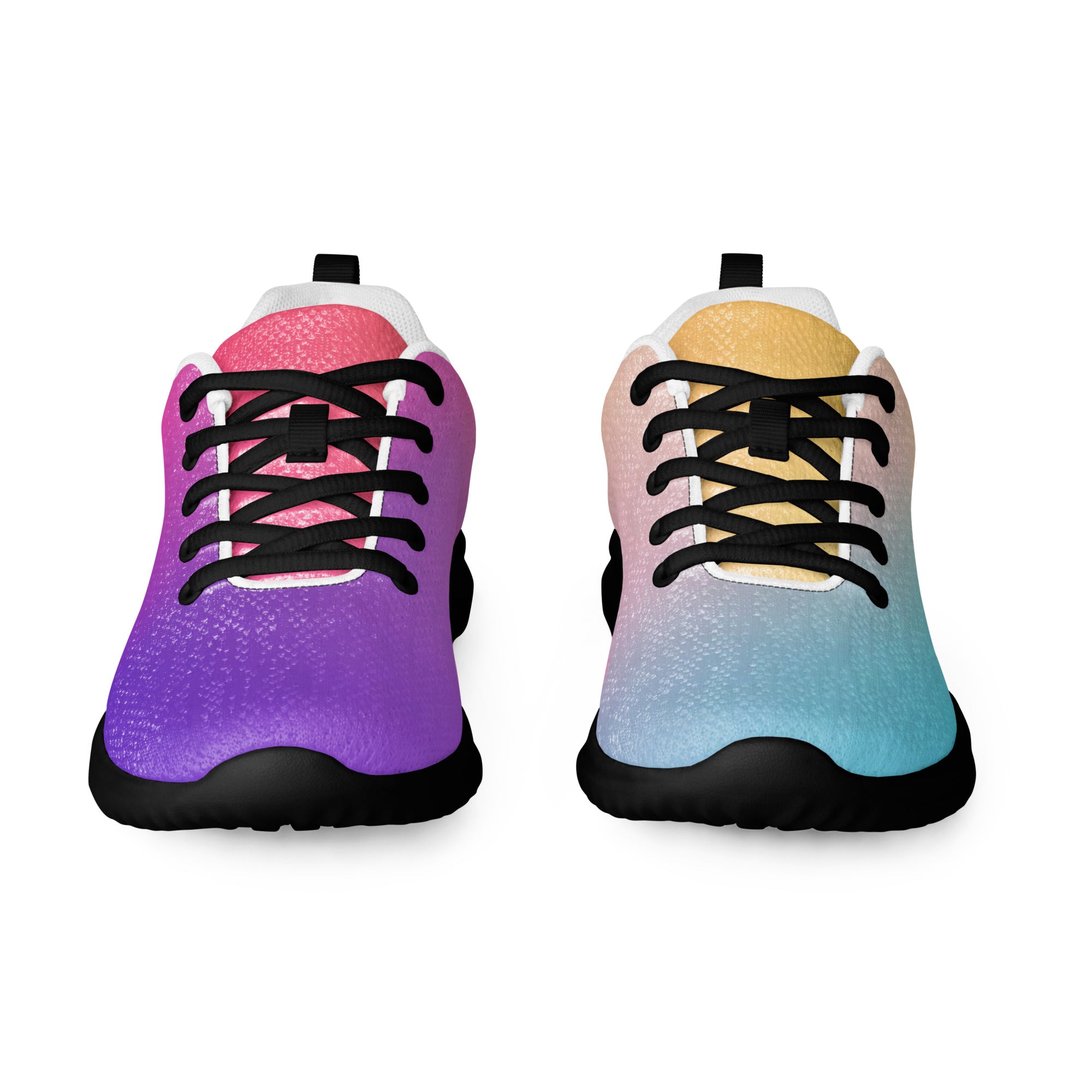 Step into a world of color with the Sunset Gradient Running Shoes—where performance meets stunning artistry. These aren't just athletic shoes; they're a statement piece that transitions beautifully from warm peachy-yellow tones to cool teal and vibrant purple, just like a breathtaking sunset.