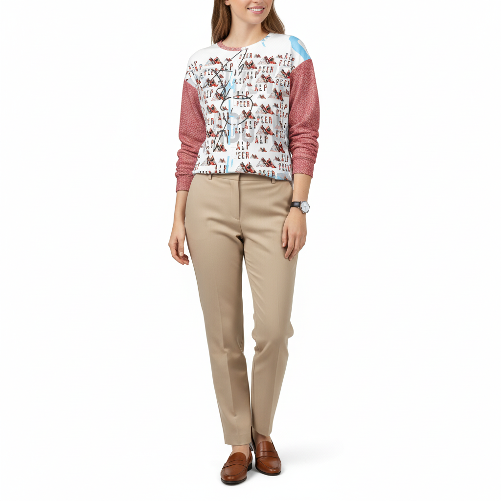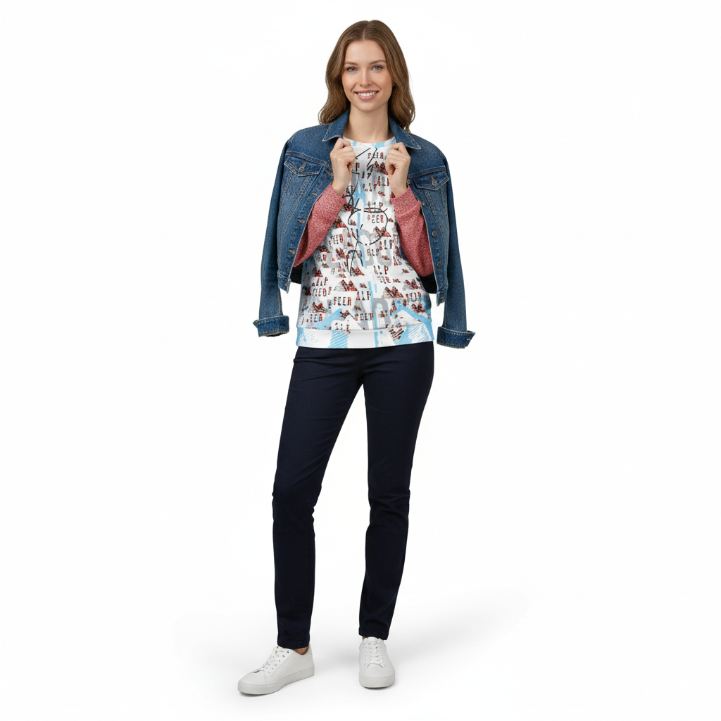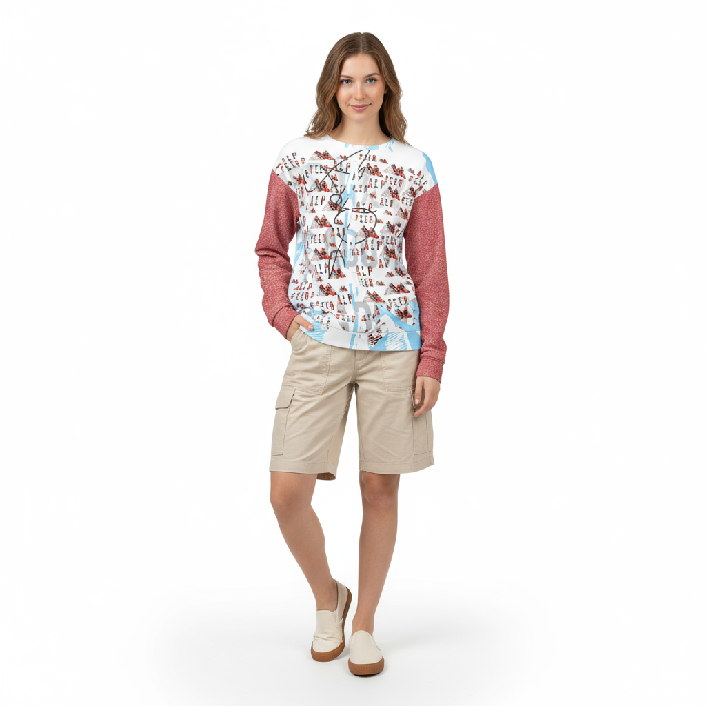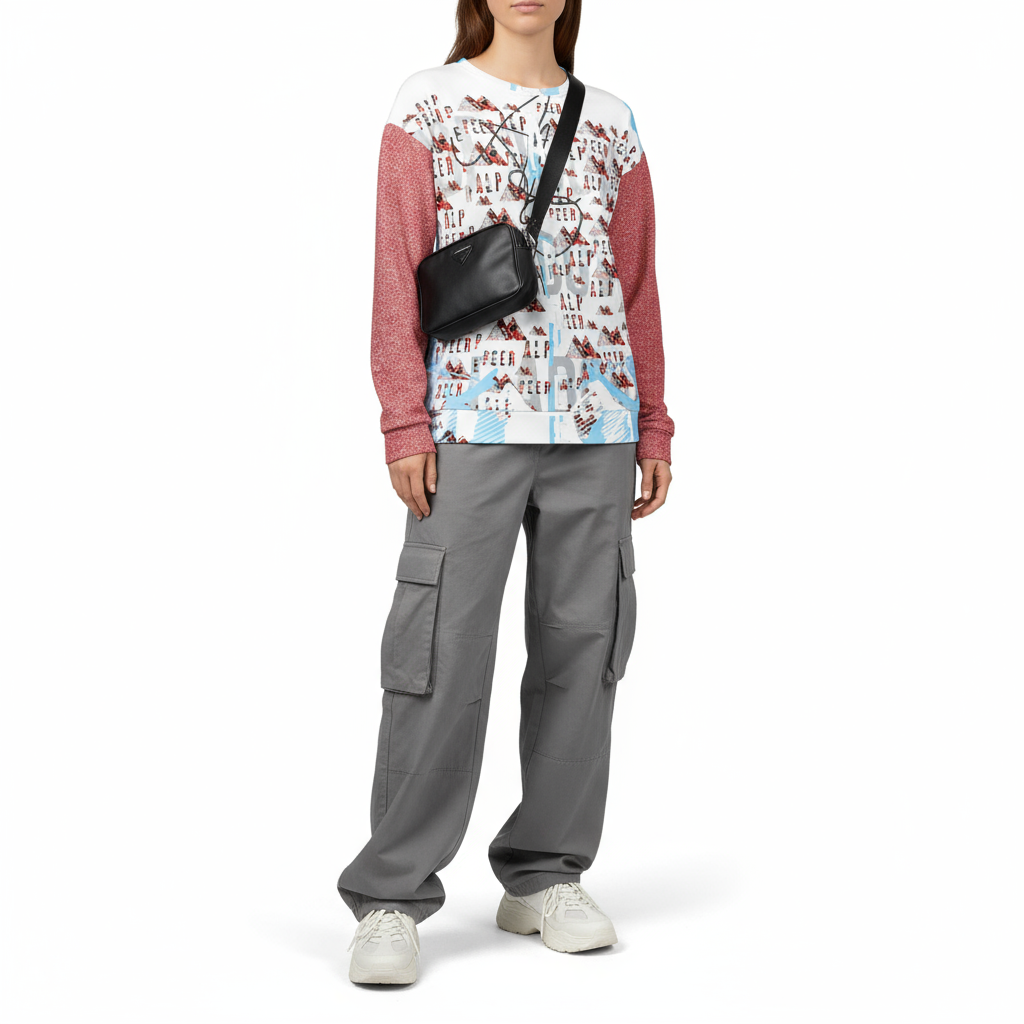 - Eye-Catching All-Over Print: Featuring a dynamic pattern with skiers, mountain graphics, and the word "ALPPEER" scattered throughout, paired with distinctive sparkly coral sleeves that add a premium touch