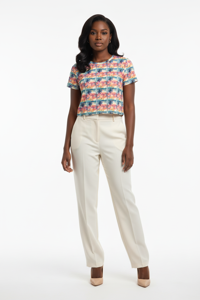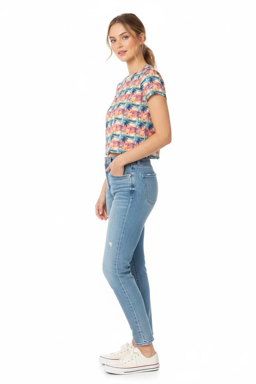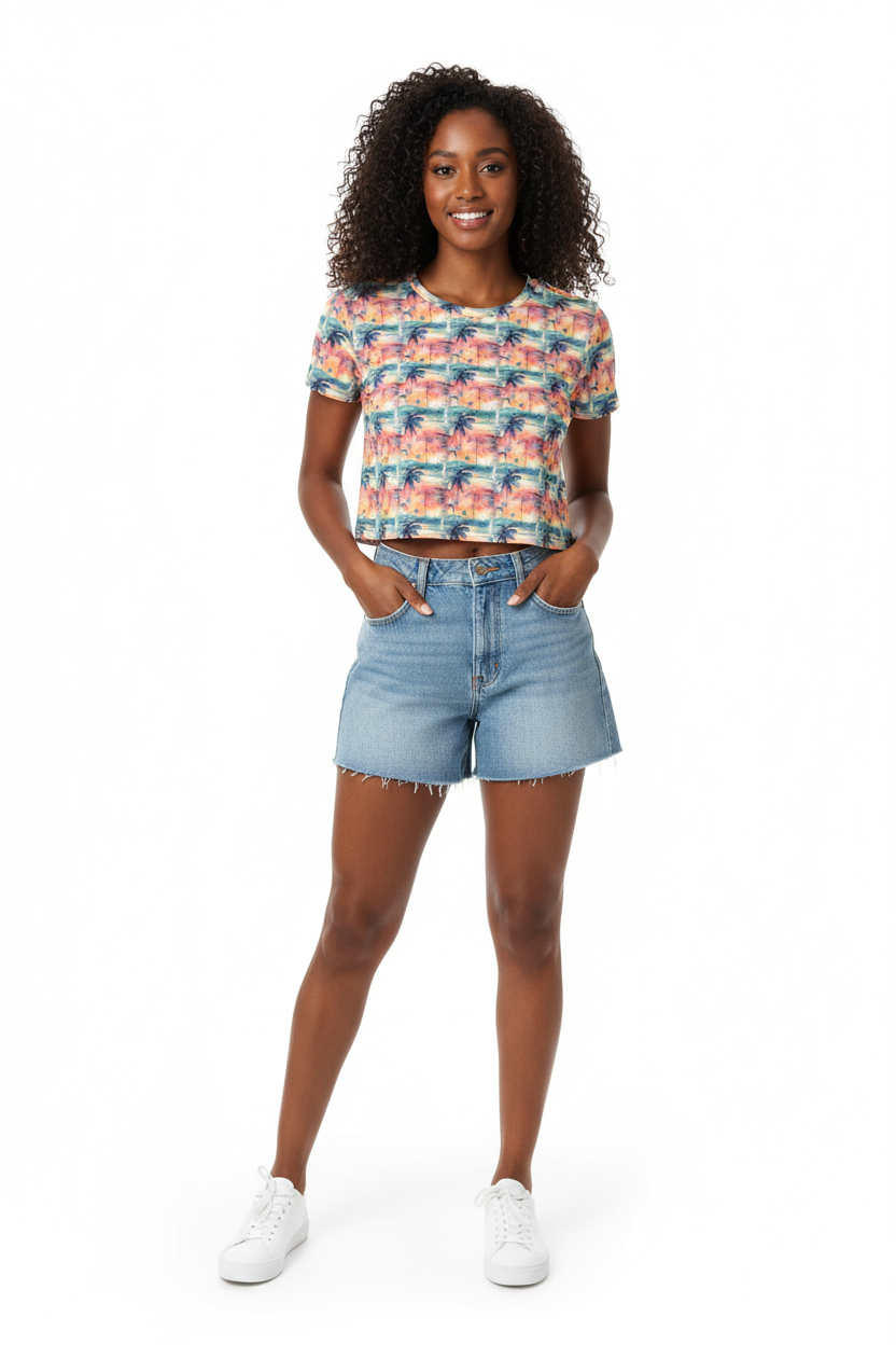 This versatile crop tee transitions effortlessly from beach cover-up to date night essential. Pair it with high-waisted jeans for casual elegance, style it with a midi skirt for sophisticated charm, or wear it over bikini bottoms for the ultimate beach-to-bar look. The tropical sunset print brings vacation vibes to any outfit.