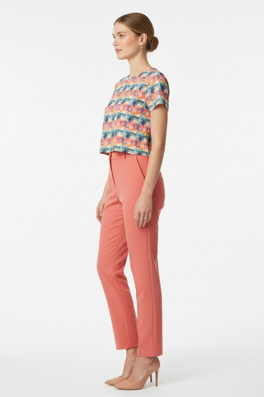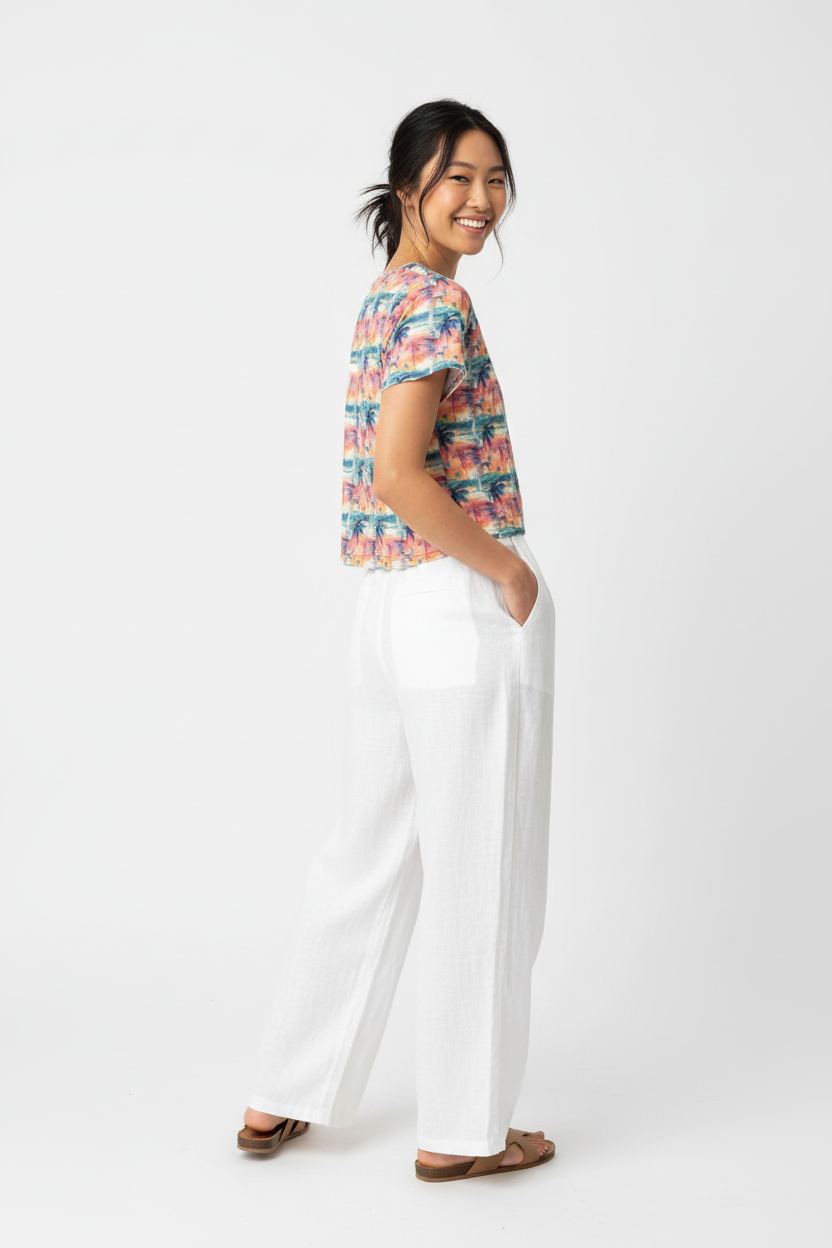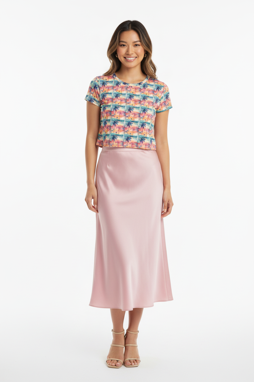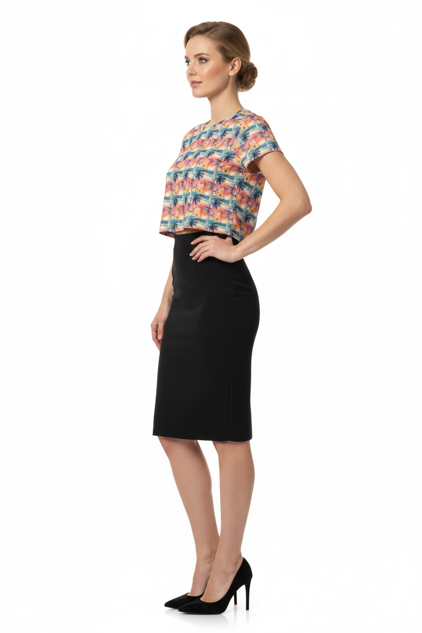 This versatile crop tee transitions effortlessly from beach cover-up to date night essential. Pair it with high-waisted jeans for casual elegance, style it with a midi skirt for sophisticated charm, or wear it over bikini bottoms for the ultimate beach-to-bar look. The tropical sunset print brings vacation vibes to any outfit.