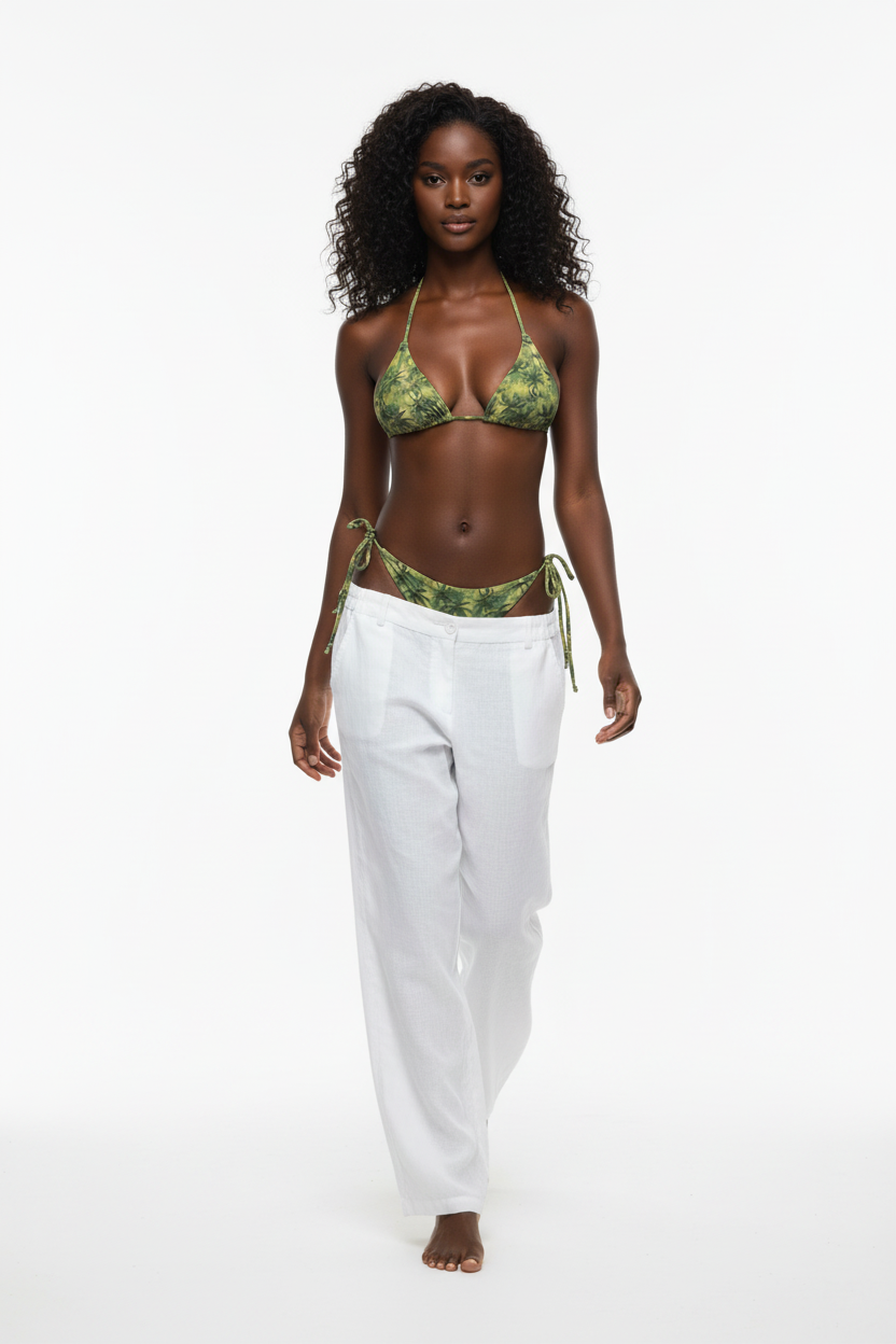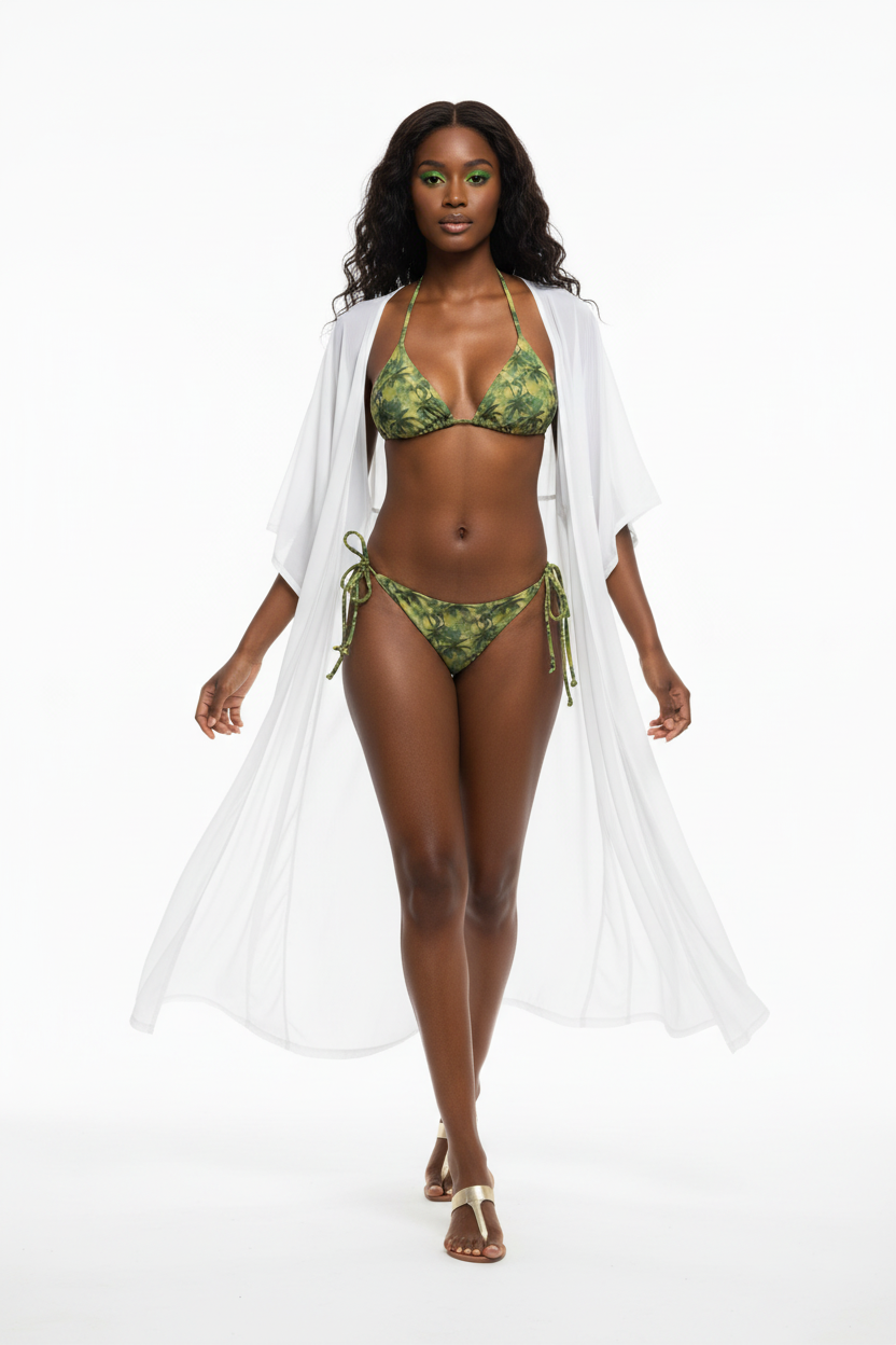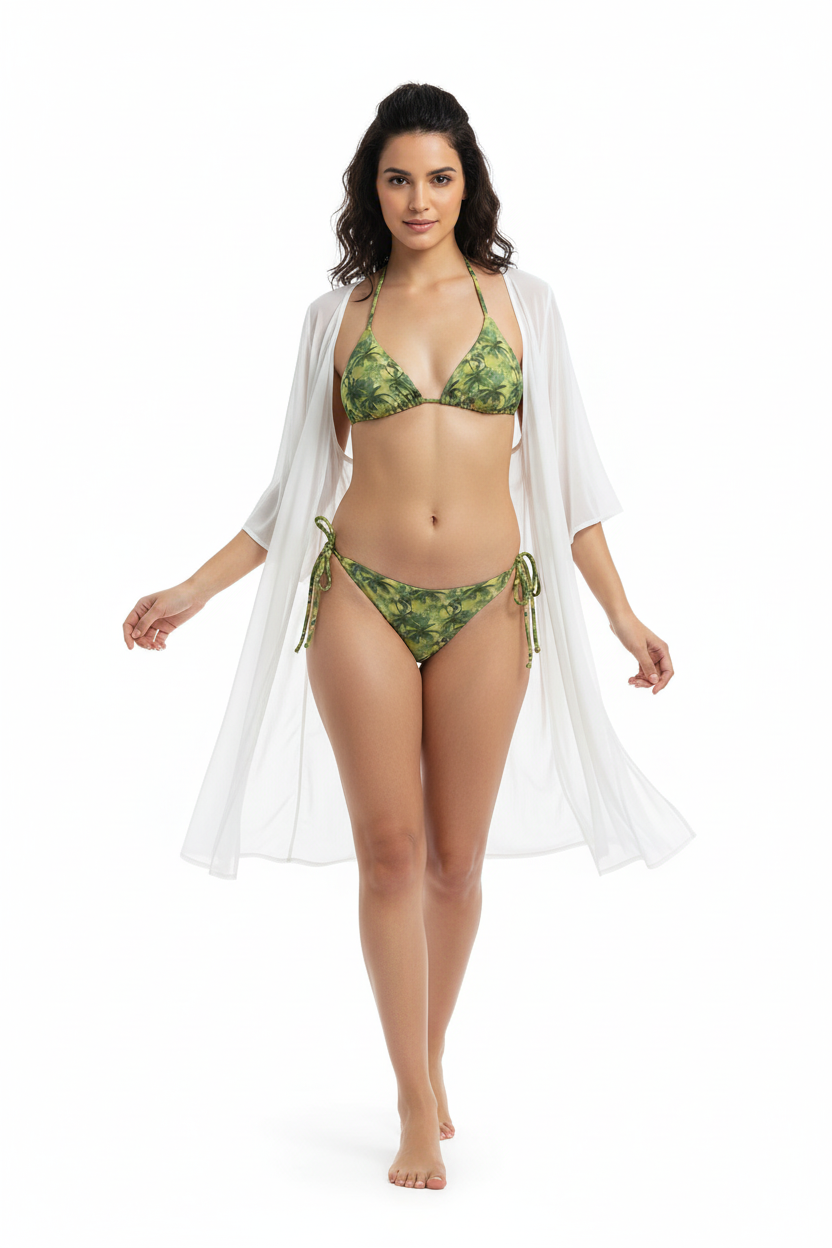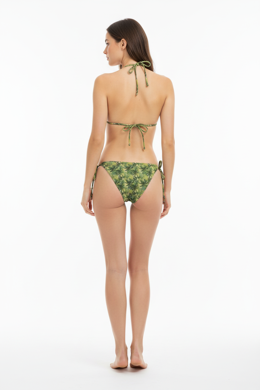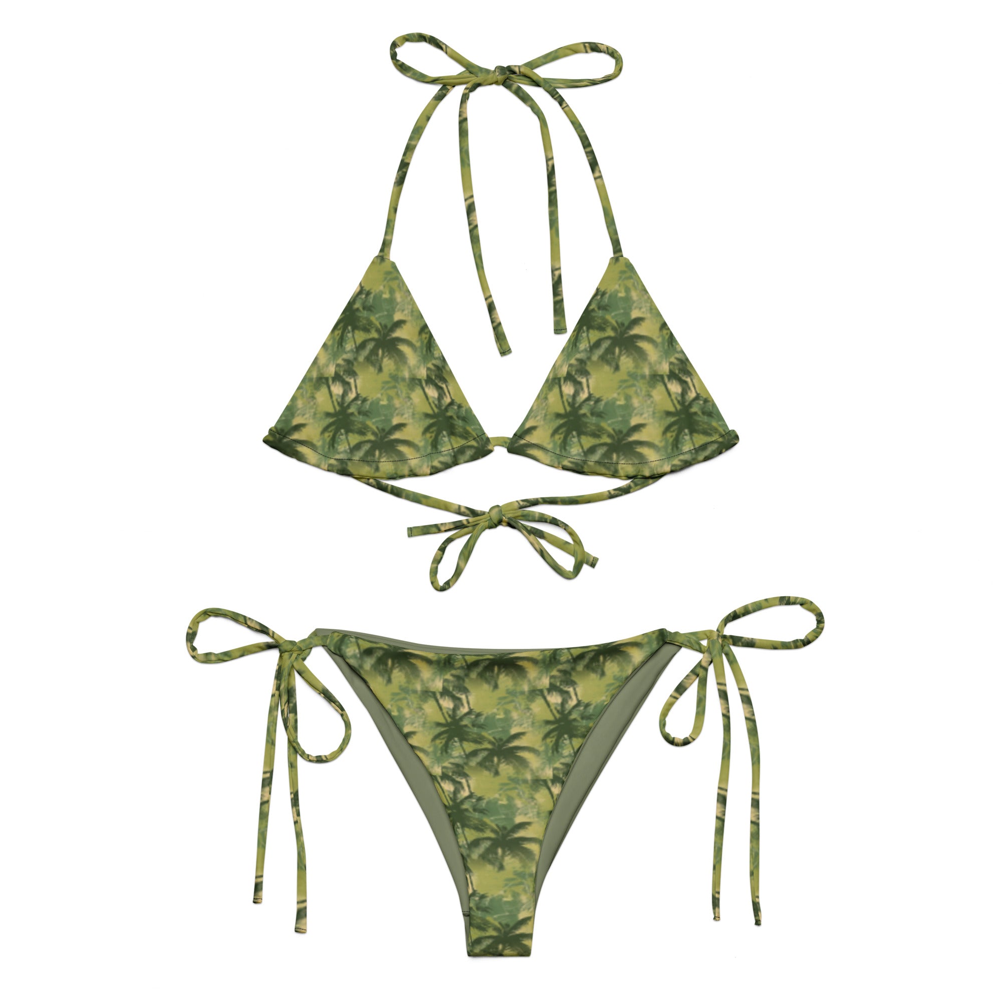 Escape to the tropics with the Palm Paradise String Bikini, featuring a lush green and yellow palm tree print that brings island vibes to every beach day. This eco-conscious recycled string bikini combines sustainable style with adjustable comfort and flattering tie details.