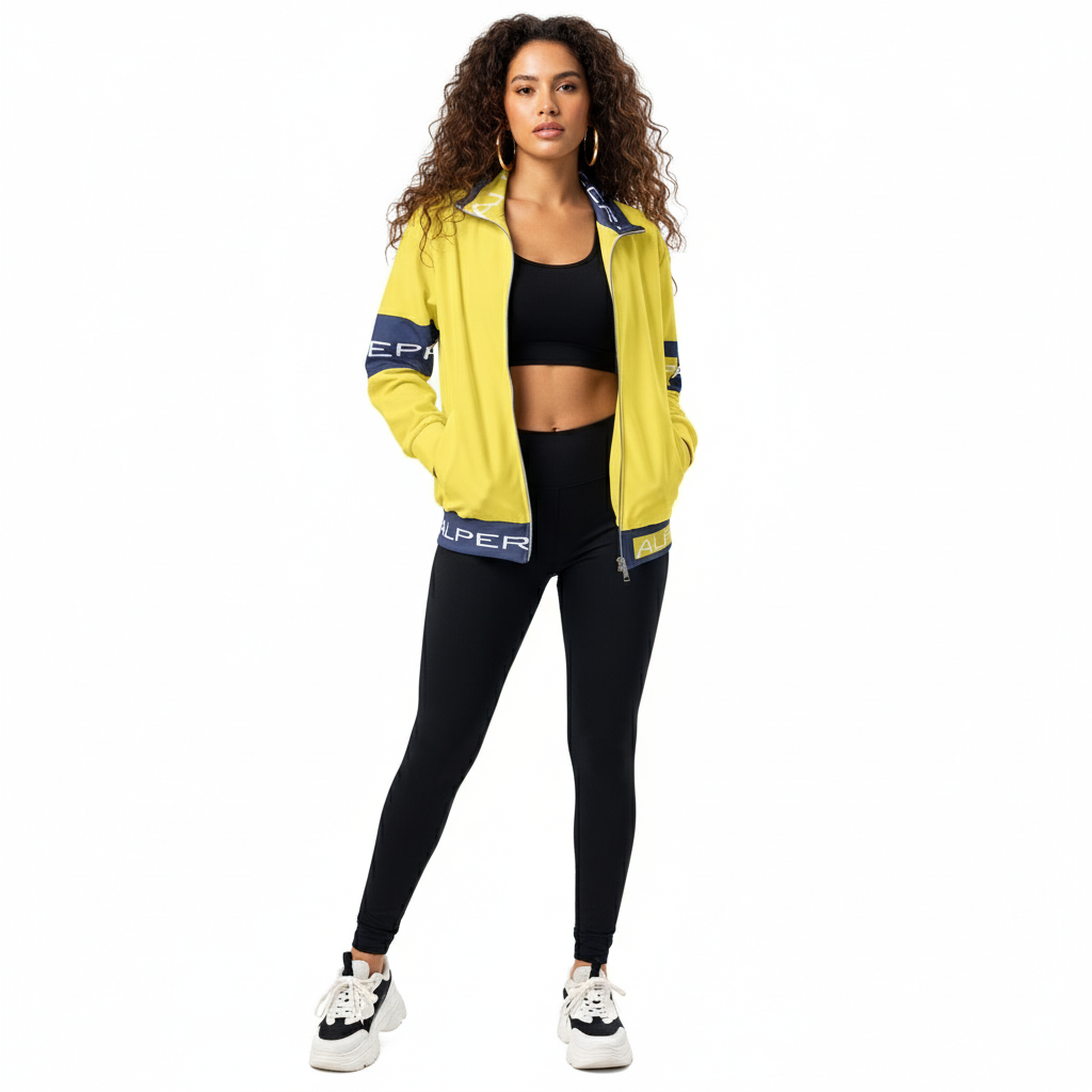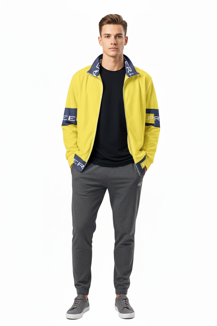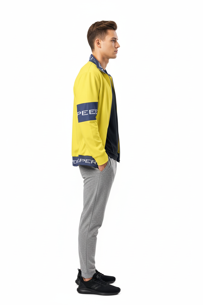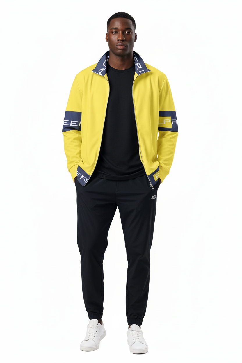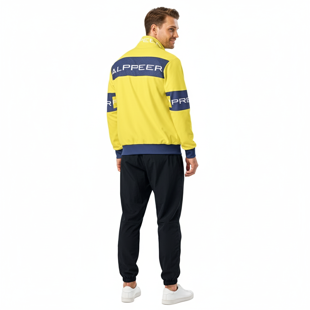 Make a bold statement with the Alppeer Pro Series Track Jacket – a vibrant yellow and navy unisex jacket that combines eye-catching style with eco-conscious design for the modern athlete and streetwear enthusiast.