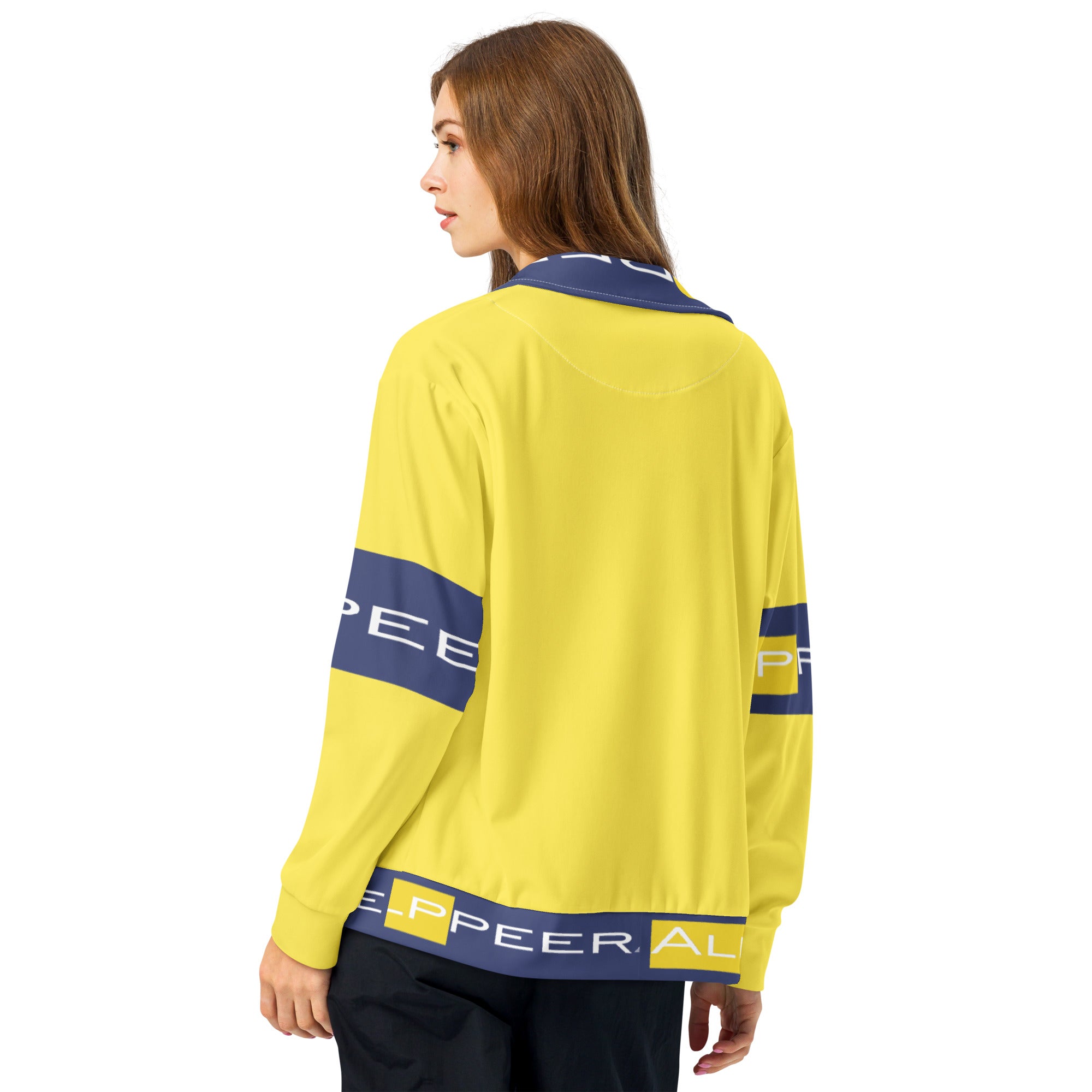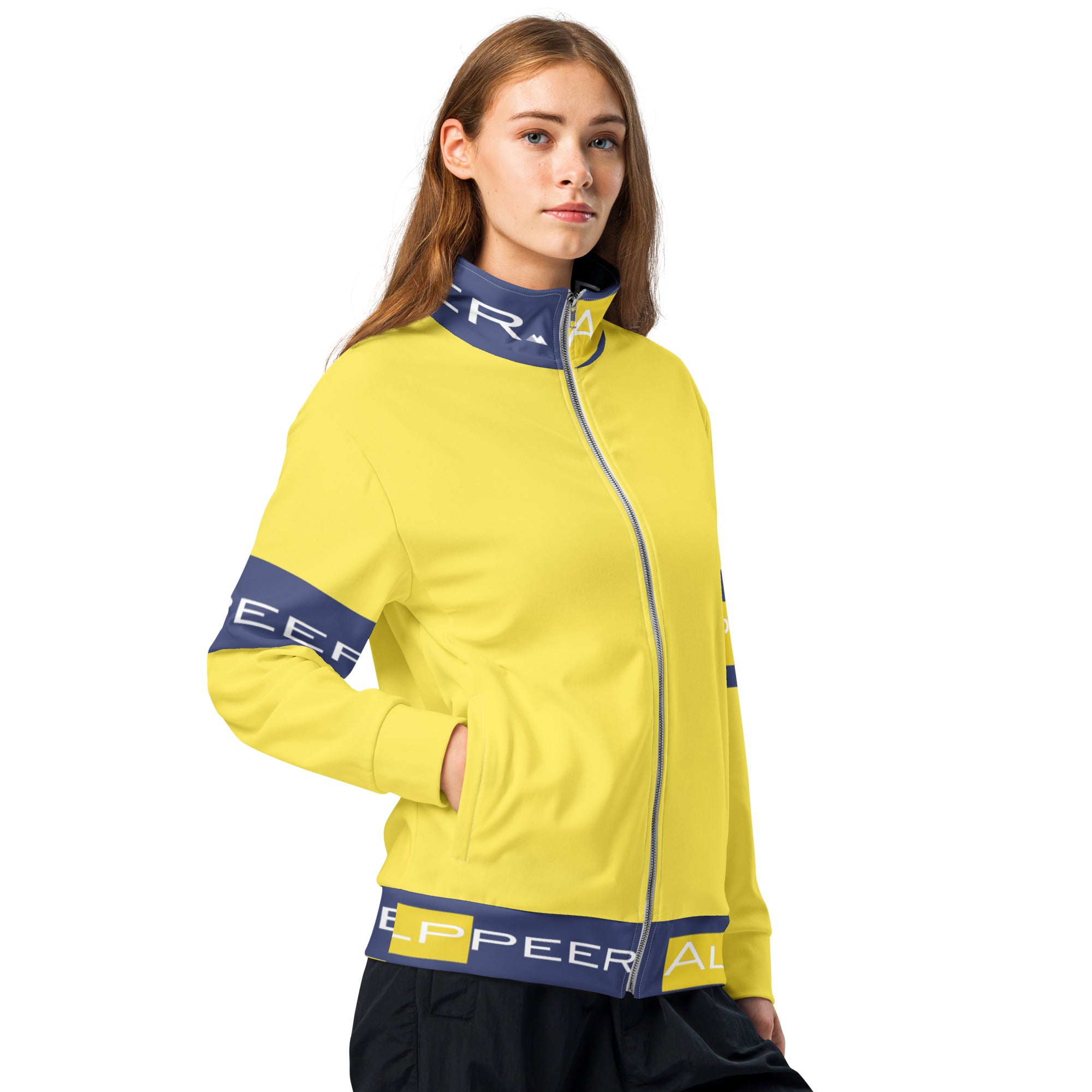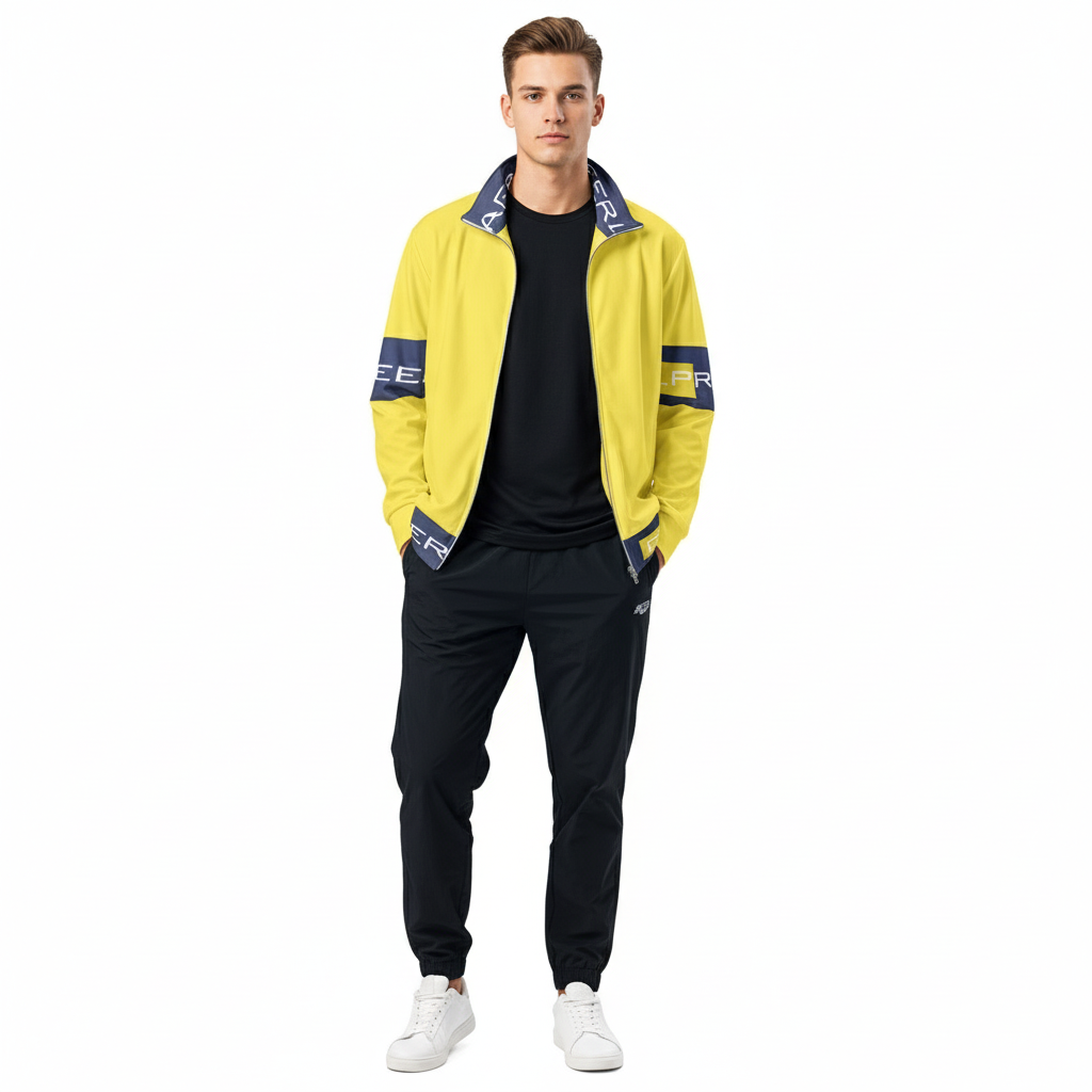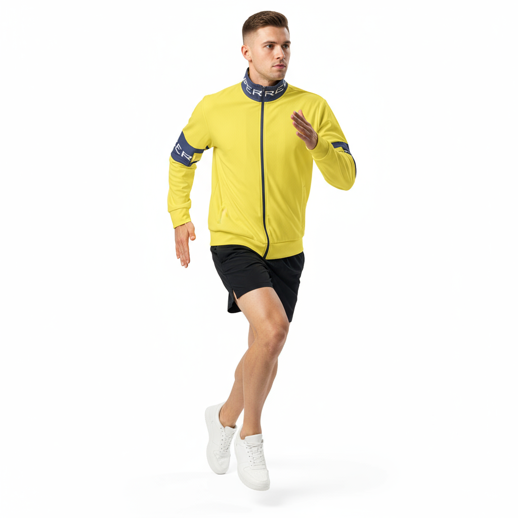Make a bold statement with the Alppeer Pro Series Track Jacket – a vibrant yellow and navy unisex jacket that combines eye-catching style with eco-conscious design for the modern athlete and streetwear enthusiast.