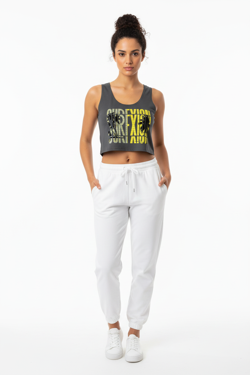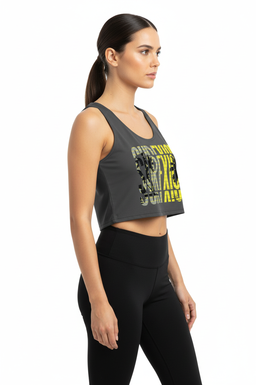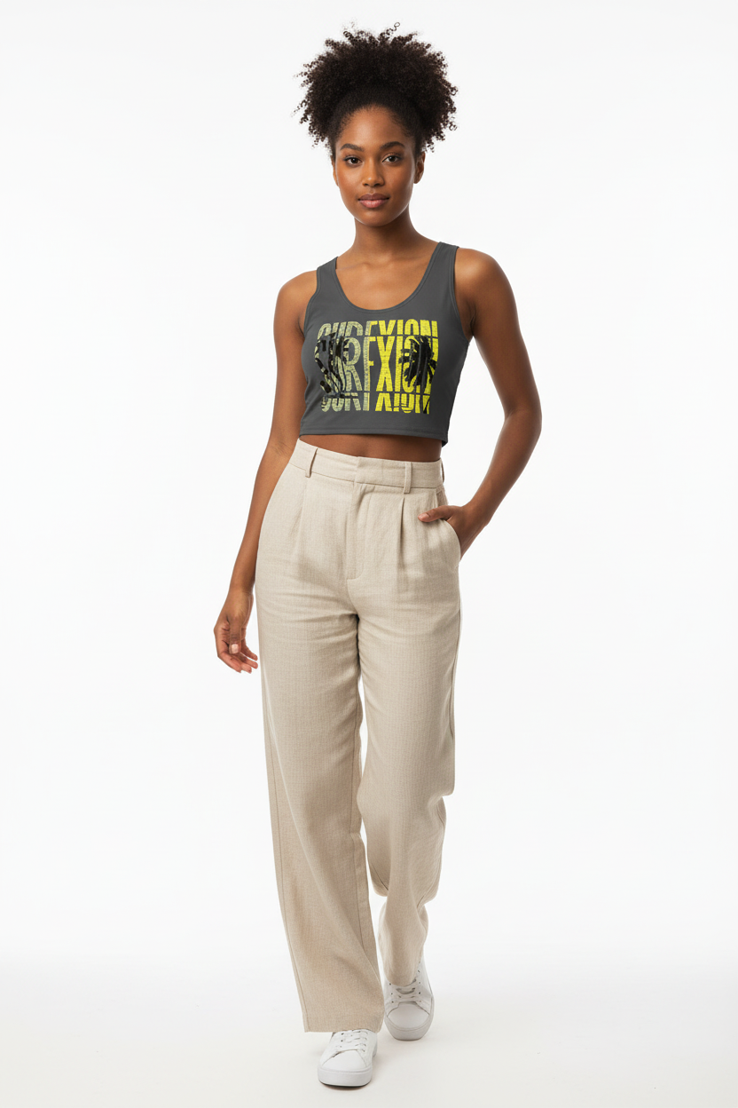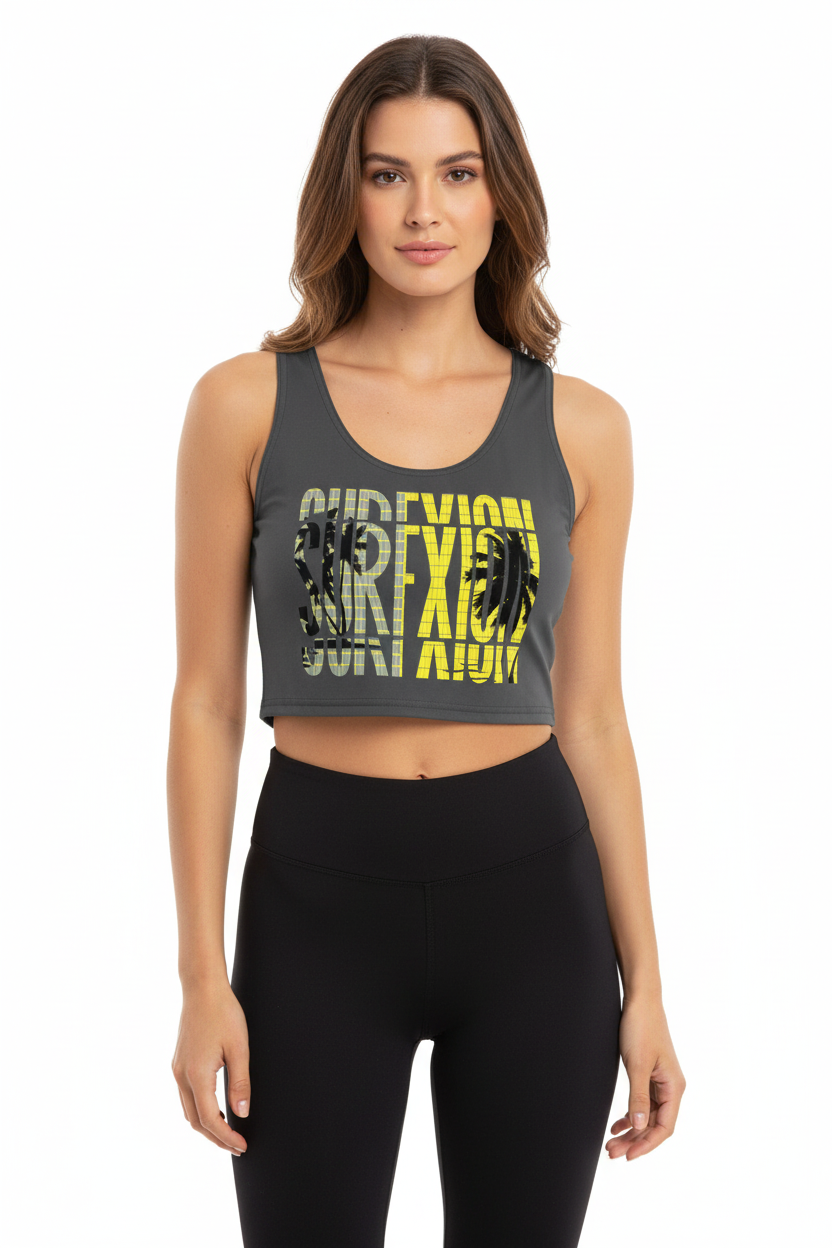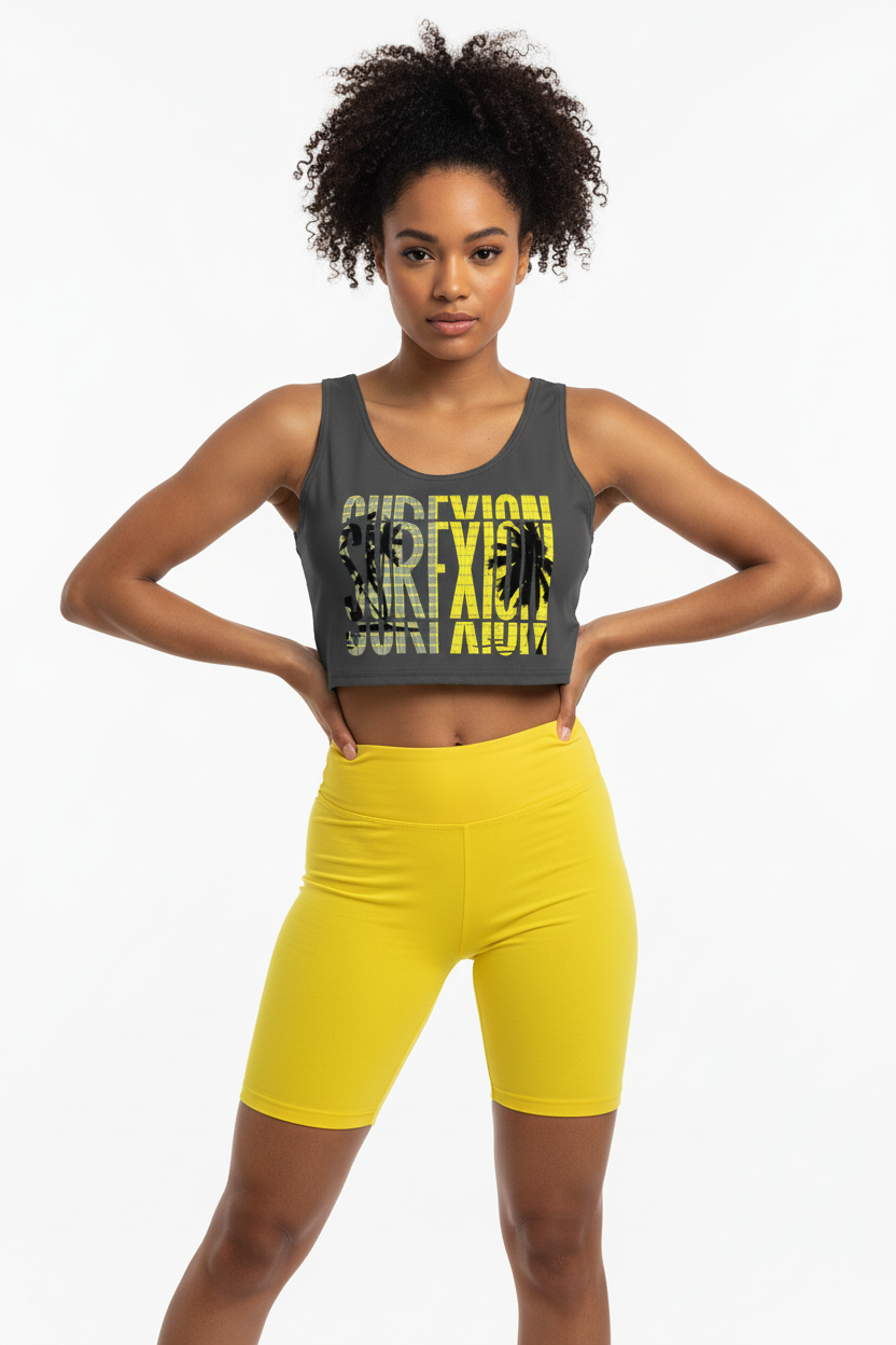 Make a statement with this bold SURFXION crop top featuring striking yellow and gray typography layered over palm tree silhouettes. This premium all-over print design brings surf culture energy to your everyday wardrobe with a modern athletic edge.