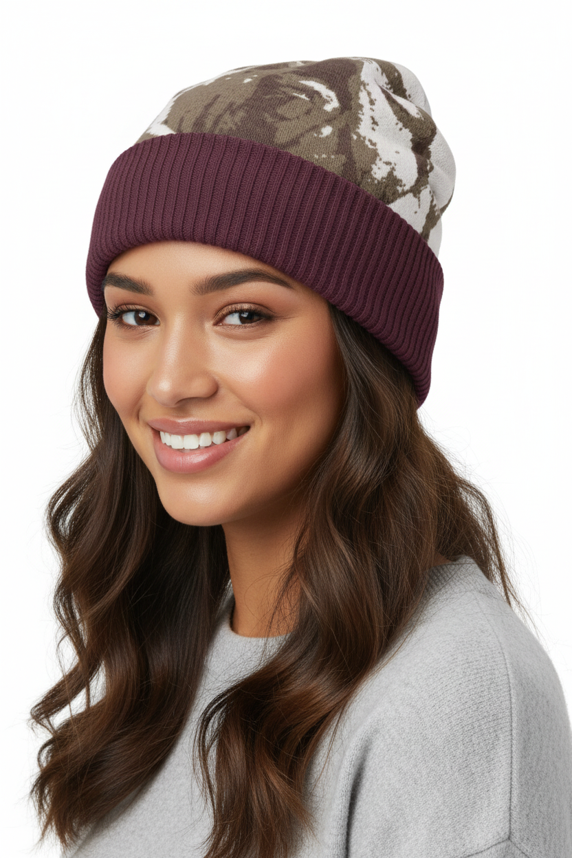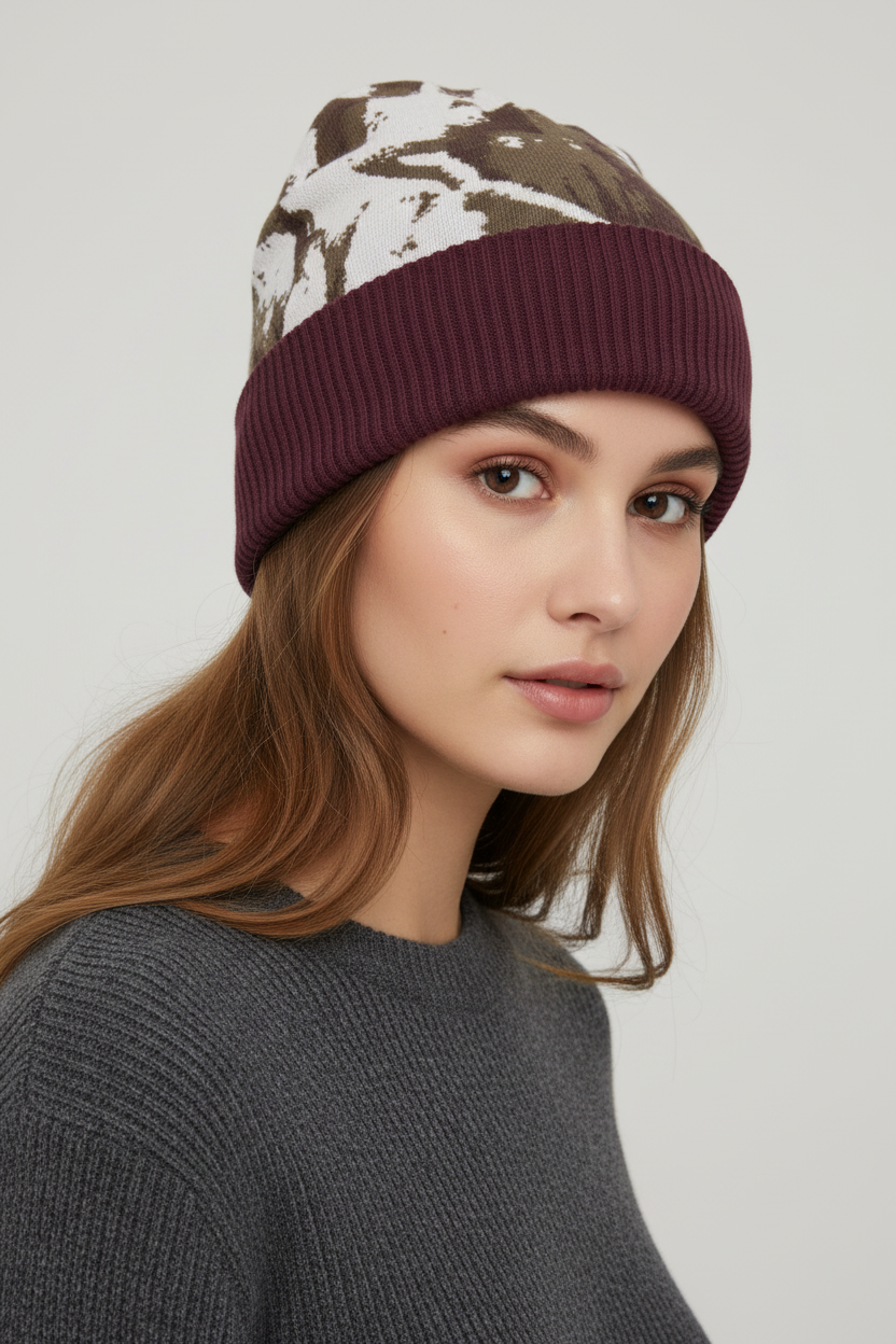 Embrace your wild side with the Ranch Life Cow Print Knitted Beanie, featuring a distinctive brown and white cow print pattern paired with a rich burgundy ribbed cuff. This eye-catching design brings playful ranch-inspired style to your winter wardrobe, whether you're exploring the backcountry, hitting the slopes, or adding personality to your everyday look.