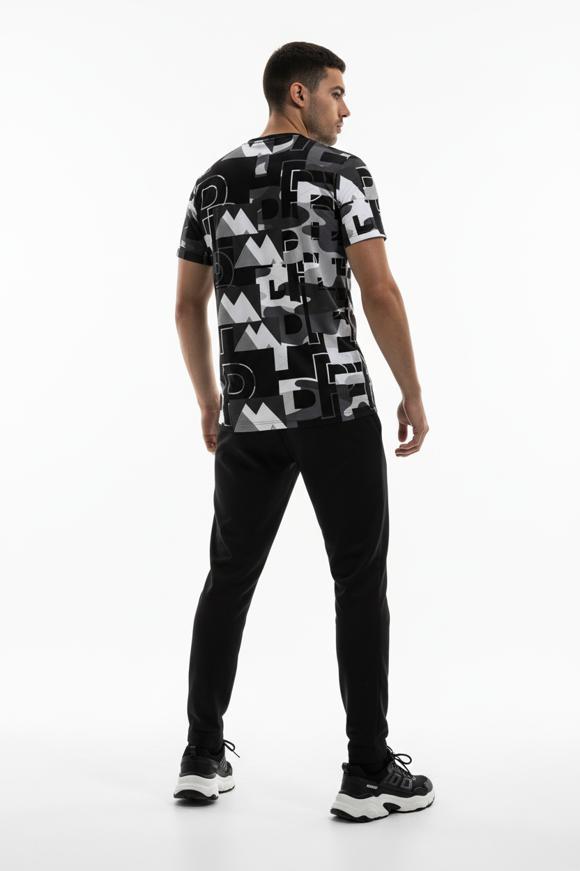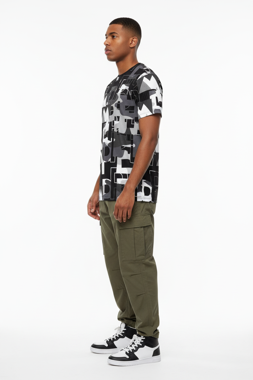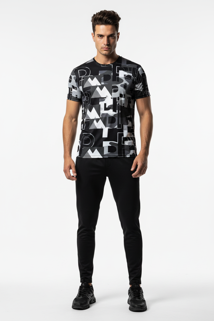 Engineered for athletes who lead, this athletic tee combines performance-ready functionality with commanding street style. The all-over print showcases dynamic graphic elements in black, white, and grey tones, creating a statement piece that transitions seamlessly from training to lifestyle.