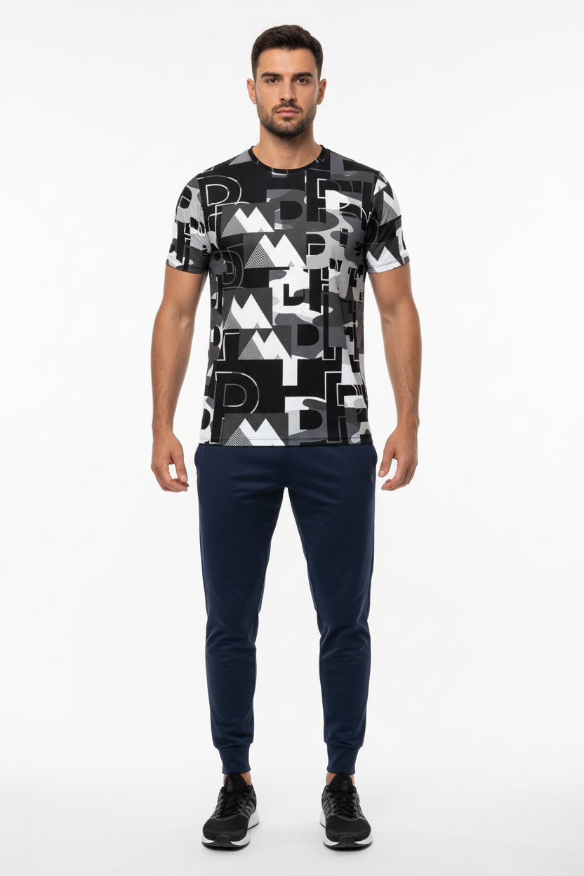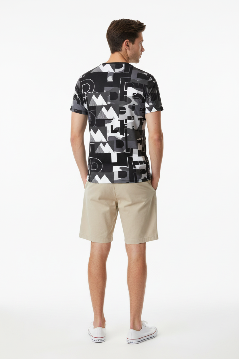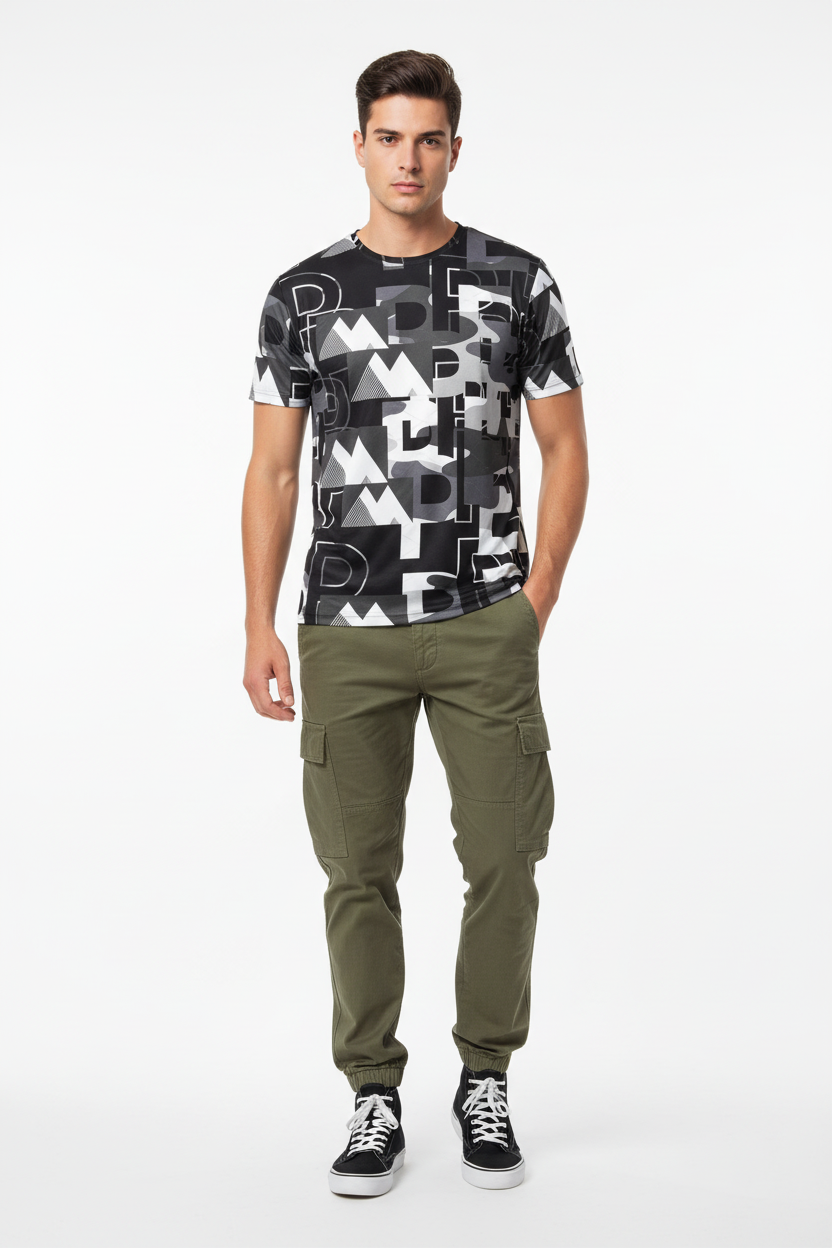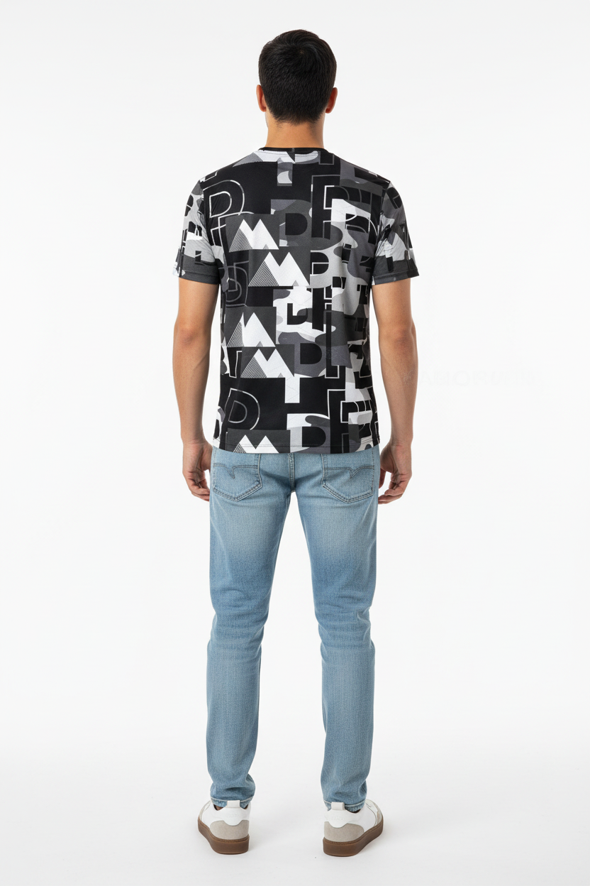 Engineered for athletes who lead, this athletic tee combines performance-ready functionality with commanding street style. The all-over print showcases dynamic graphic elements in black, white, and grey tones, creating a statement piece that transitions seamlessly from training to lifestyle.