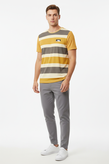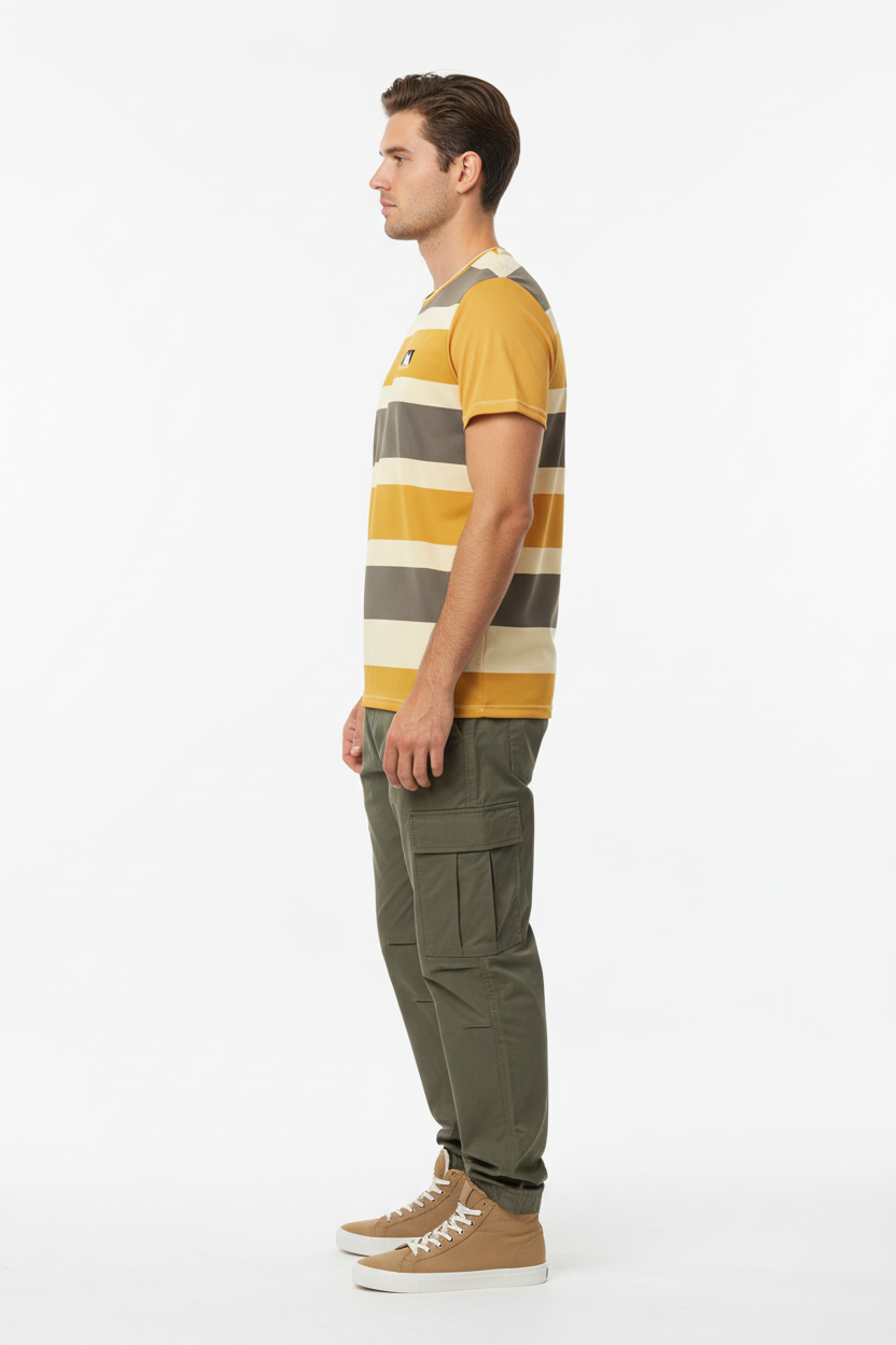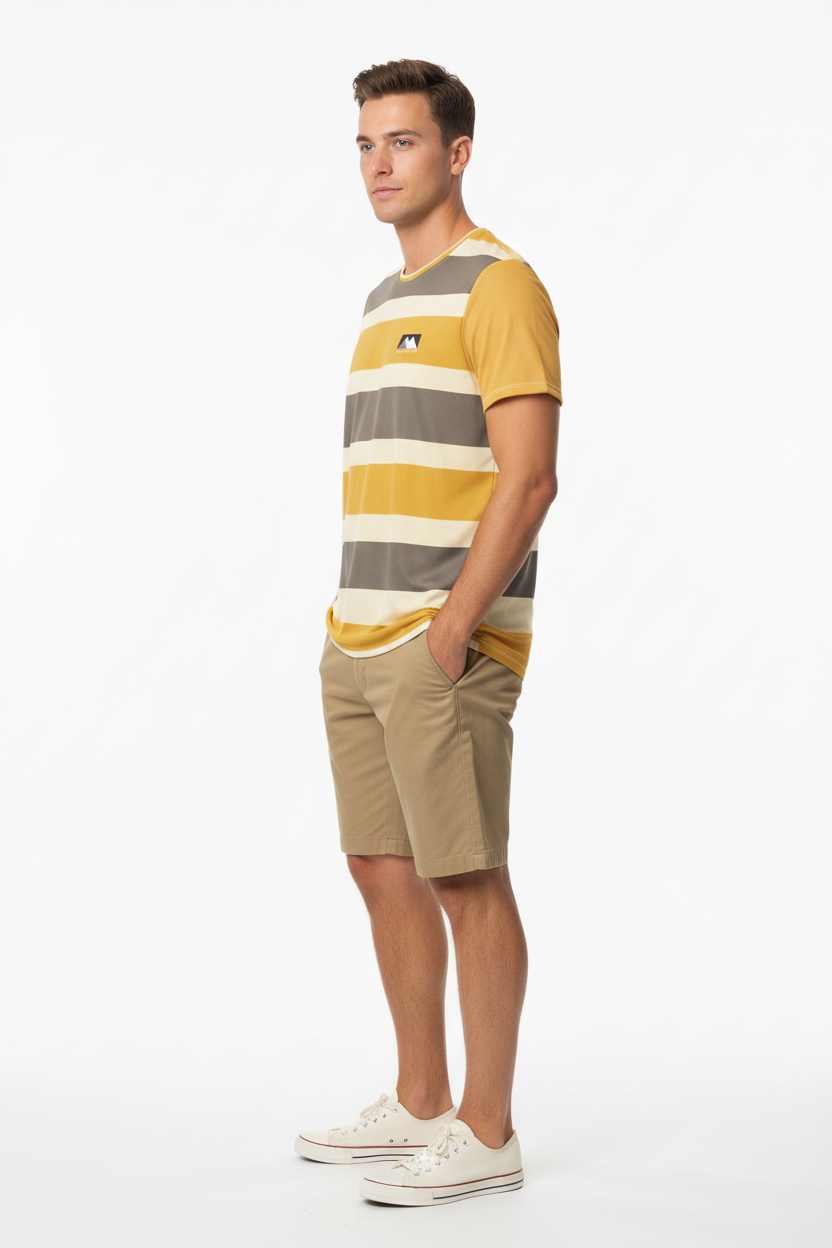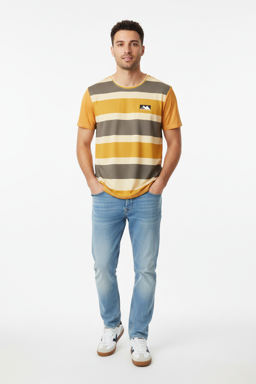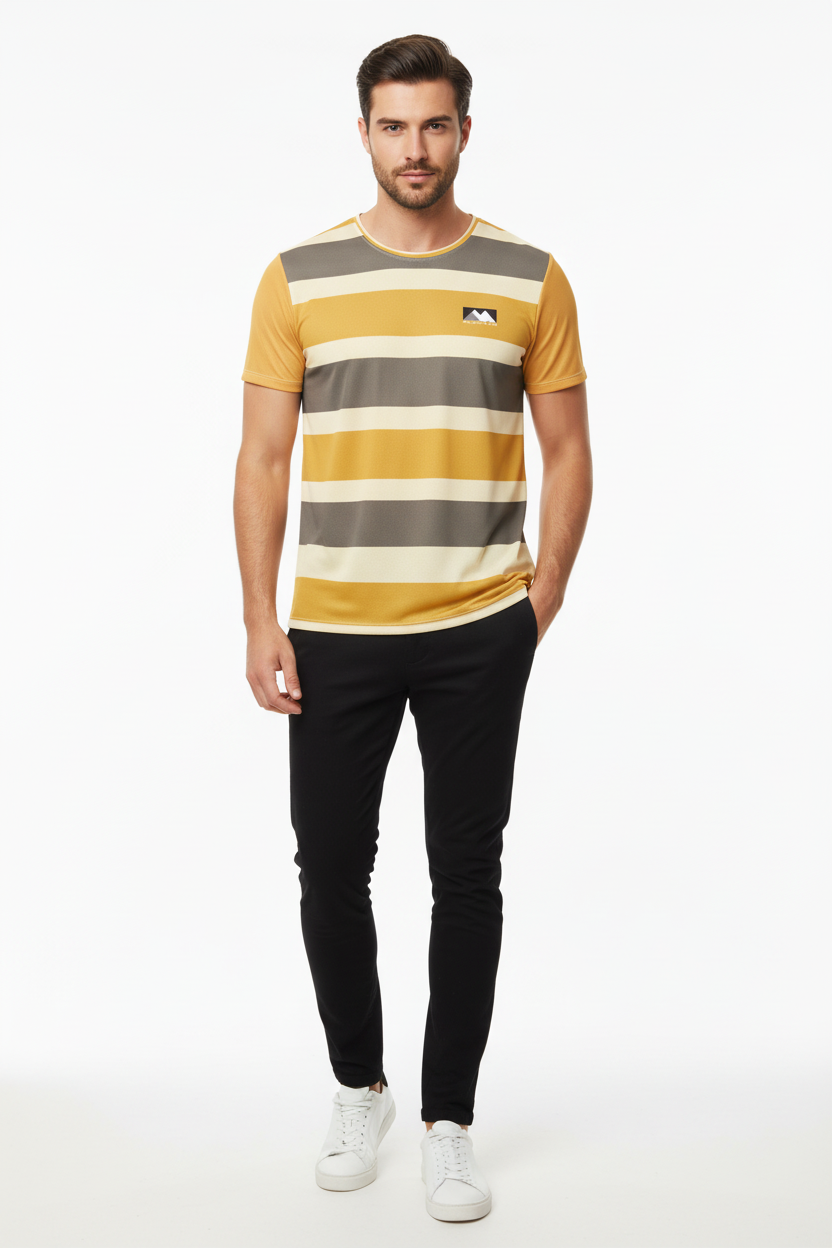 Chase the horizon with the Golden Horizon Athletic Tee. This performance tee features bold horizontal stripes in golden yellow, warm cream, and earthy grey tones with a subtle mountain logo, creating a retro-inspired athletic aesthetic that captures the spirit of outdoor adventure.