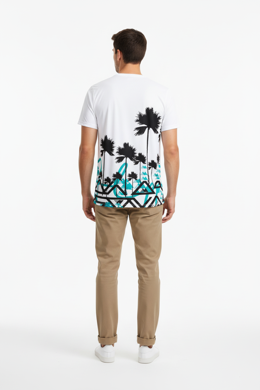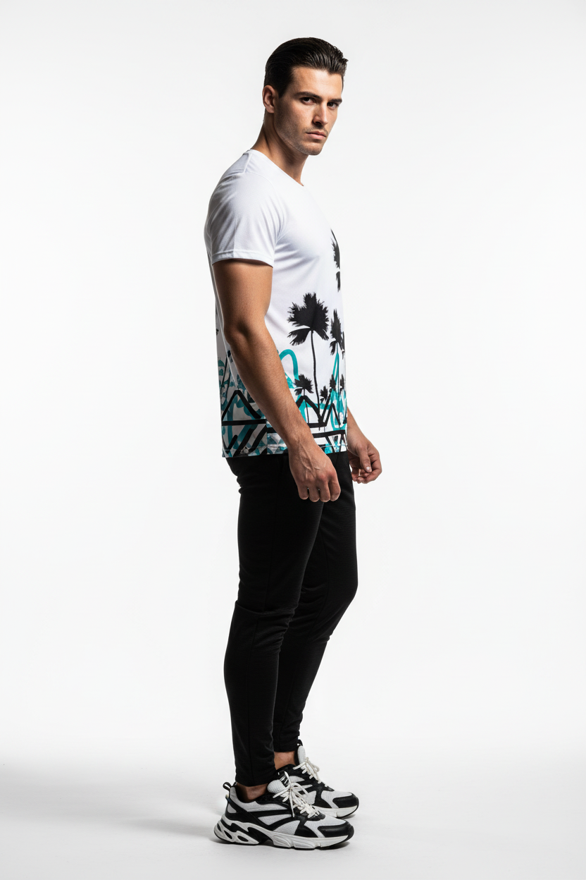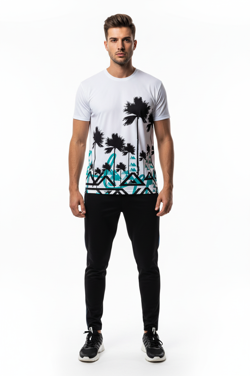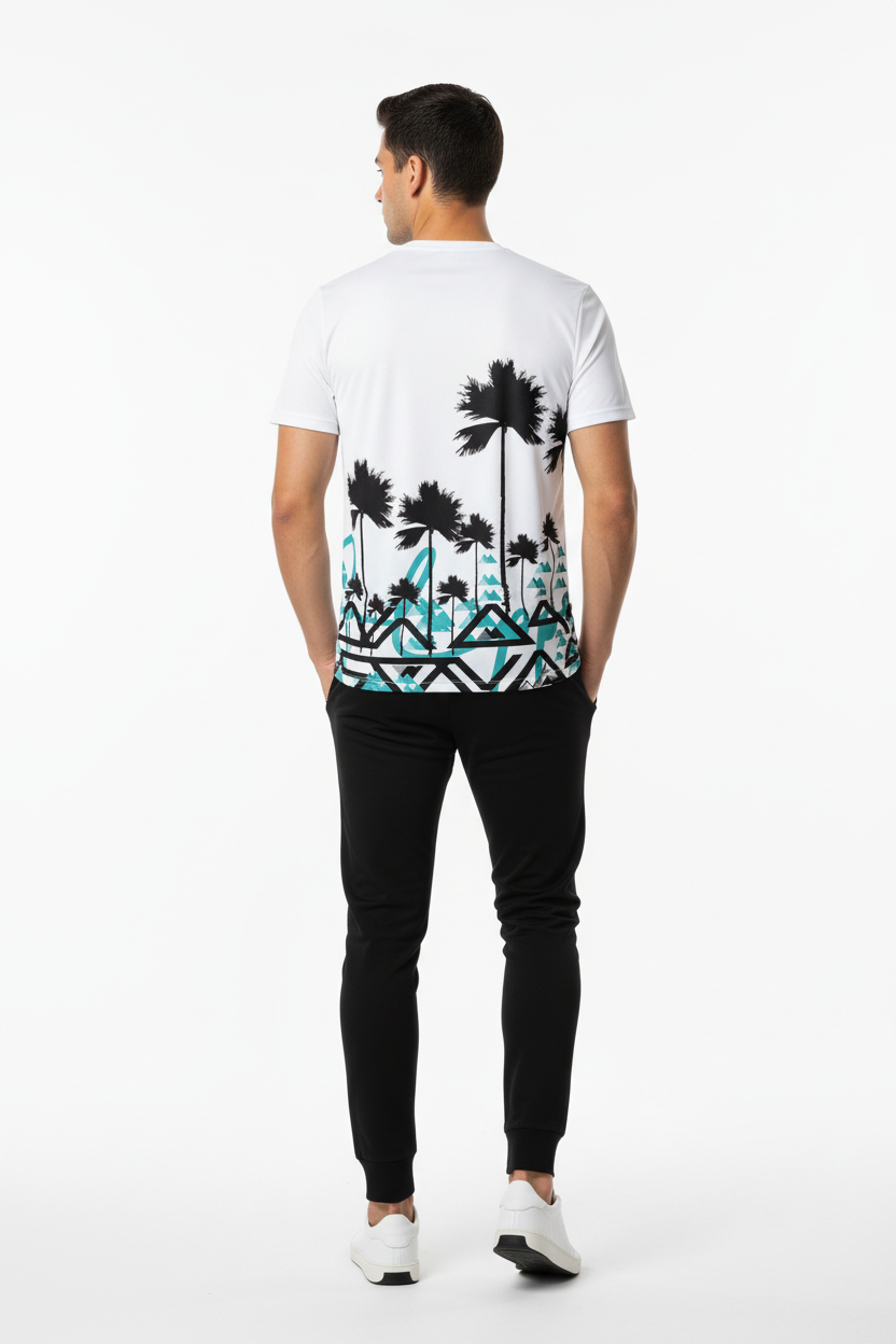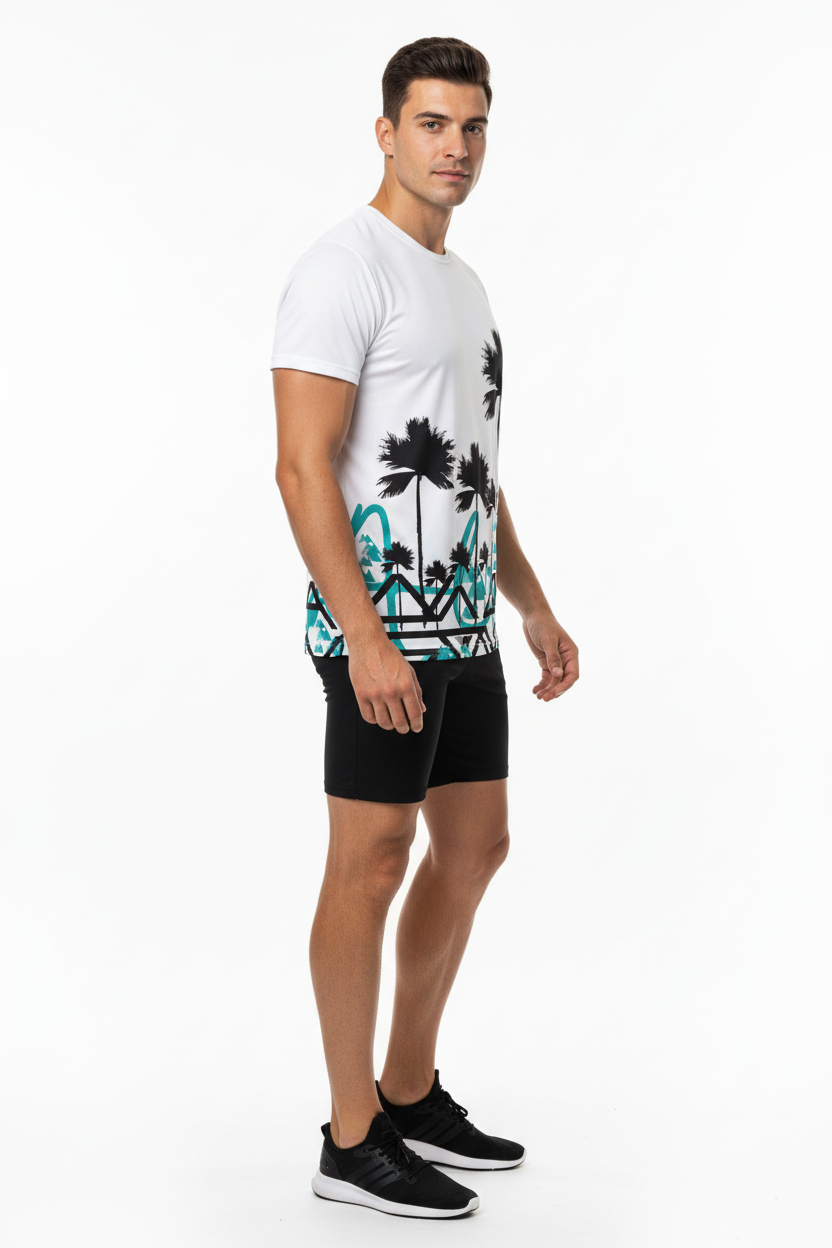 Designed for adventurers who refuse to choose between surf and summit, this athletic tee brings together two worlds in one striking design. The clean white base showcases the dramatic contrast between tropical palms and angular mountain graphics, creating a conversation-starting piece that transitions seamlessly from beach runs to mountain trails.