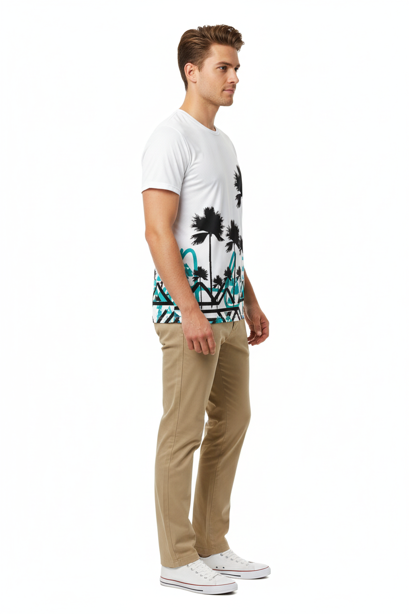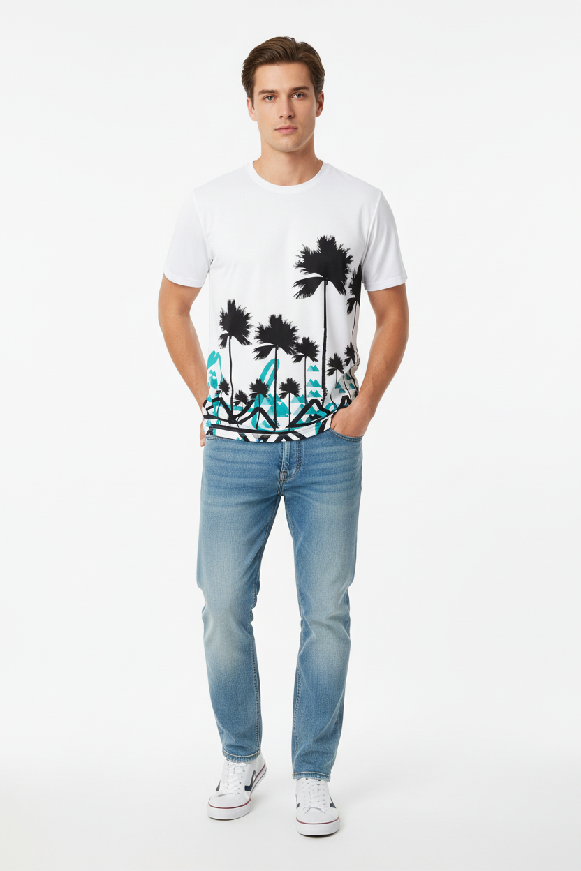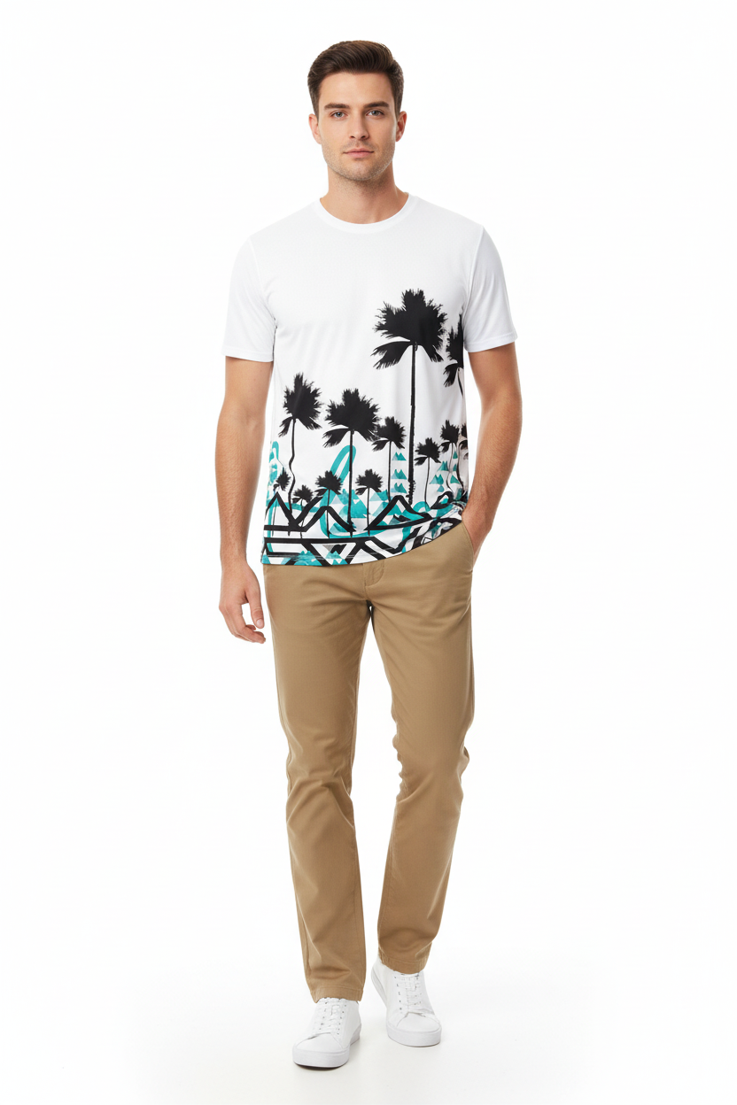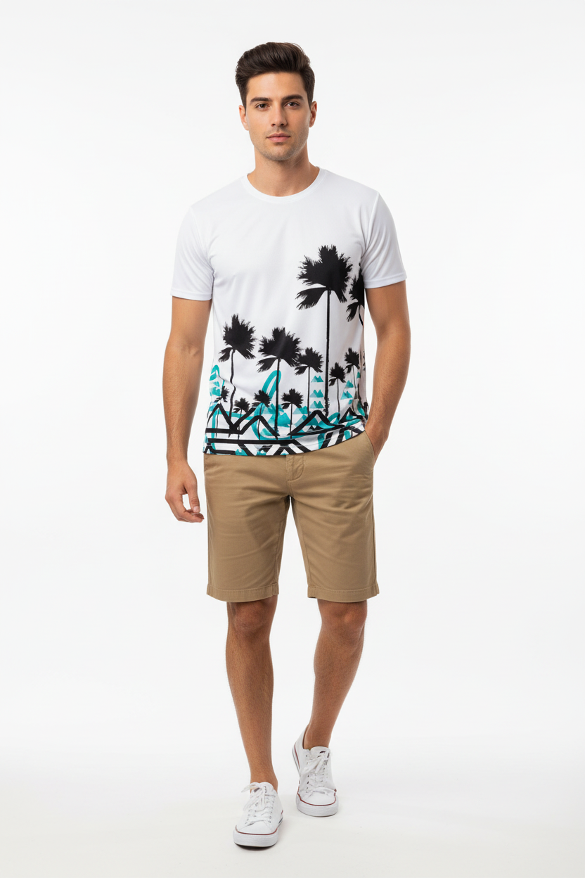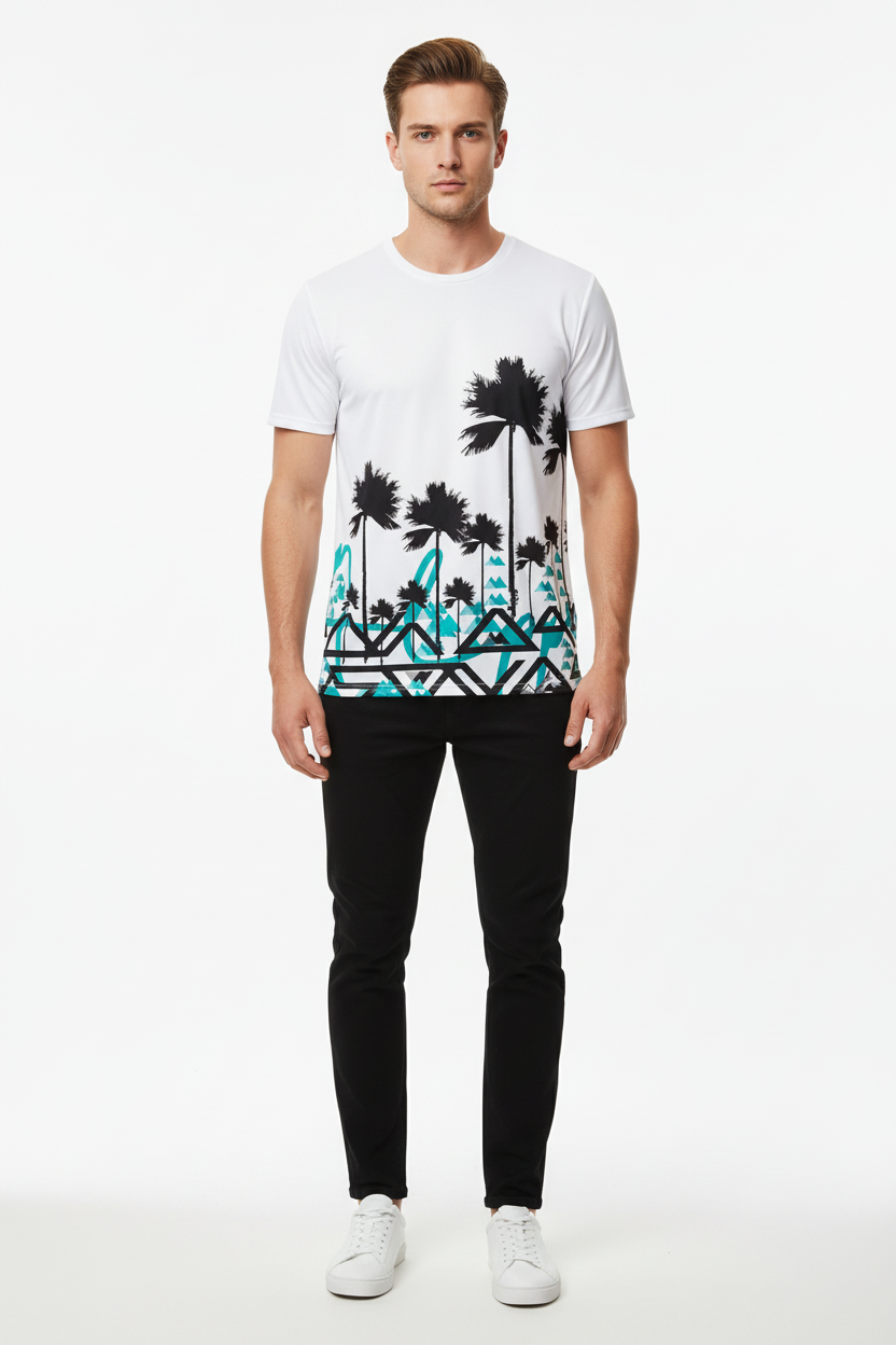 Designed for adventurers who refuse to choose between surf and summit, this athletic tee brings together two worlds in one striking design. The clean white base showcases the dramatic contrast between tropical palms and angular mountain graphics, creating a conversation-starting piece that transitions seamlessly from beach runs to mountain trails.