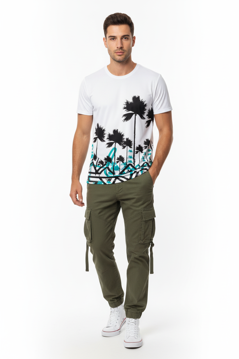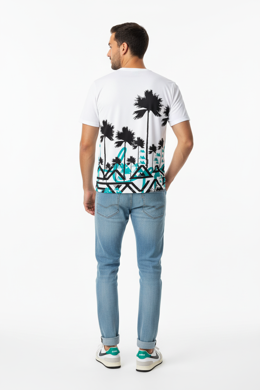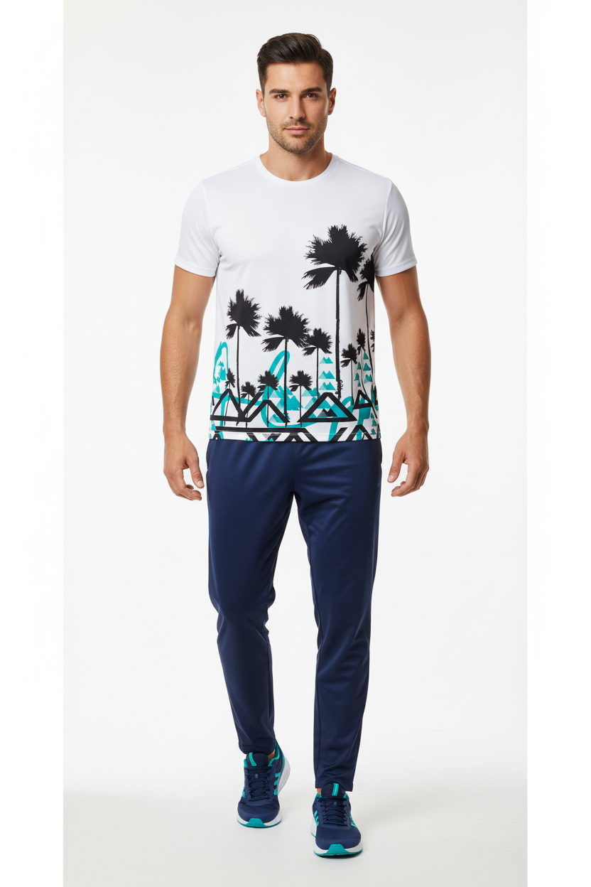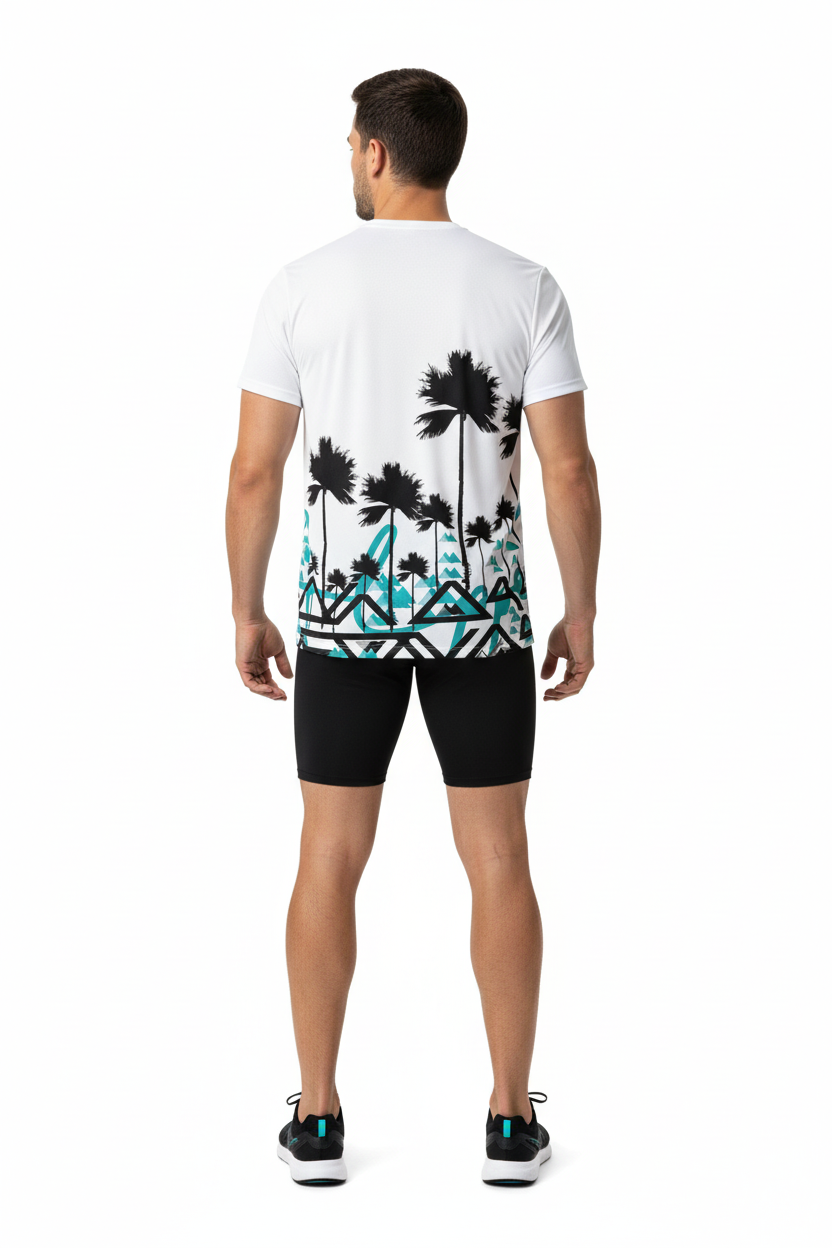 Where coastal vibes meet mountain spirit with the Palm Peaks Athletic Tee. This unique performance tee features bold black palm tree silhouettes rising above turquoise geometric mountain patterns, creating a distinctive fusion of beach and alpine aesthetics.