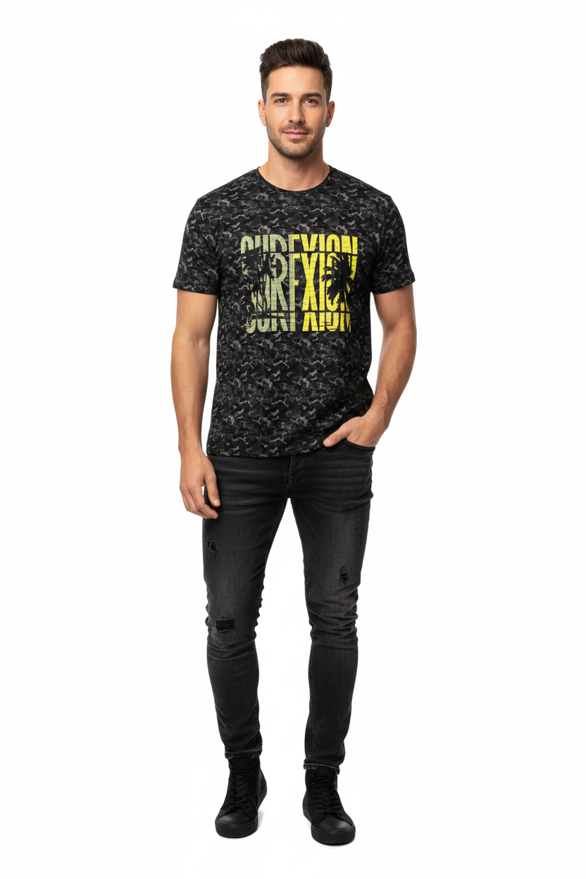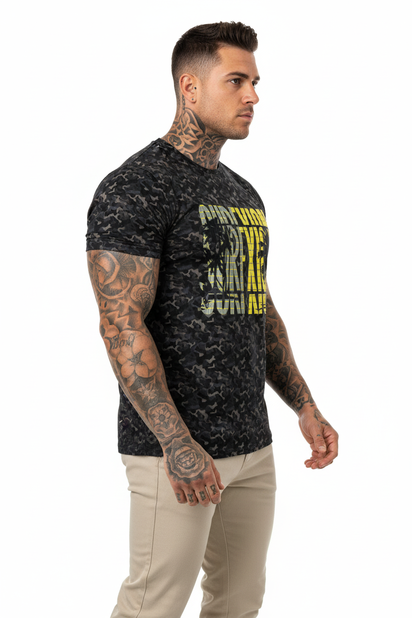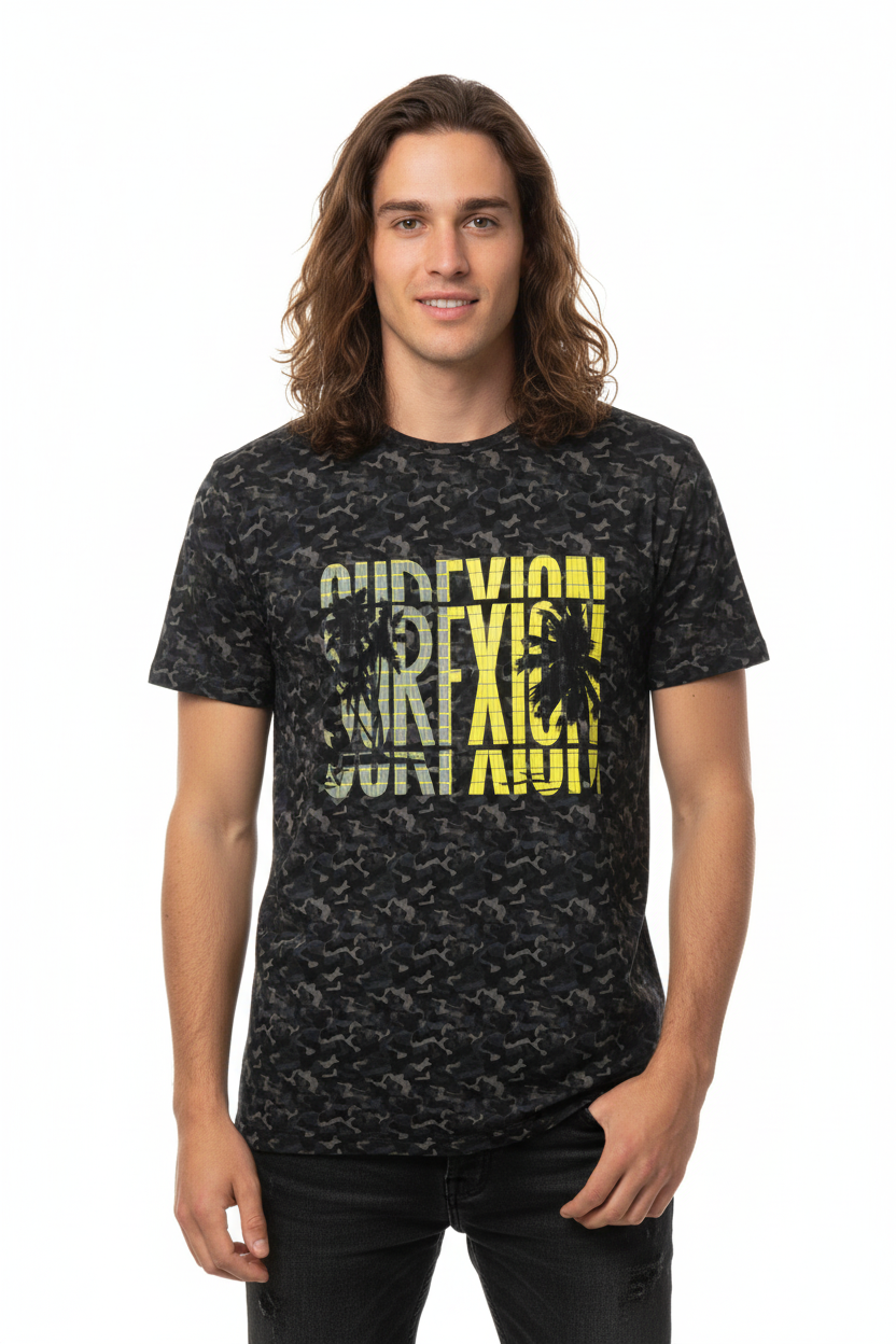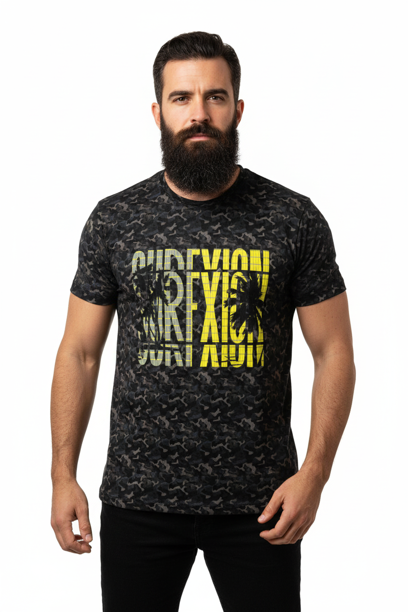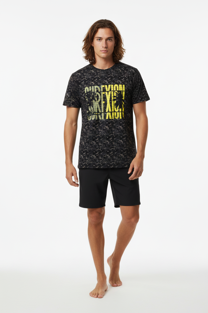 Where surf culture intersects with tactical design, the Surfxion Camo Athletic Tee showcases a bold black camouflage pattern accented by vibrant yellow "SURFXION" graphics, tailored for those who challenge boundaries both on and off the water.
