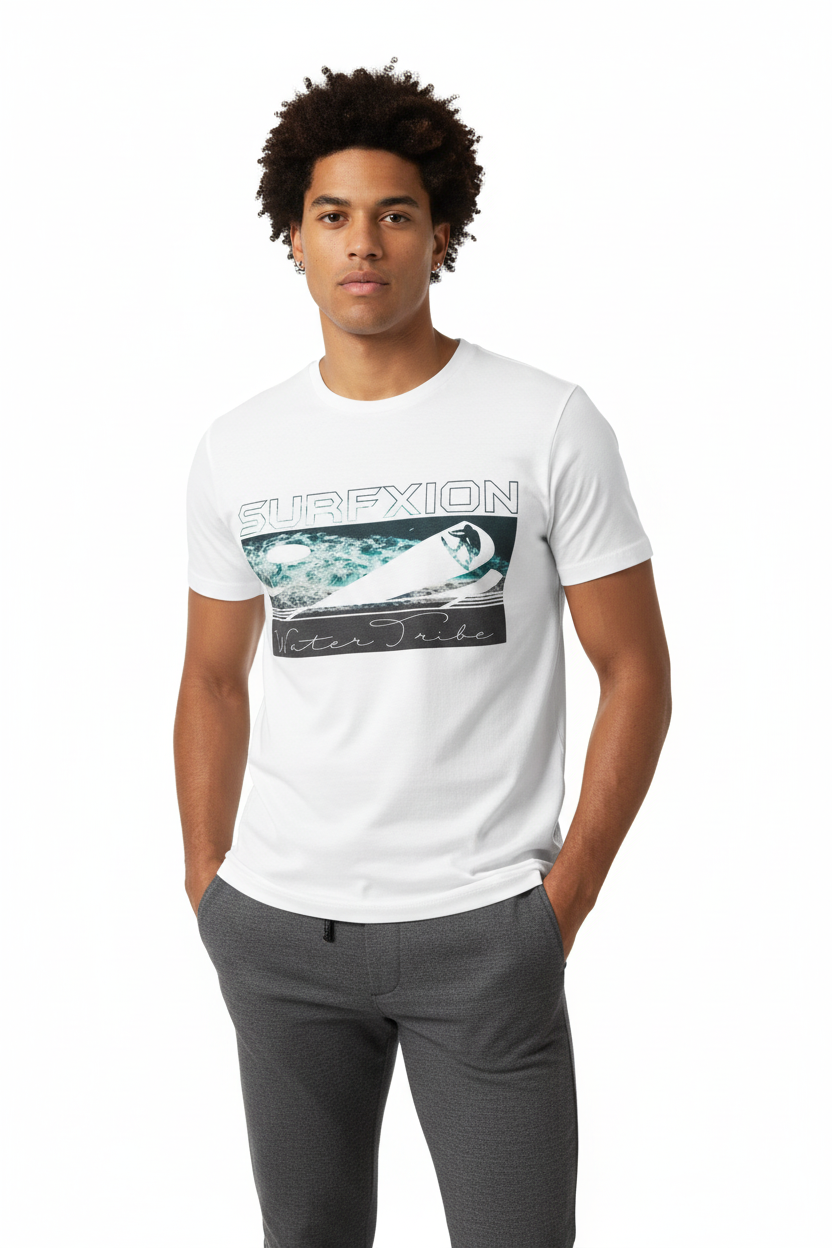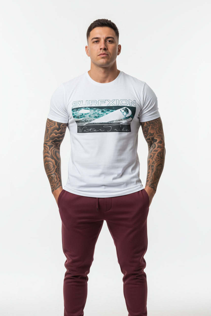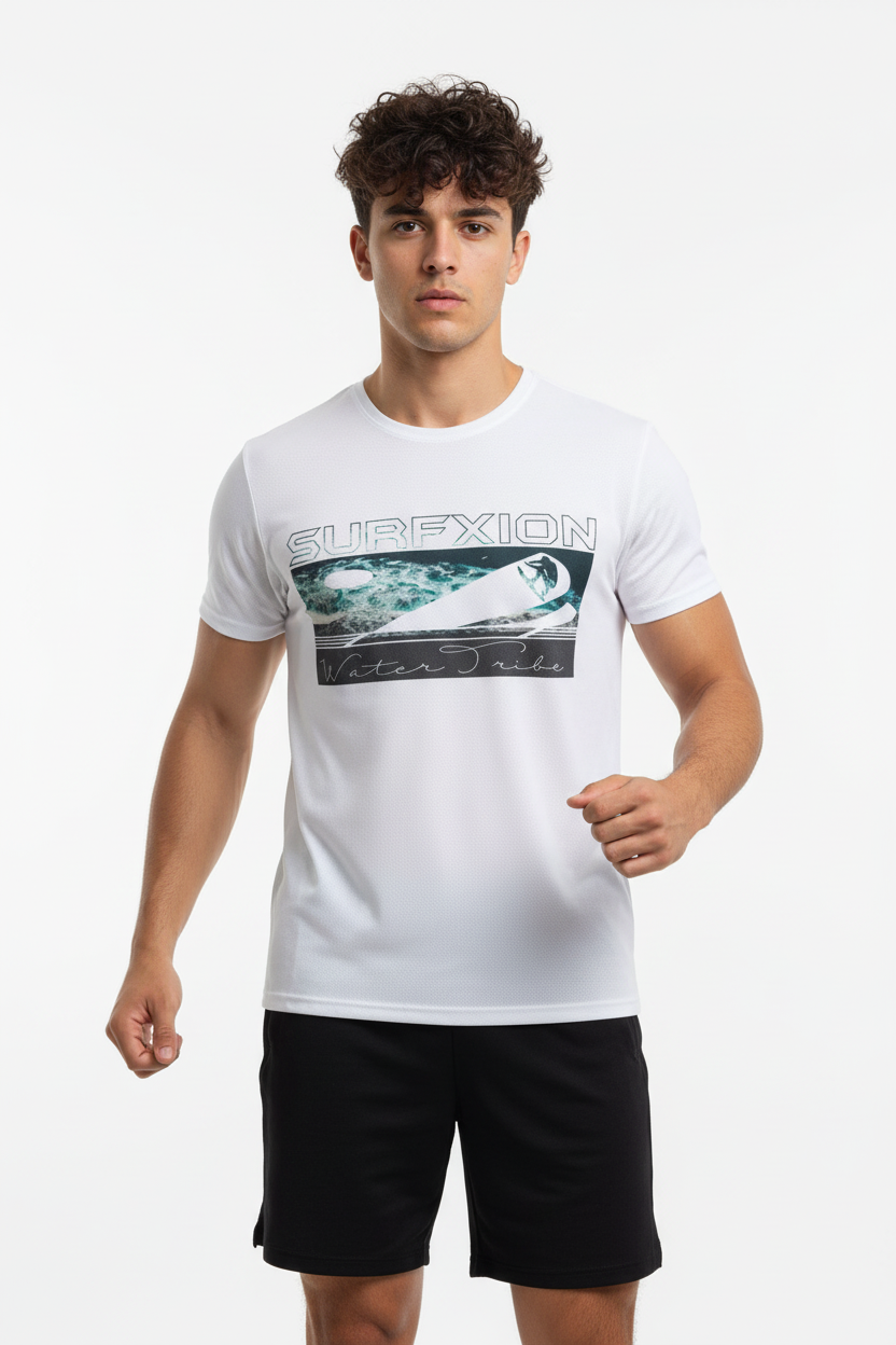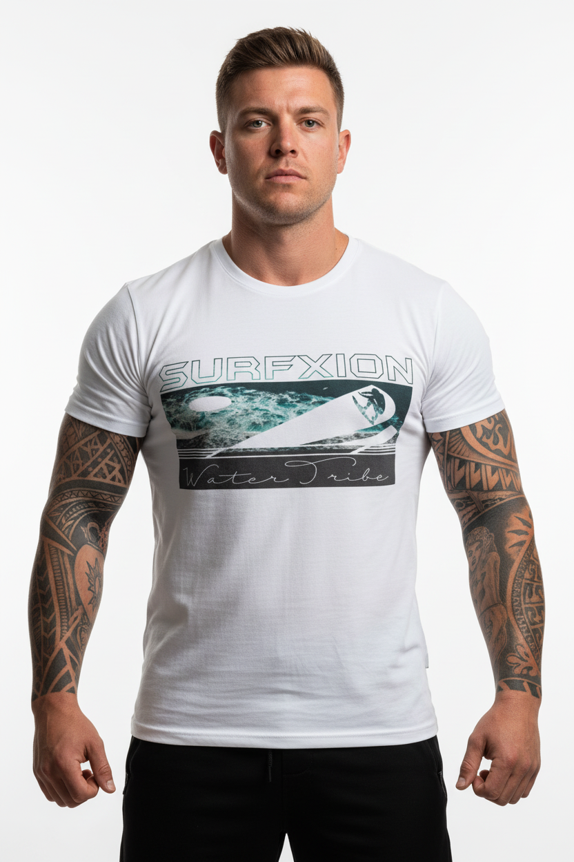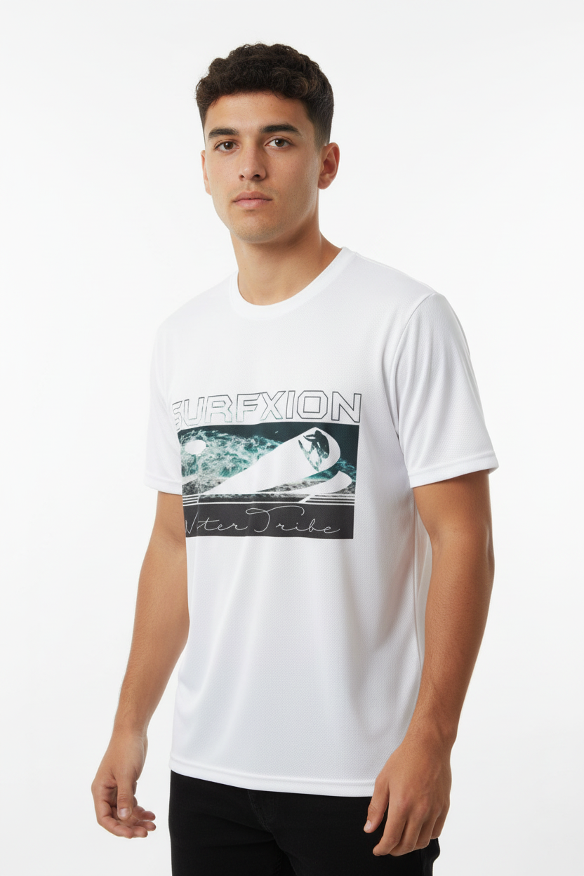 Description: Join the Water Tribe with the Surfxion Athletic Tee. Featuring the iconic ocean wave graphic with surfer silhouette and Water Tribe script on a clean white base, this performance t-shirt embodies the spirit of surf culture and coastal living.
