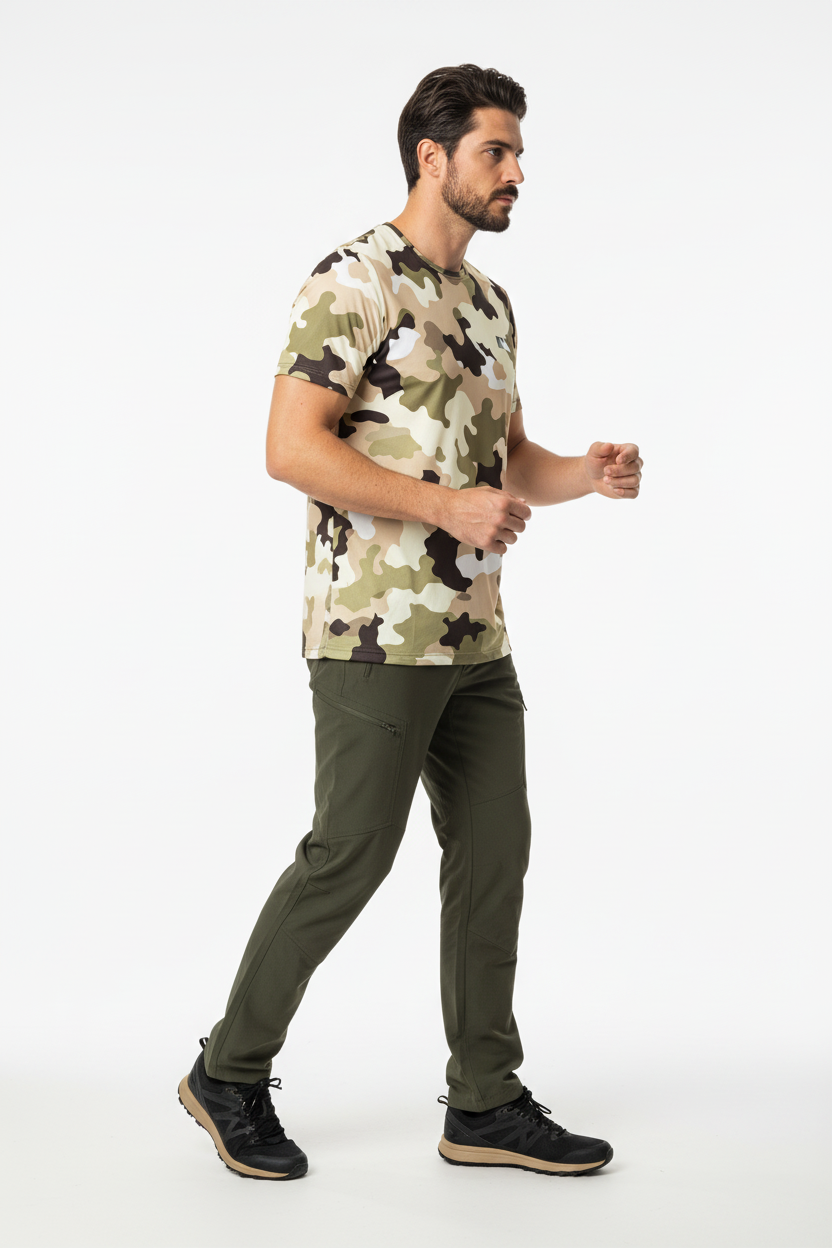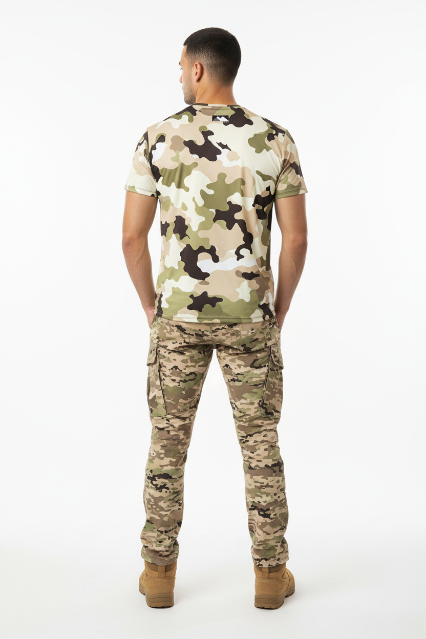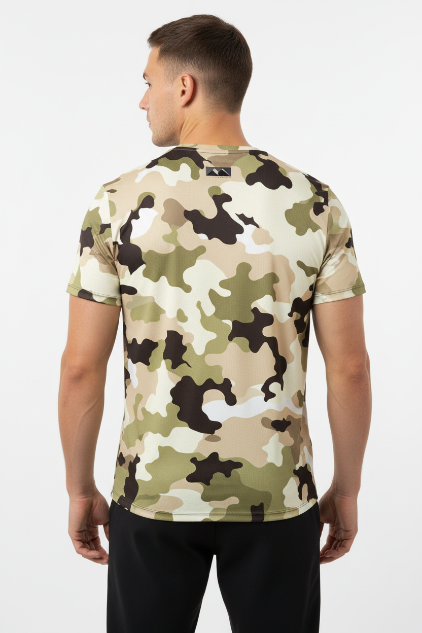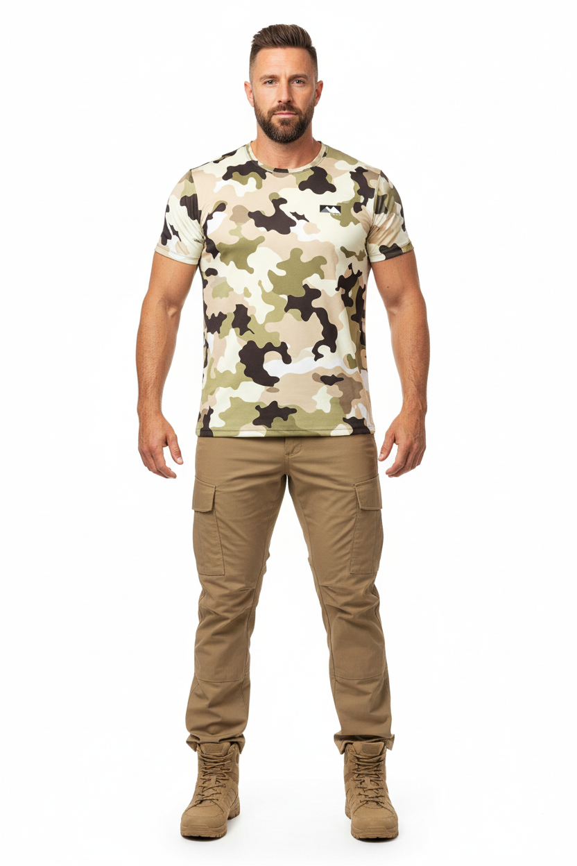 Whether you're hiking desert trails, training outdoors, or navigating urban terrain, this tactical tee delivers performance and stealth. The desert camo pattern provides natural concealment in arid environments while the athletic cut ensures you stay comfortable during high-intensity activities.