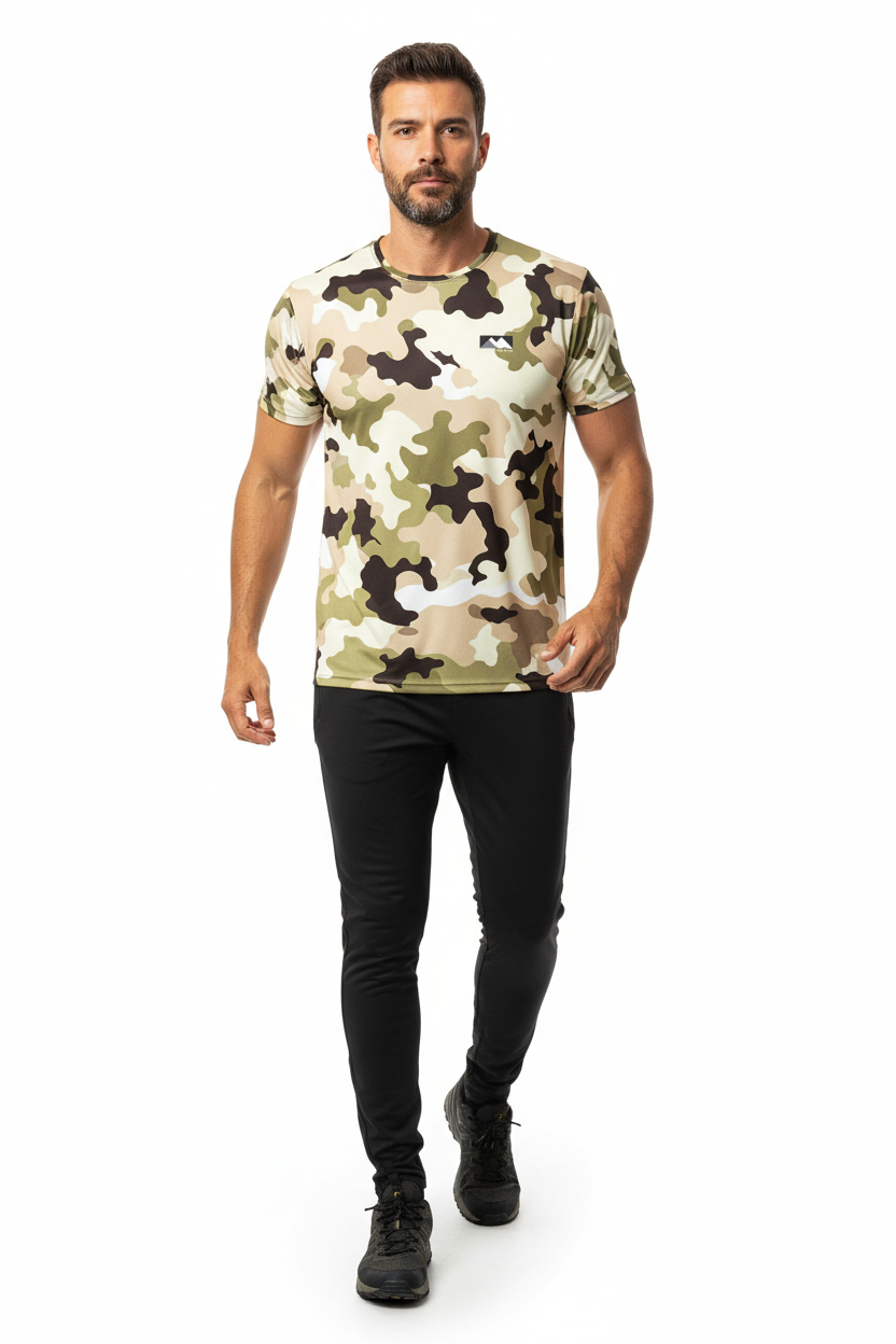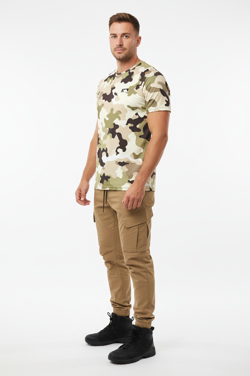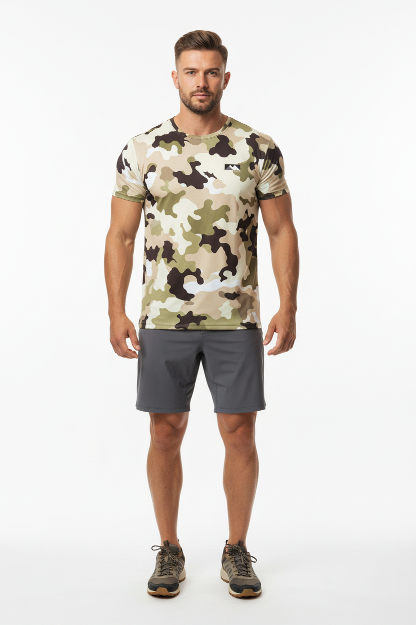 Blend into your environment with the Desert Camo Tactical Tee, featuring an authentic all-over desert camouflage pattern in tan, beige, olive green, and brown tones. This tactical-inspired performance tee combines military-grade aesthetics with athletic functionality, making it perfect for outdoor adventures, training sessions, or urban exploration.